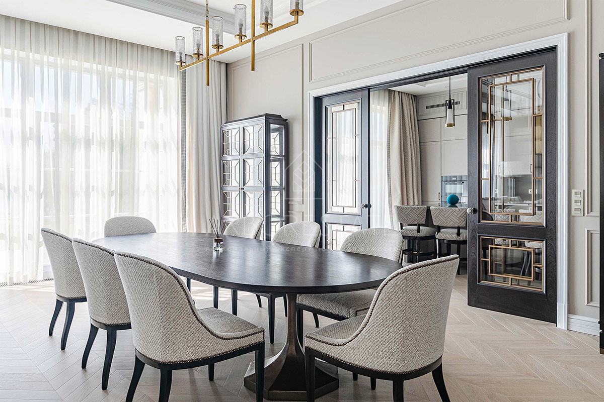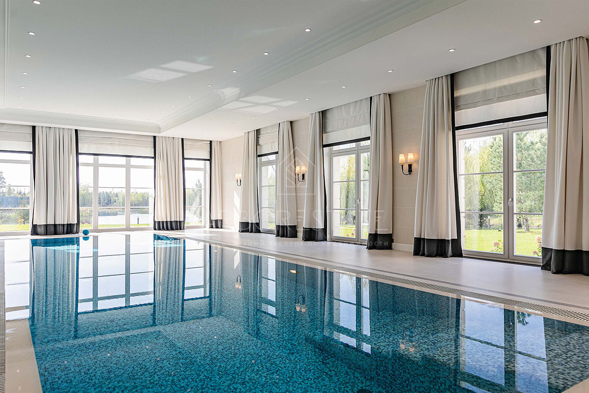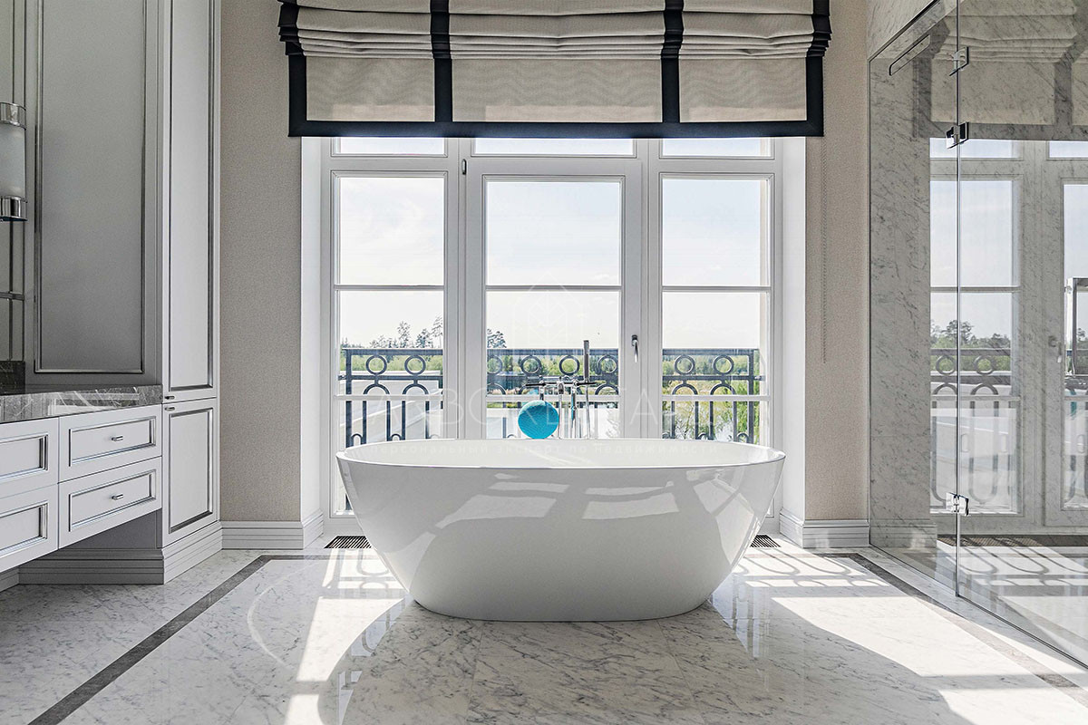 Отделка фасада выполнена из натурального камня, установлены деревянные стеклопакеты и немецкая фурнитура Siegenia. В отделке использованы: итальянский керамогранит, мрамор, инженерная доска из дуба, английская краска, дизайнерские обои, итальянская и немецкая сантехника, немецкая кухня из массива с техникой Miele и Liebherr. Применены современные решения по инженерным системам. Во всех помещениях предусмотрены приточно-вытяжная вентиляция с рекуперацией тепла, канальные кондиционеры Daikin, а также автоматическая регулировка тёплых полов и конвекторного отопления. В котельной используется надёжное немецкое оборудование производителей Tece, Oventrop, Viega, Wolf, Meibes.
