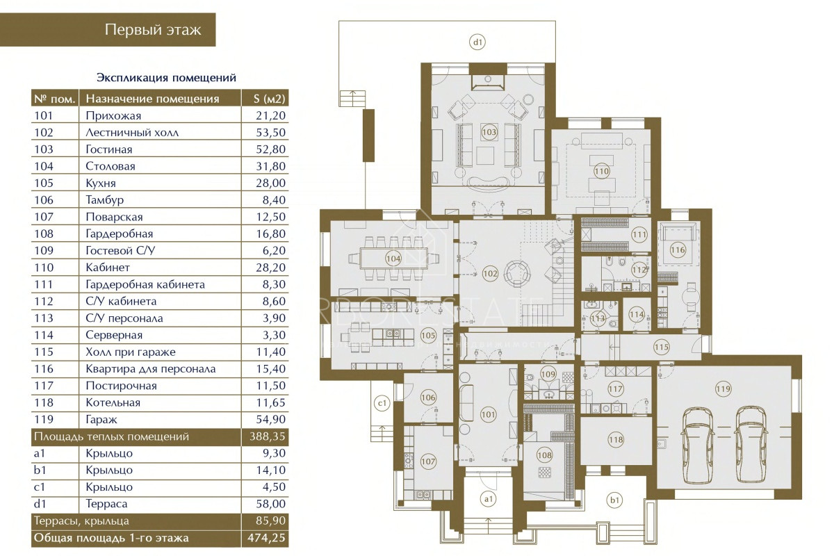 1 этаж: прихожая, 3 холла, кухня, поварская, столовая, гостиная, кабинет, гардеробная, тамбур, 3 санузла, серверная, комната-кухня для персонала, постирочная, котельная, гараж на 2 м/м;