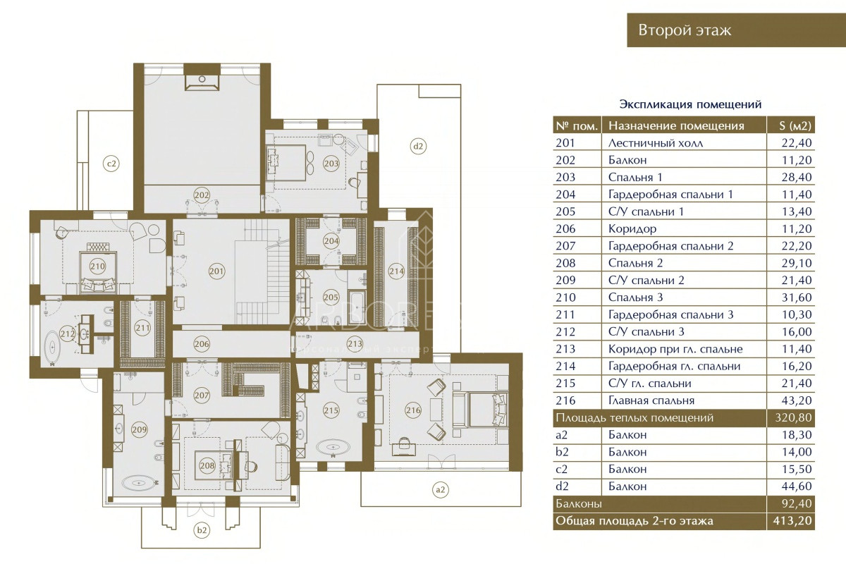 2 этаж: холл, 4 спальни, 4 санузла, 4 гардеробных, балкон, 2 коридора.