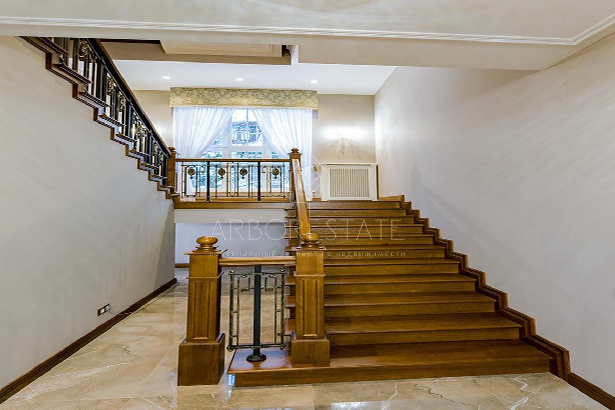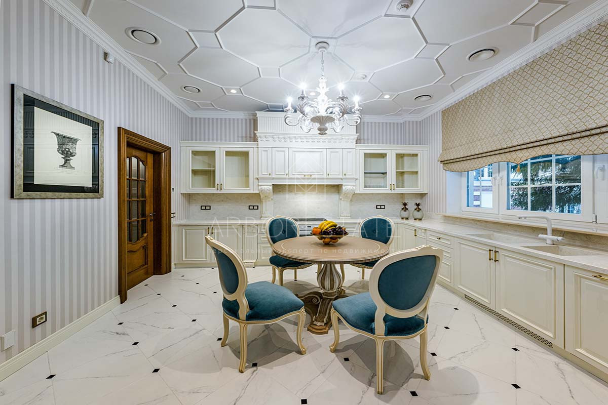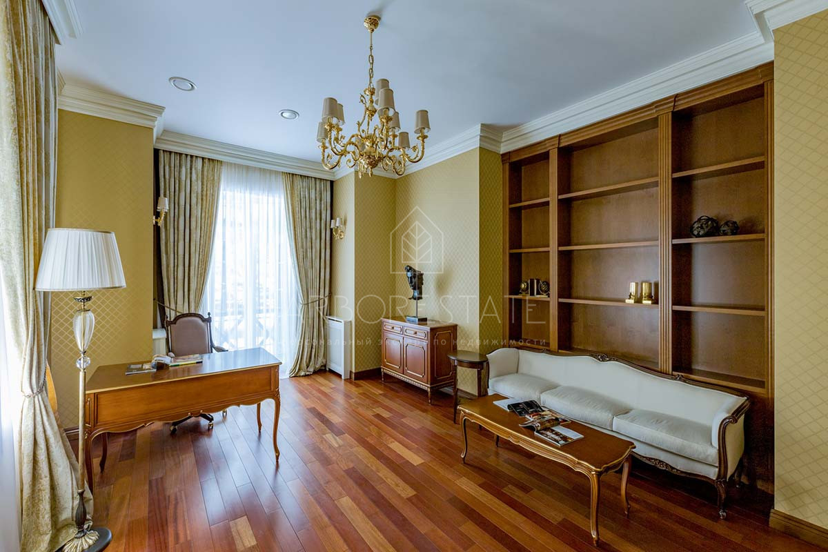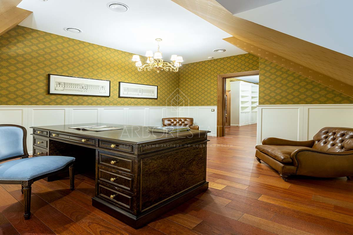 Отделка дома уникальна, выполнена по индивидуальному дизайн проекту. В отделке использованы материалы премиум класса. Удобная планировка создаёт атмосферу уюта домашнего проживания и функциональности помещений. В доме расположились гостиная с камином, столовая с выходом на приватную террасу, кухня, четыре спальных комнаты со своими санузлами, 2 гардеробные, кабинет, бильярдная, библиотека со стрельчатым потолком, зона SPA с сауной, есть подсобные помещения, постирочная. В доме гараж на 2 машиноместа.