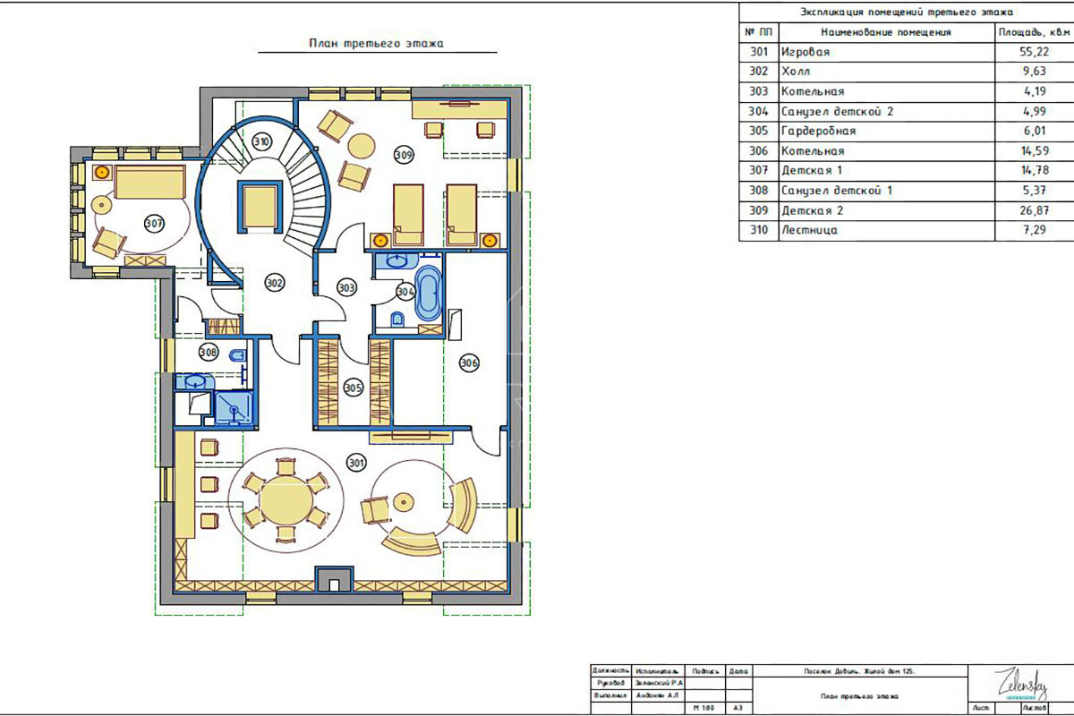 3 этаж: холл, просторная игровая, котельная, детская комната с гардеробной и ванной комнатой, детская комната, санузел, техническая комната;