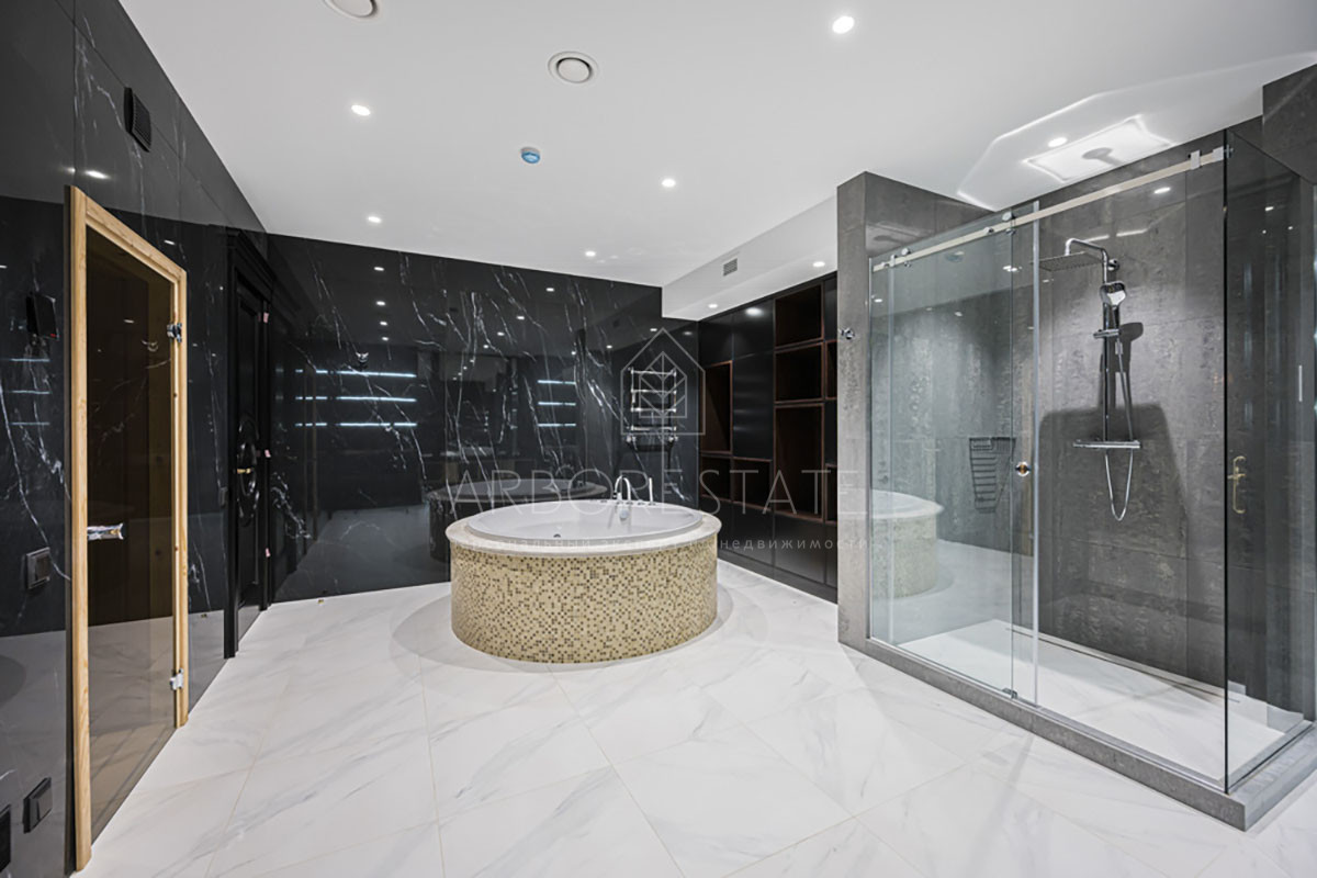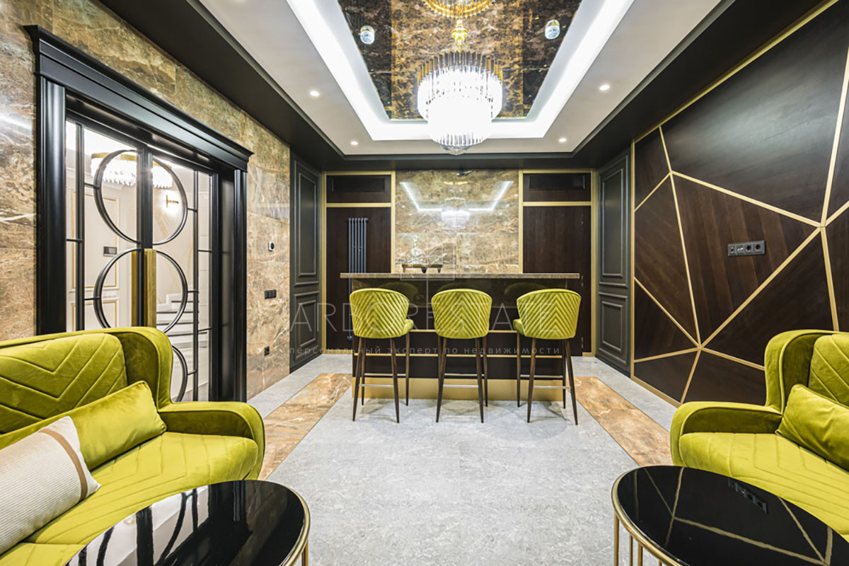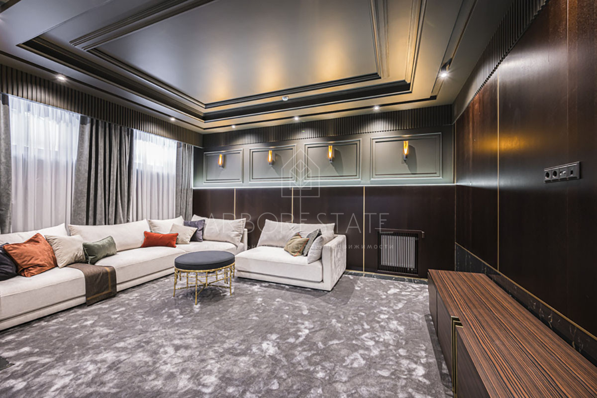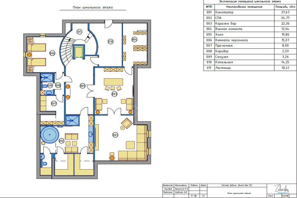 Цокольный этаж: холл, домашний кинотеатр, зона СПА с джакузи, караоке бар, винная комната, холл, комната персонала, санузел, прачечная, котельная.