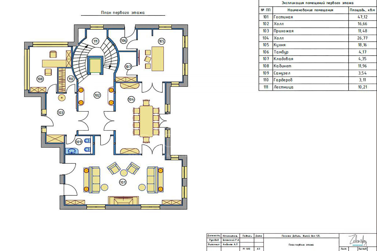 1 этаж: прихожая, холл, гостиная, кухня, кладовая, кабинет, санузел, гардероб;
