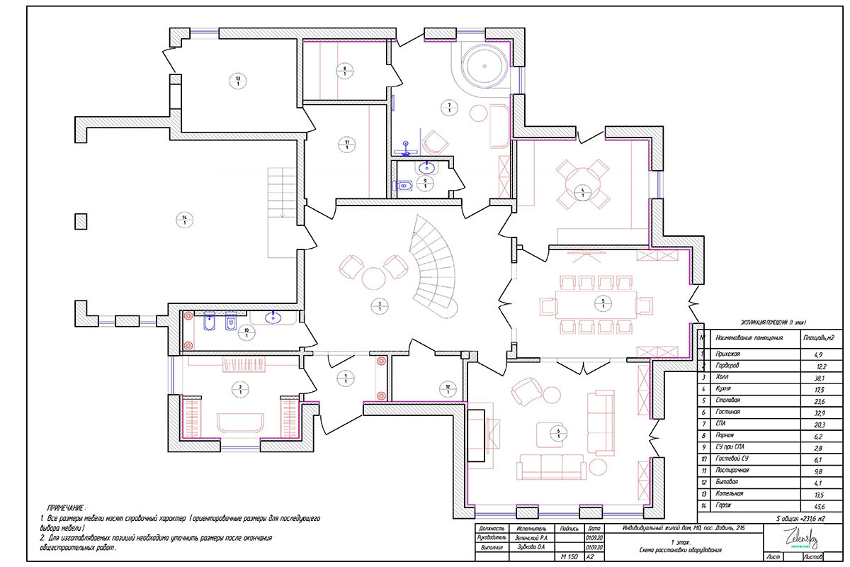 1 этаж: прихожая с гардеробом, холл, гостиная, столовая, кухня, зона СПА, санузел, постирочная, гараж на 2 машины;