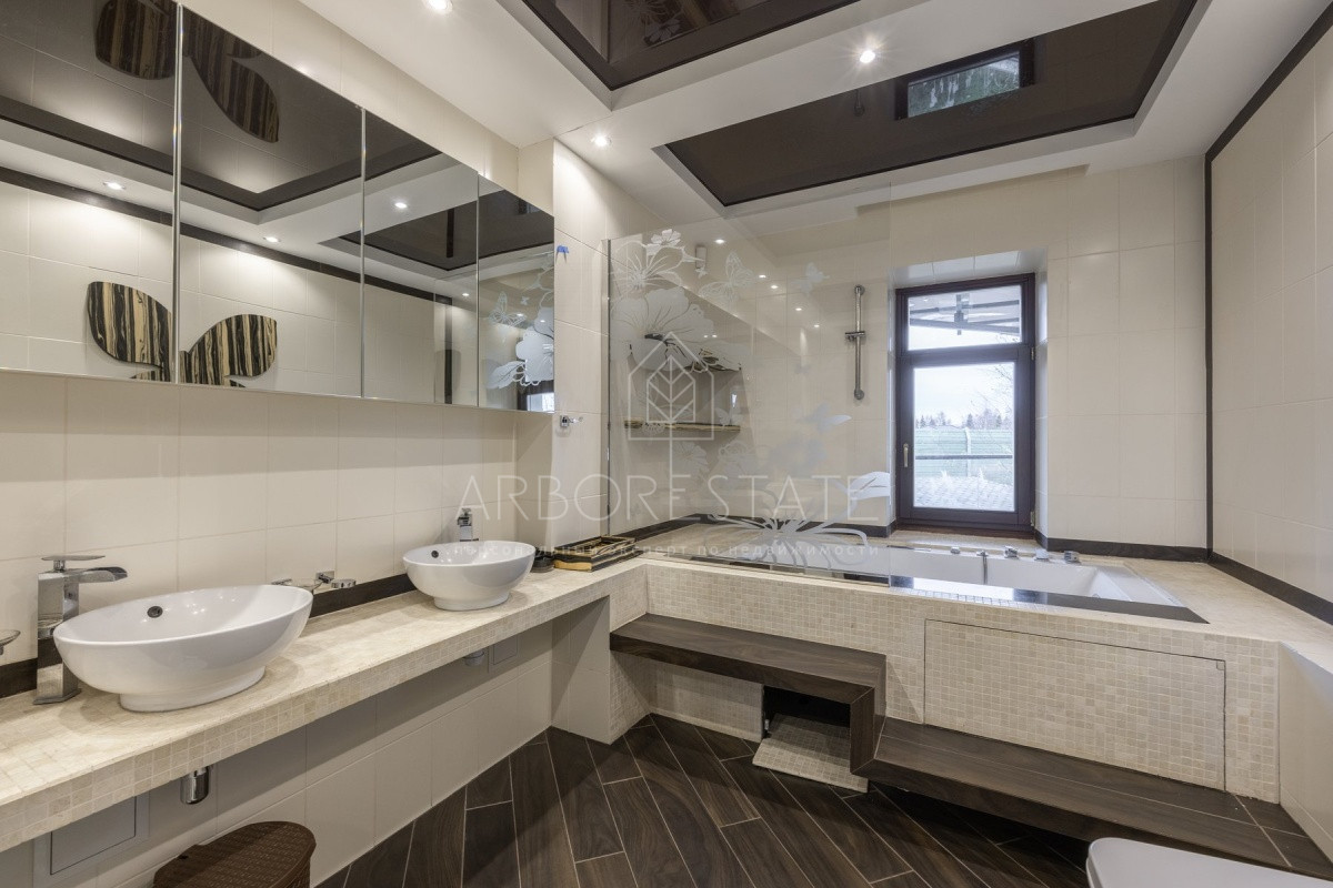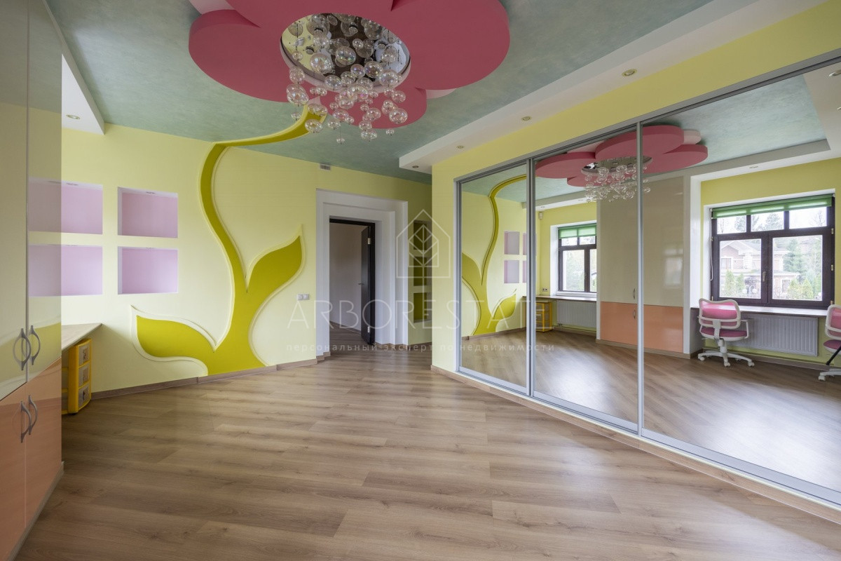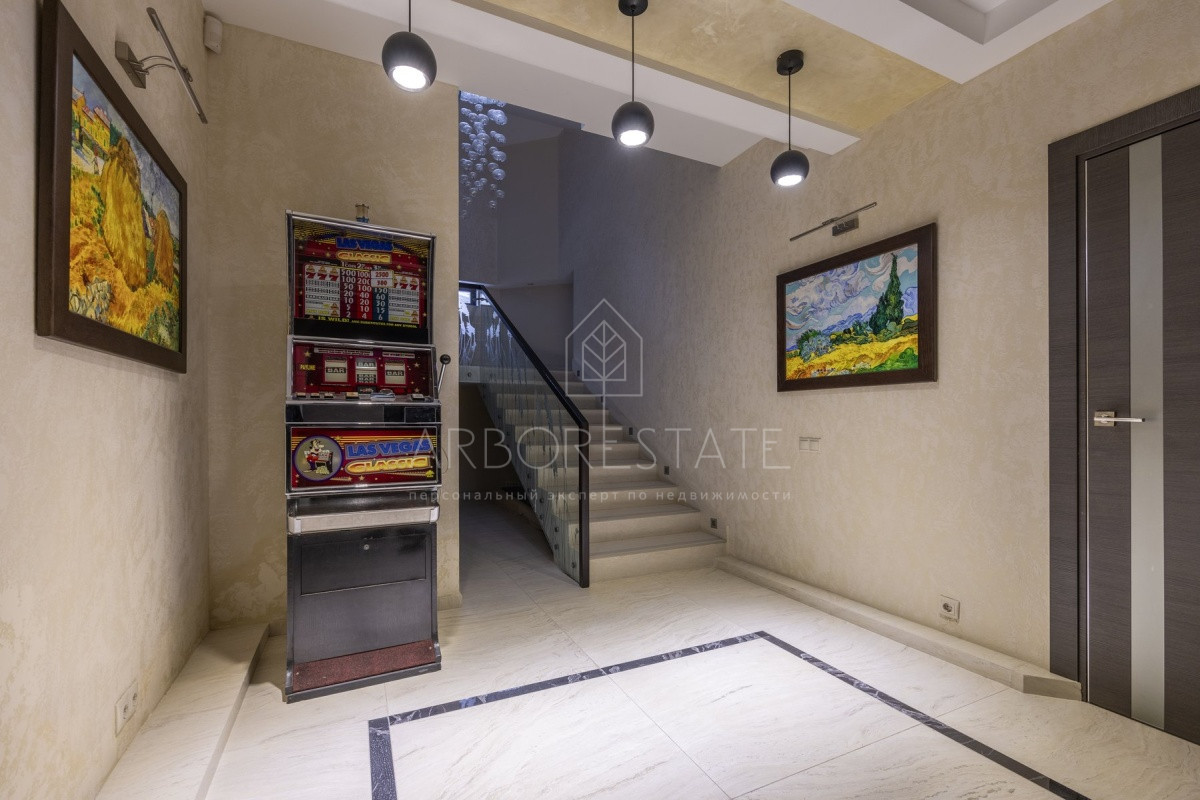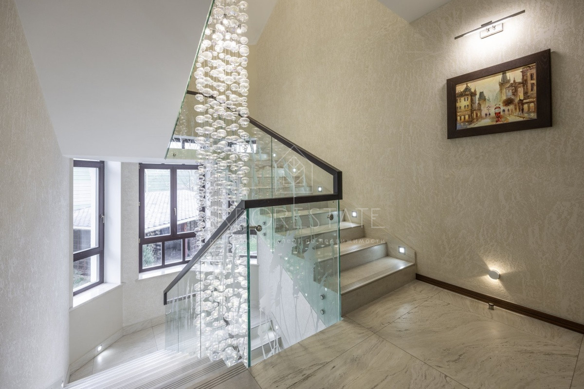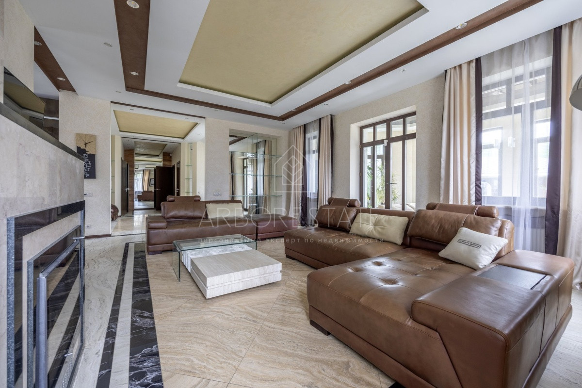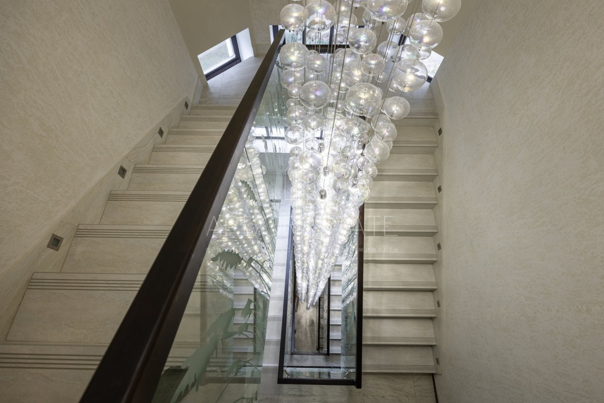 Спальные зоны организованы по принципу suit: в каждой есть своя гардеробная и санузел. На 1 этаже: прихожая, гостиная с камином, столовая-кухня, гостевая спальня (также подойдёт для родителей в возрасте), кабинет, зимний сад, спортзал, кинотеатр, SPA - зона, котельная (обрудование Buderus). Есть помещение для персонала с кухней, санузлом, спальней. В доме установлена охранная сигнализация и видеонаблюдение, смонтированы теплые полы.