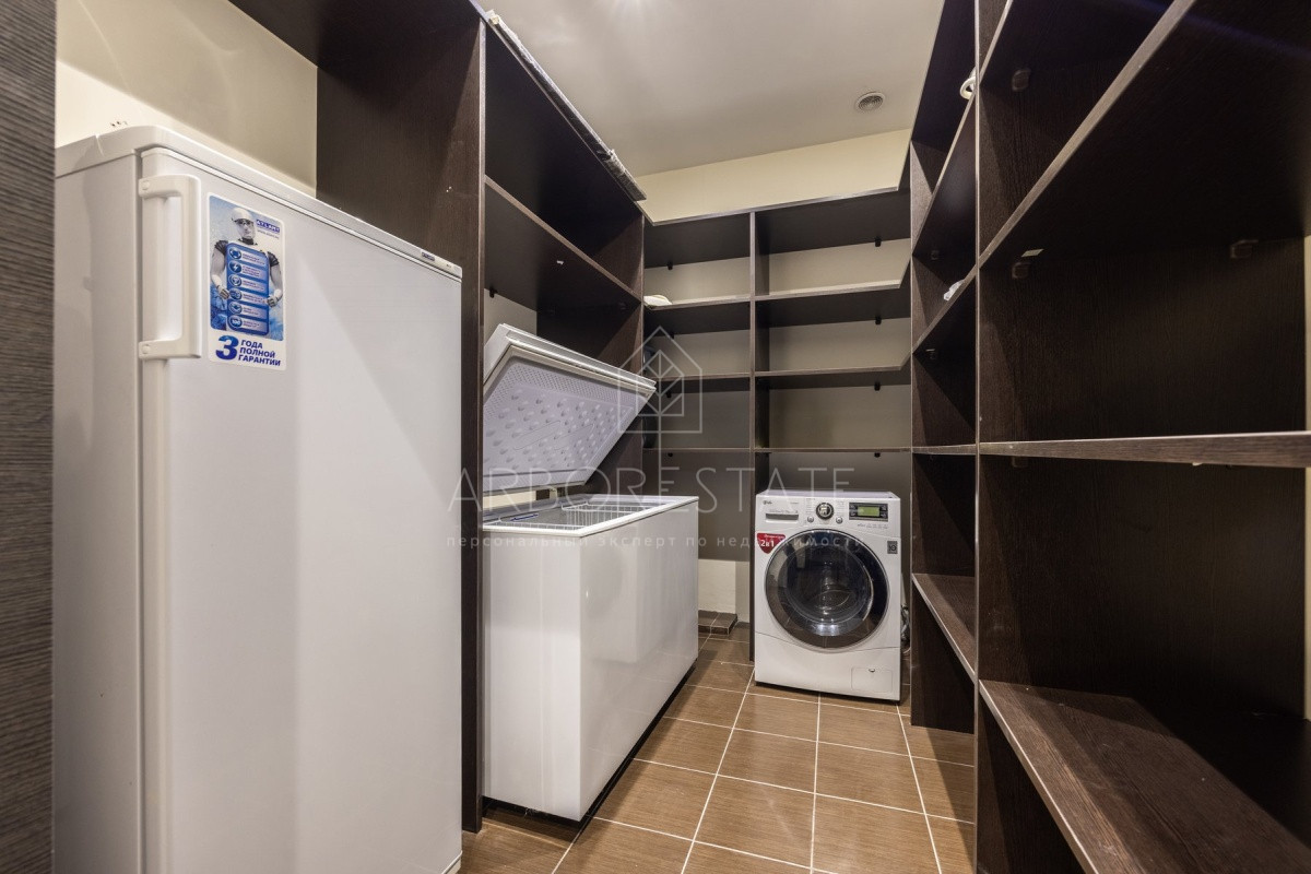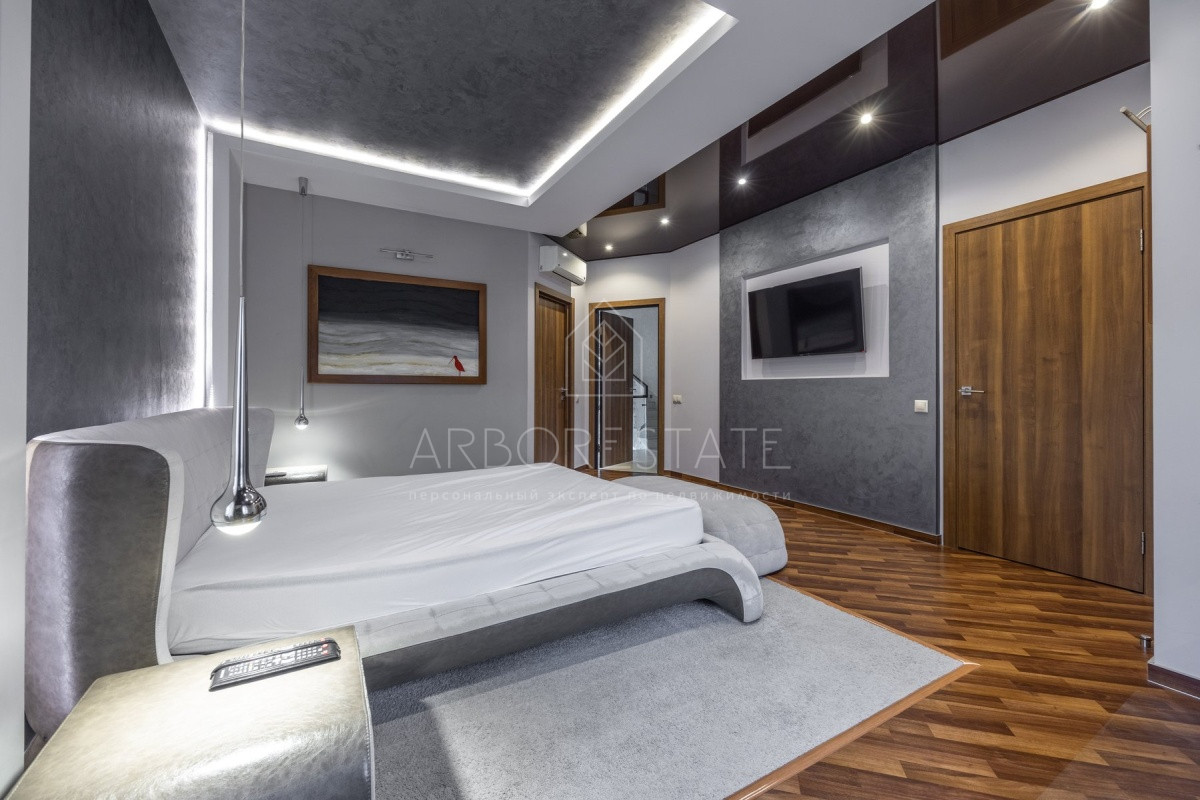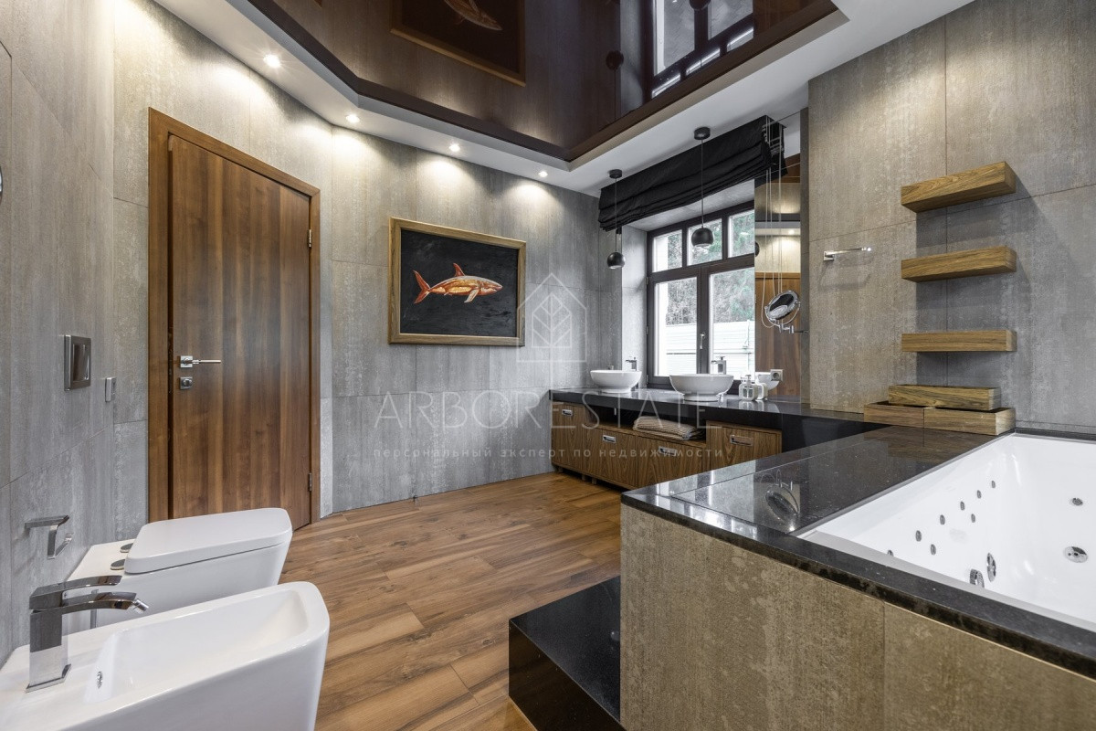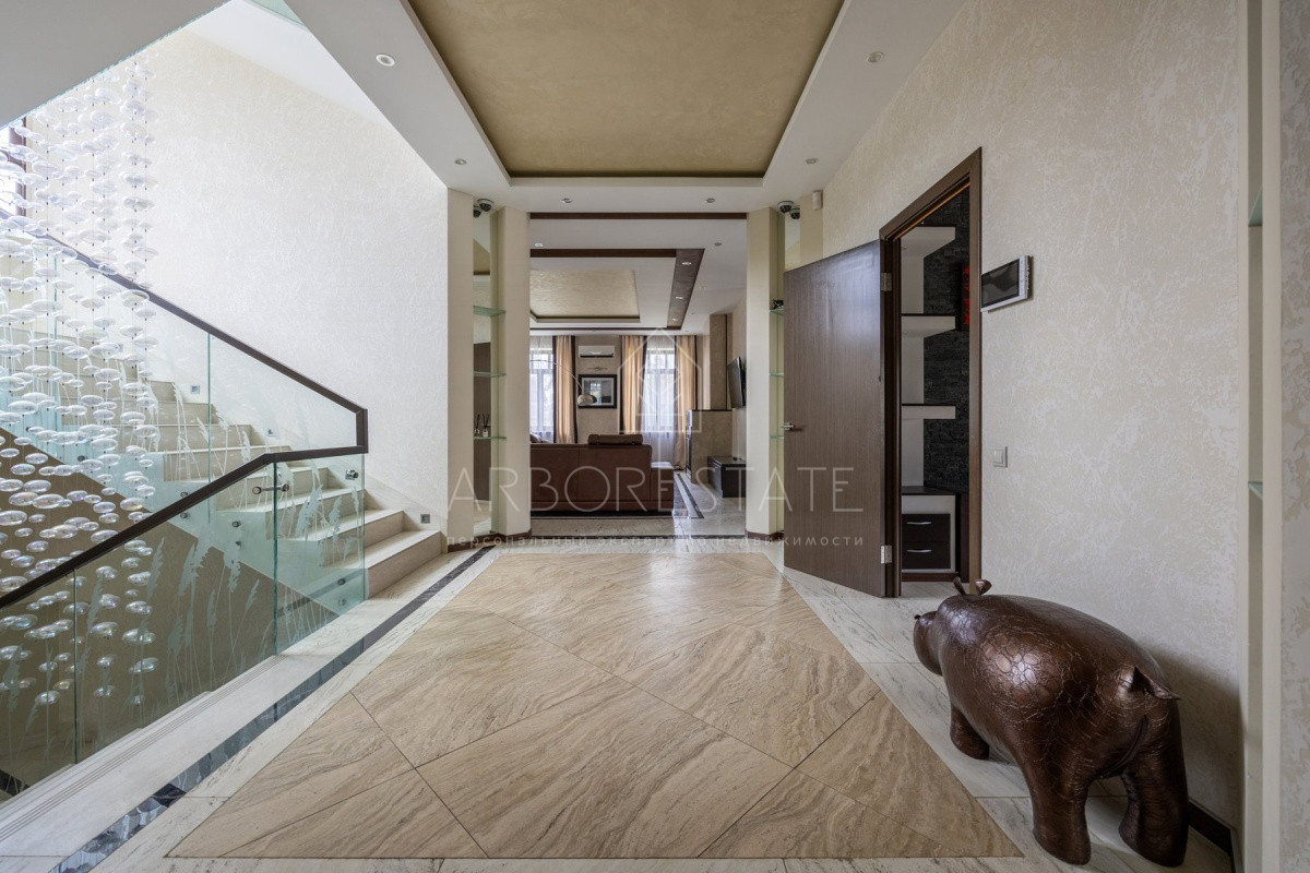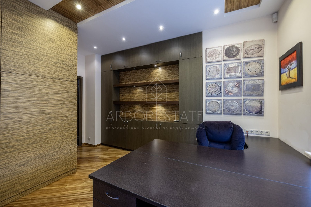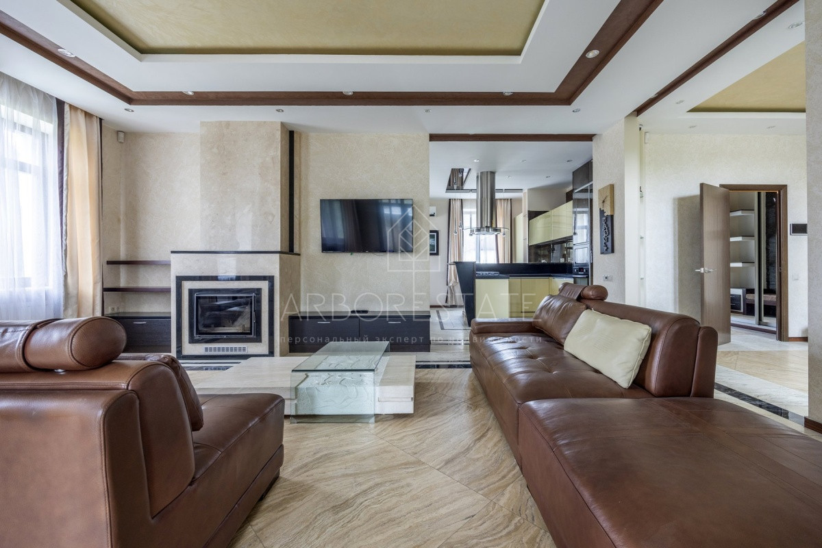 Спальные зоны организованы по принципу suit: в каждой есть своя гардеробная и санузел. На 1 этаже: прихожая, гостиная с камином, столовая-кухня, гостевая спальня (также подойдёт для родителей в возрасте), кабинет, зимний сад, спортзал, кинотеатр, SPA - зона, котельная (обрудование Buderus). Есть помещение для персонала с кухней, санузлом, спальней. В доме установлена охранная сигнализация и видеонаблюдение, смонтированы теплые полы.