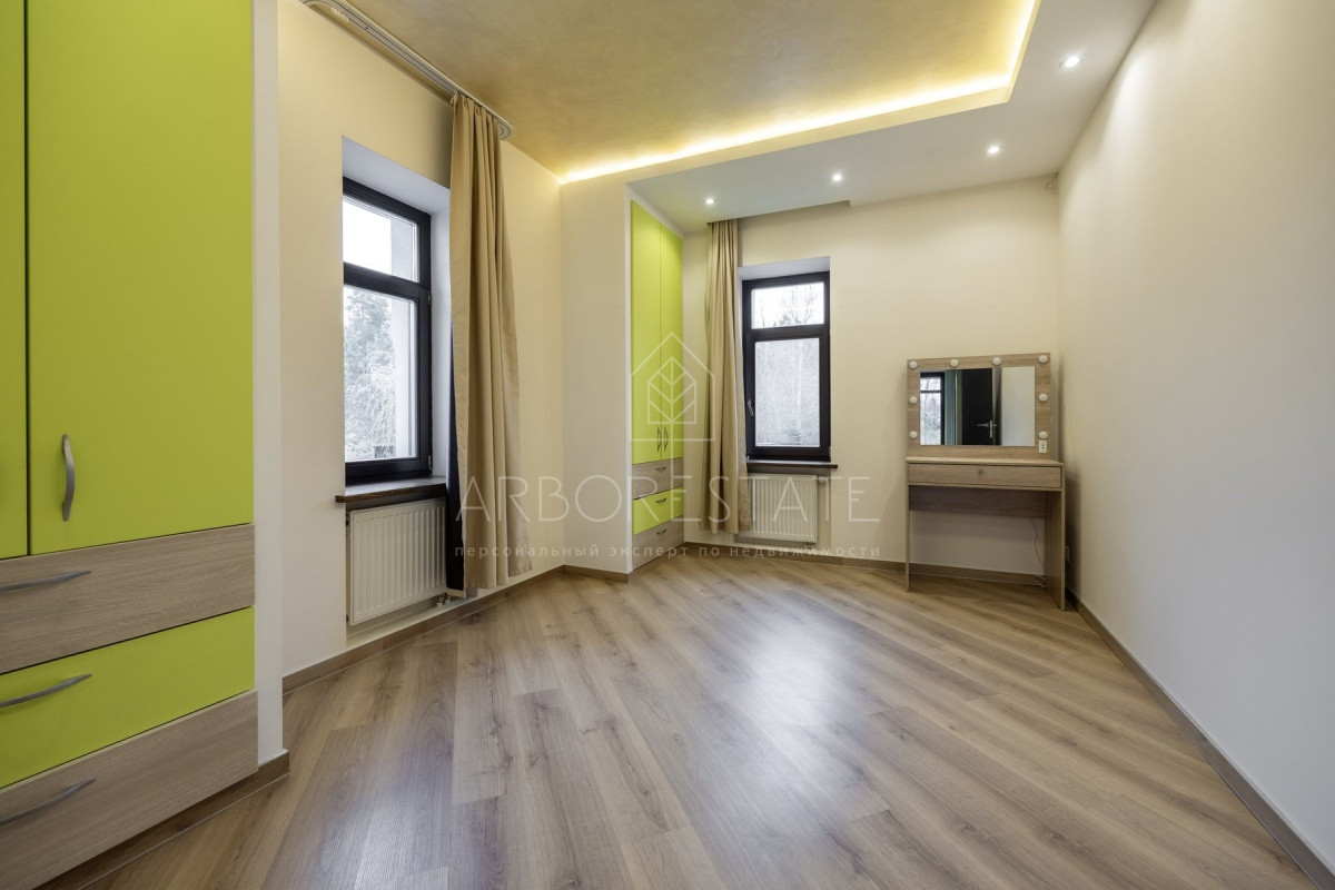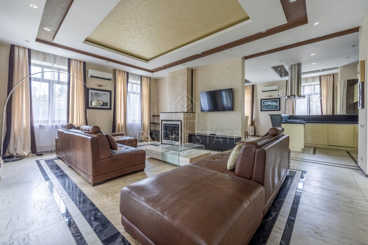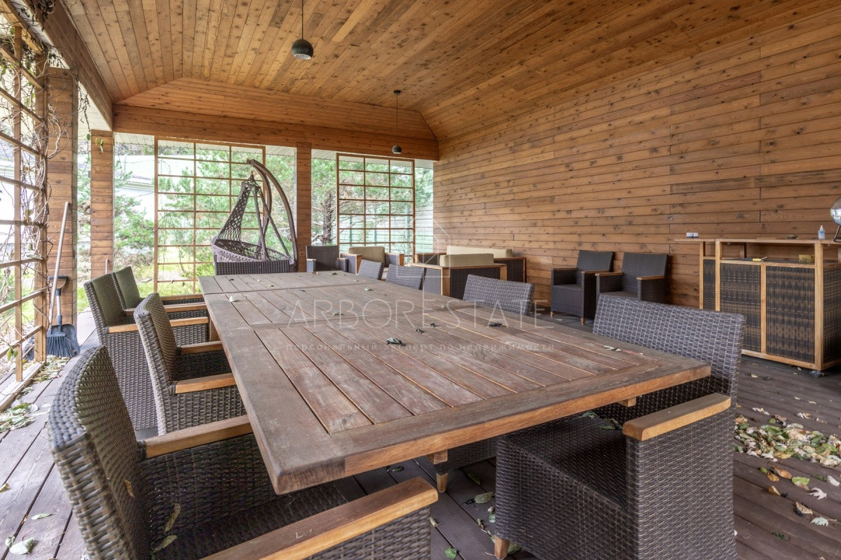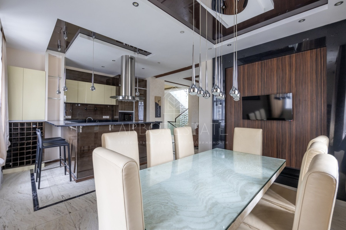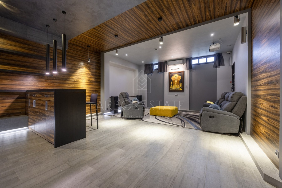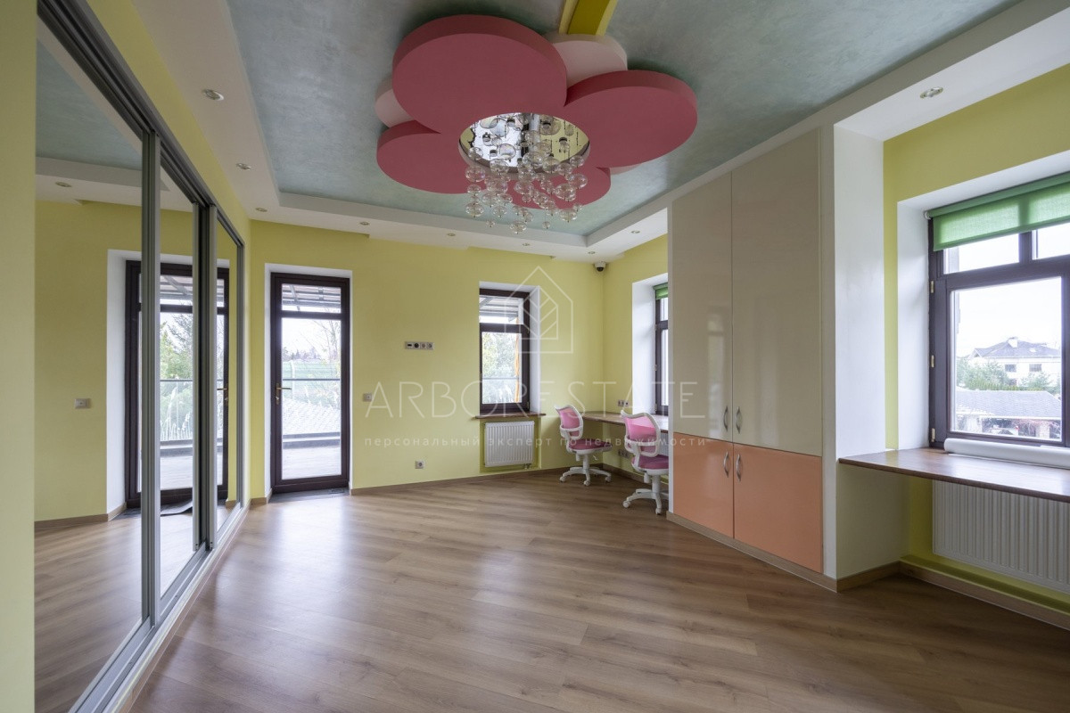 Спальные зоны организованы по принципу suit: в каждой есть своя гардеробная и санузел. На 1 этаже: прихожая, гостиная с камином, столовая-кухня, гостевая спальня (также подойдёт для родителей в возрасте), кабинет, зимний сад, спортзал, кинотеатр, SPA - зона, котельная (обрудование Buderus). Есть помещение для персонала с кухней, санузлом, спальней. В доме установлена охранная сигнализация и видеонаблюдение, смонтированы теплые полы.