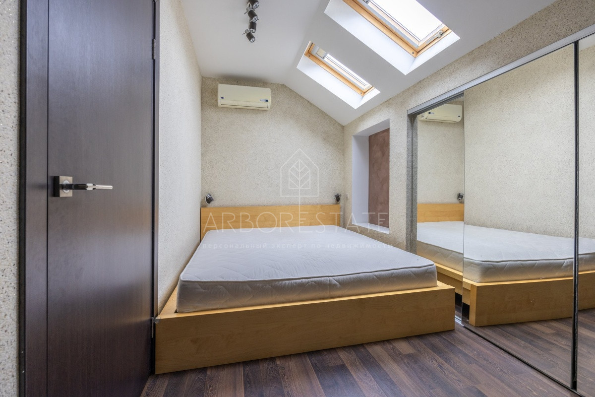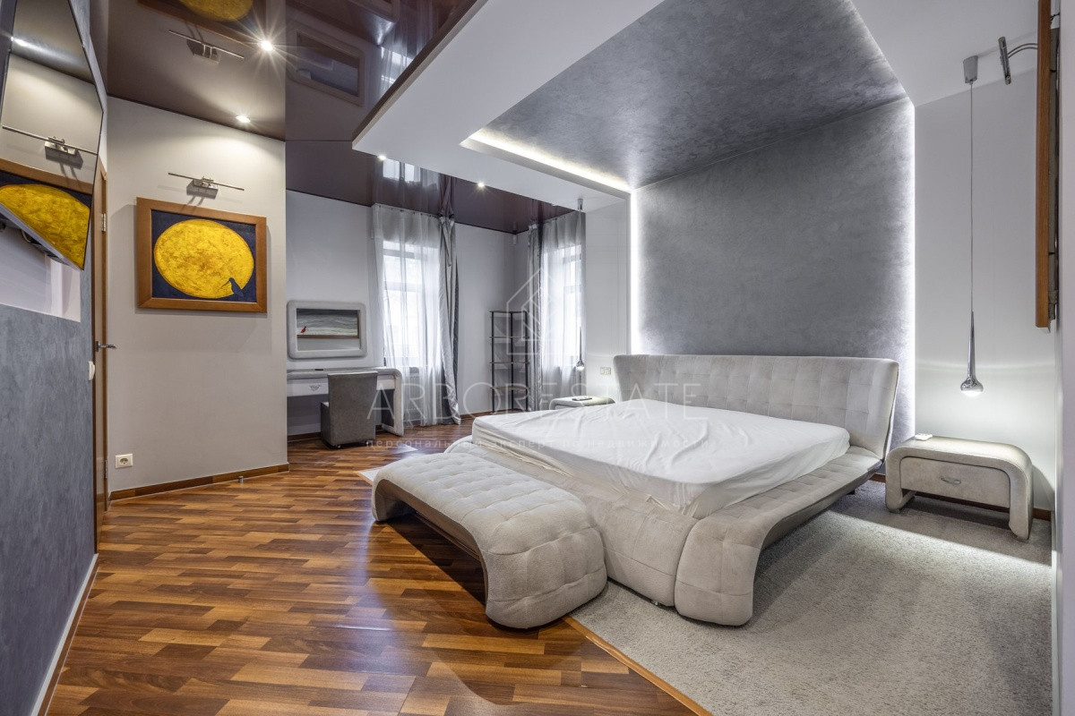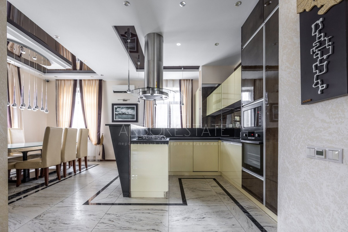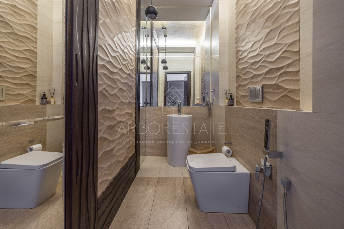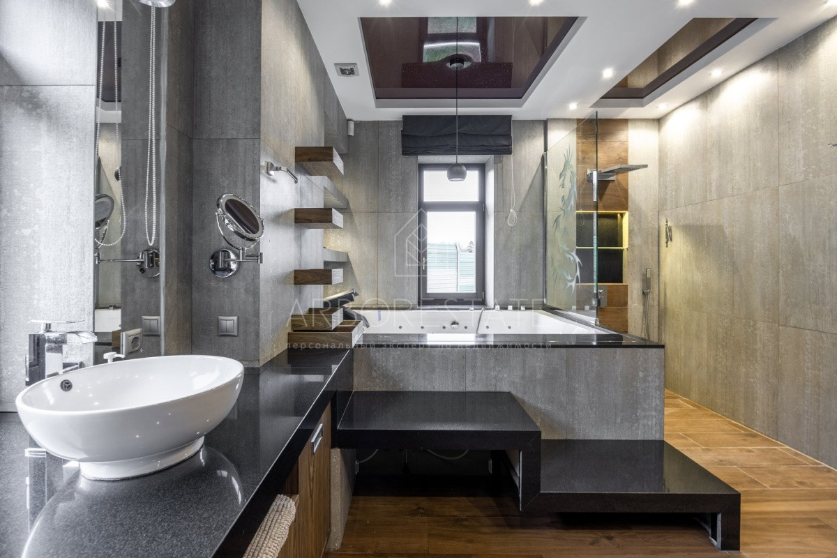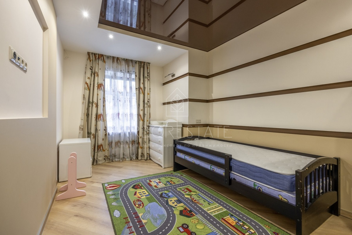 Спальные зоны организованы по принципу suit: в каждой есть своя гардеробная и санузел. На 1 этаже: прихожая, гостиная с камином, столовая-кухня, гостевая спальня (также подойдёт для родителей в возрасте), кабинет, зимний сад, спортзал, кинотеатр, SPA - зона, котельная (обрудование Buderus). Есть помещение для персонала с кухней, санузлом, спальней. В доме установлена охранная сигнализация и видеонаблюдение, смонтированы теплые полы.