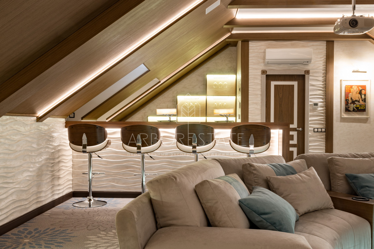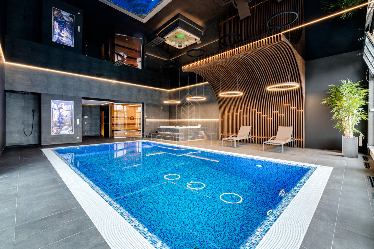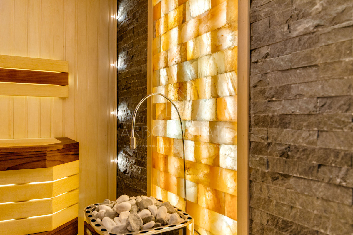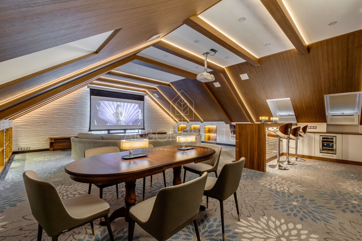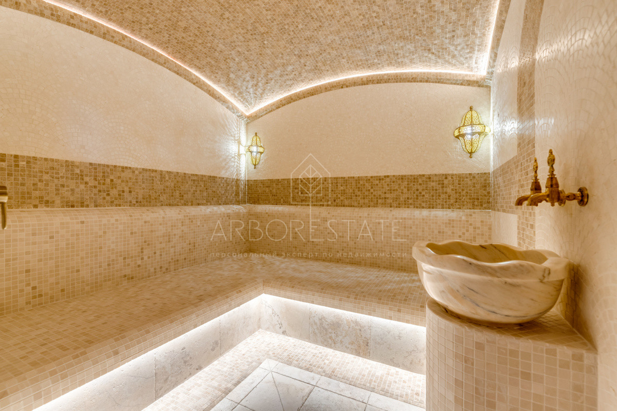 В доме комфортно разместились 5 спальных комнат, 2 кабинета, просторная гостиная и каминный зал, салон красоты, кинозал с баром и игровым столом, квартира для персонала, SPA-комплекс с панорамным бассейном, сауной, хаммамом и комфортным джакузи и многое другое.