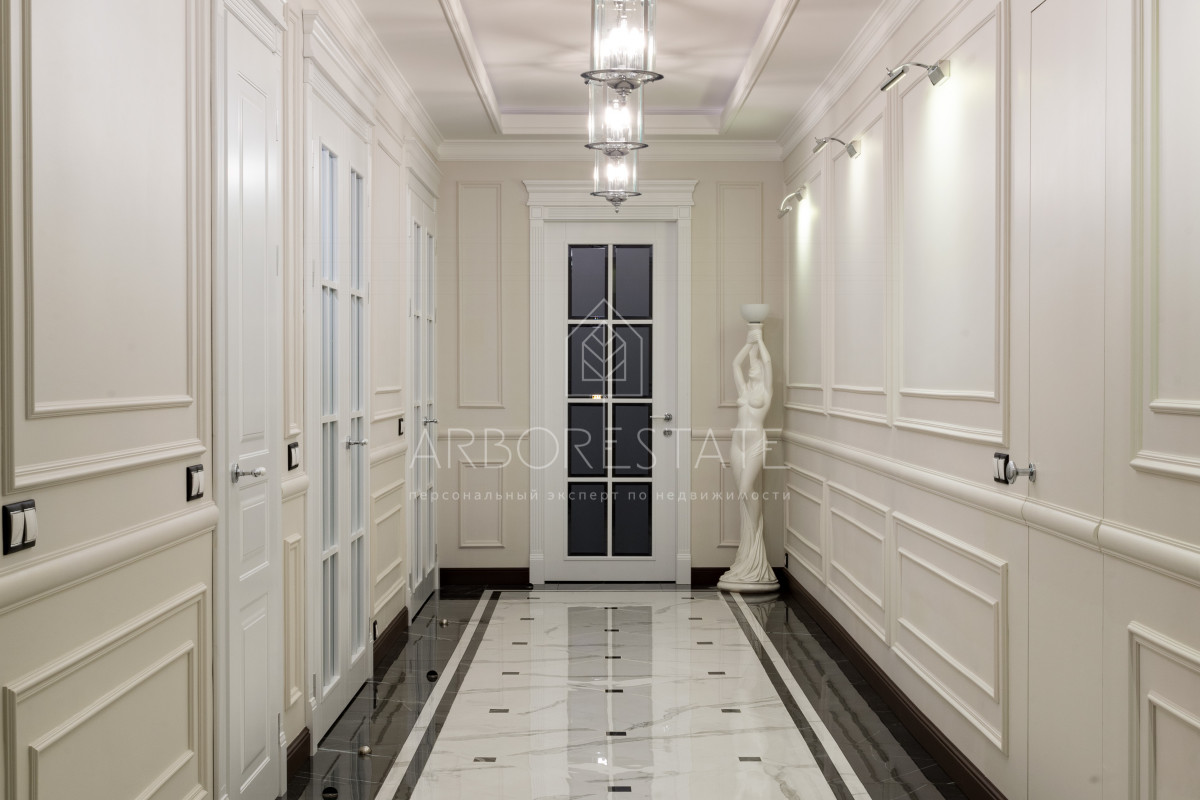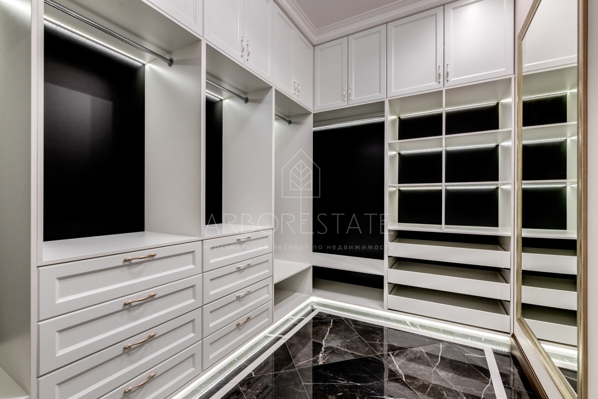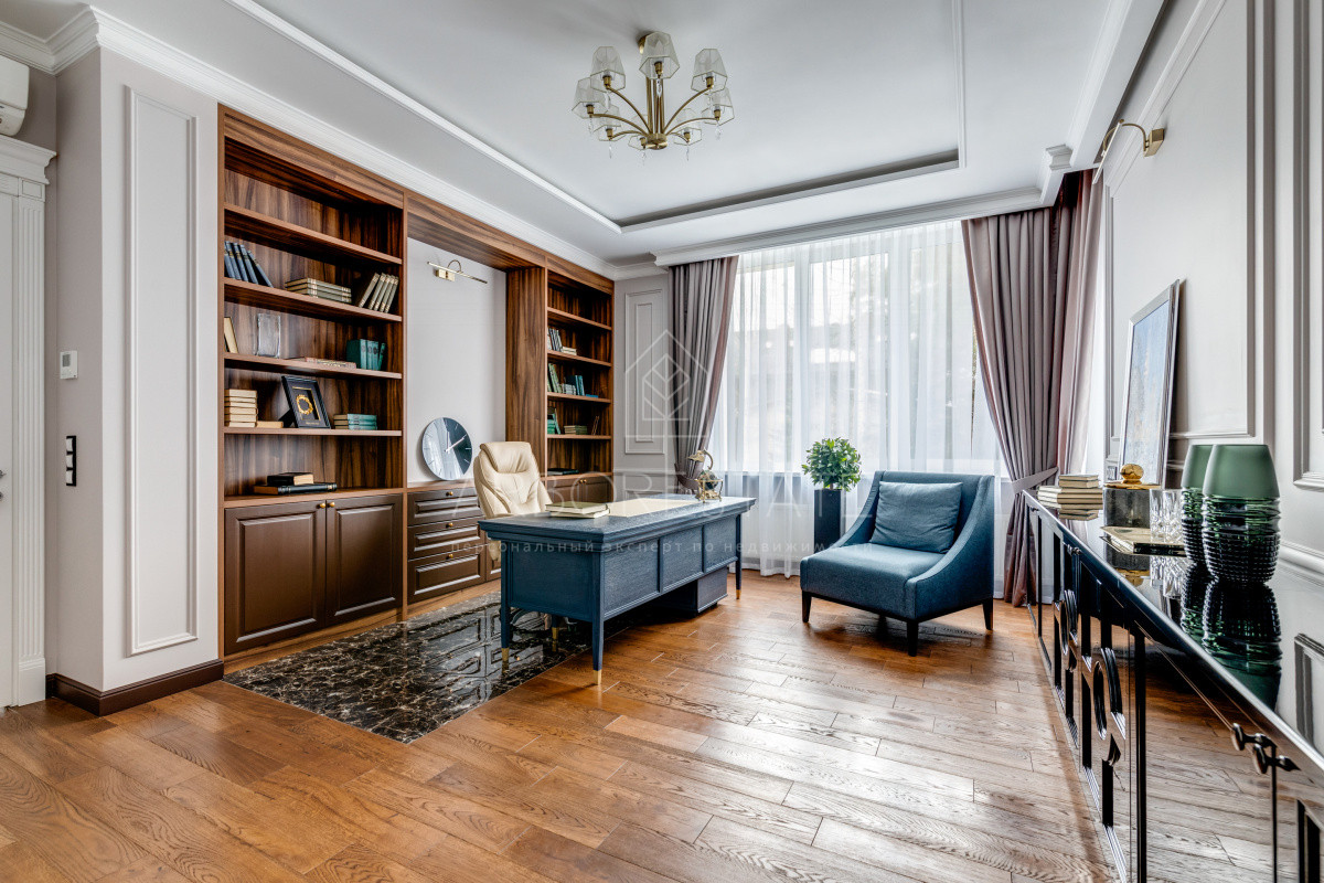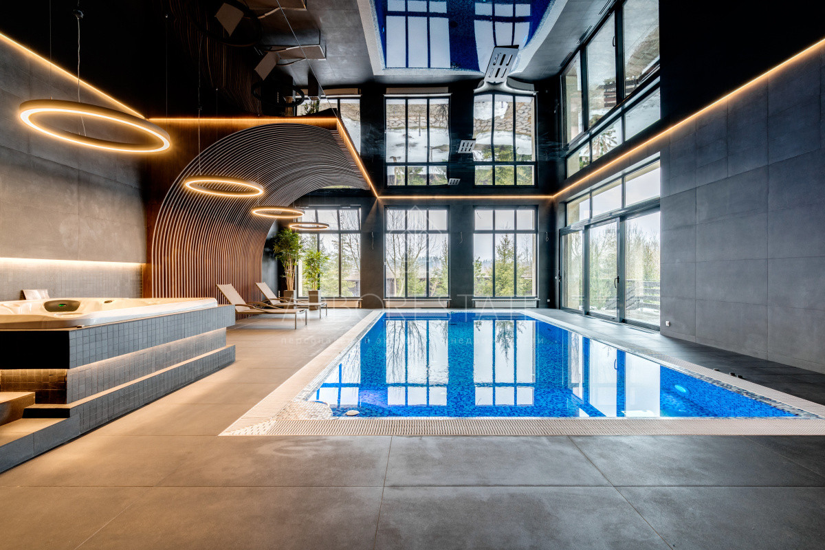 В доме комфортно разместились 5 спальных комнат, 2 кабинета, просторная гостиная и каминный зал, салон красоты, кинозал с баром и игровым столом, квартира для персонала, SPA-комплекс с панорамным бассейном, сауной, хаммамом и комфортным джакузи и многое другое.