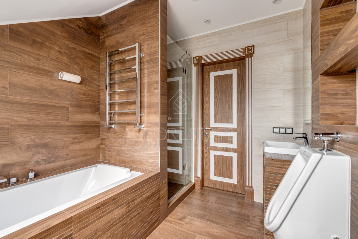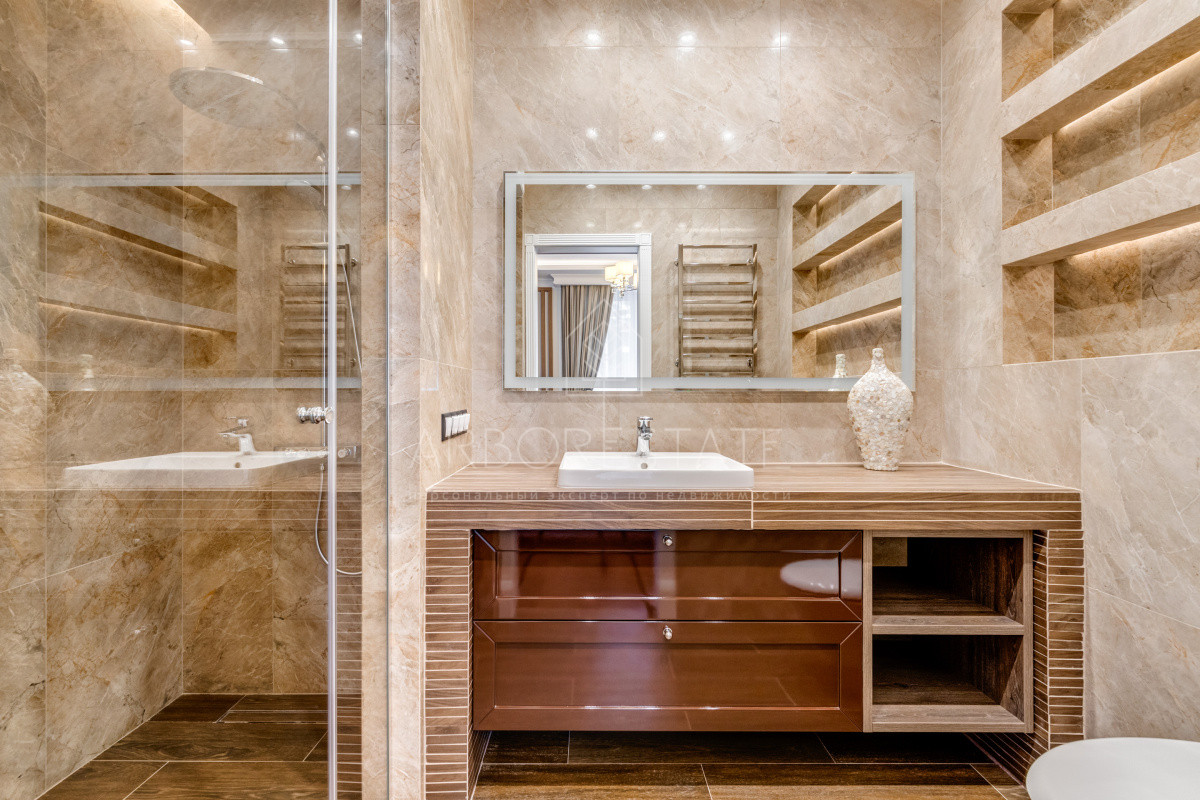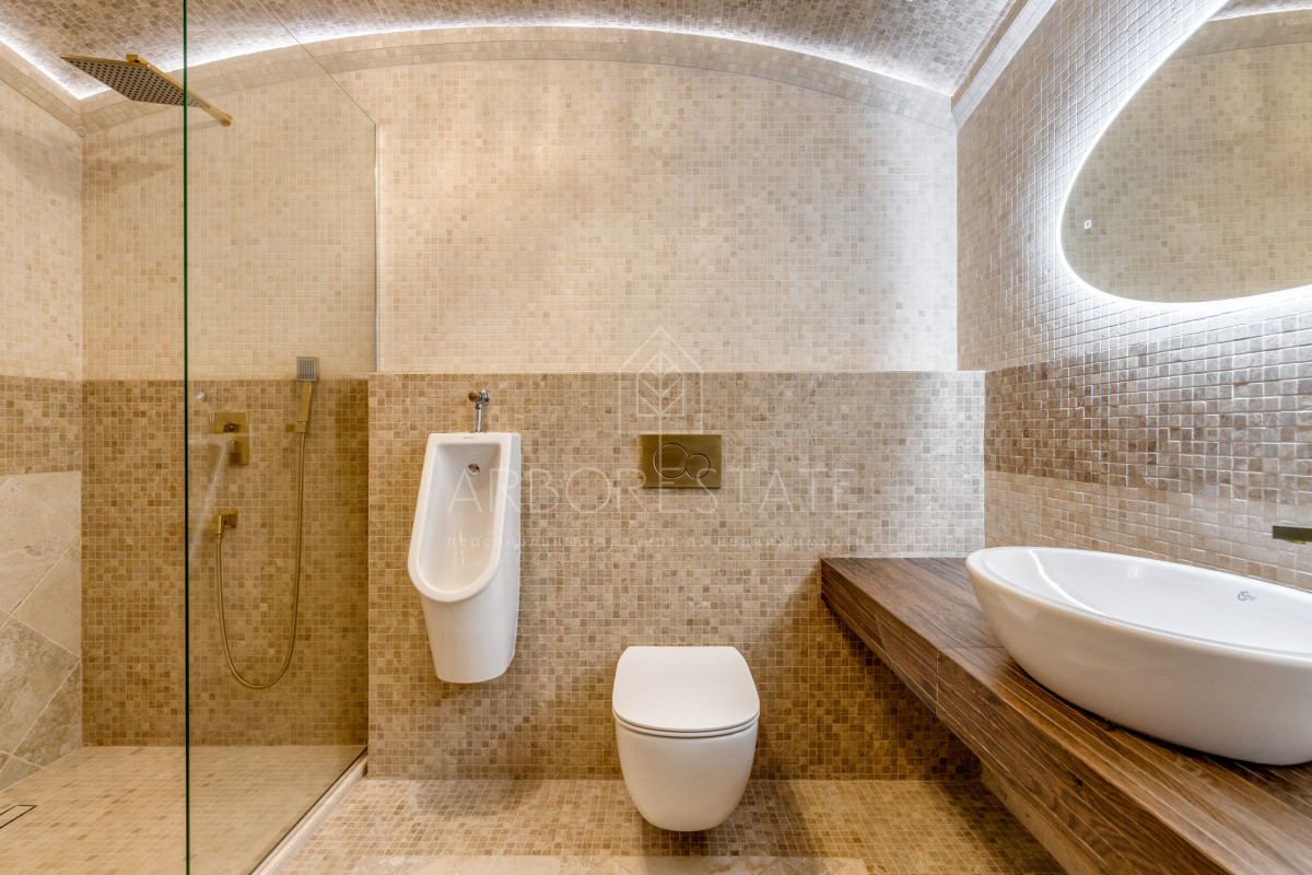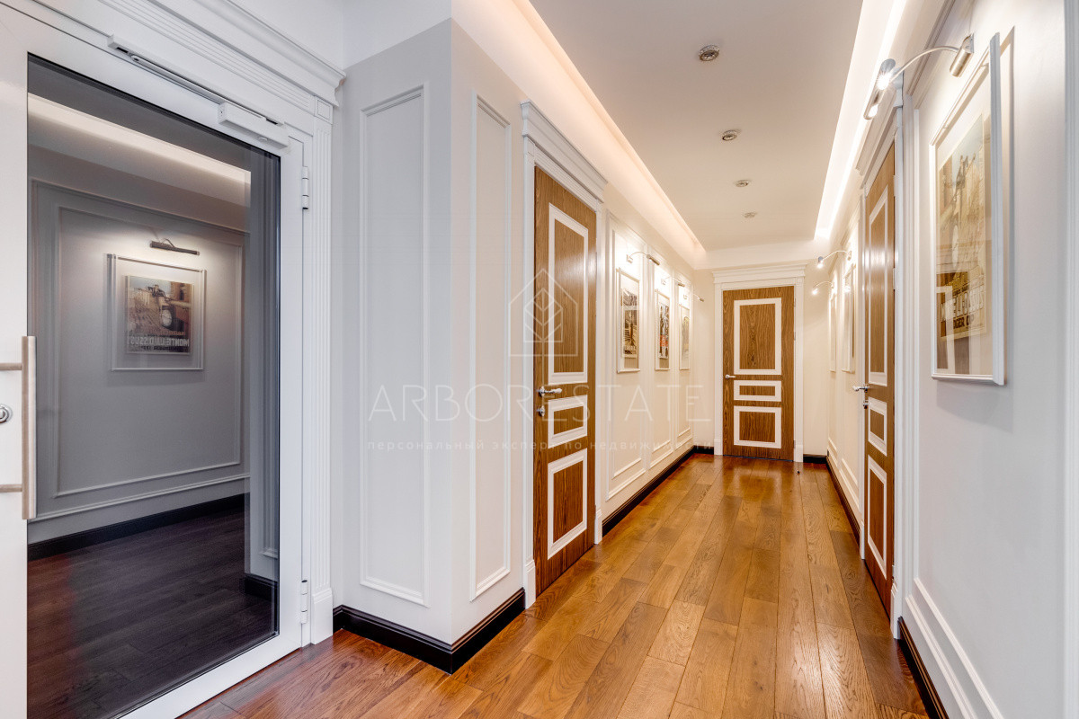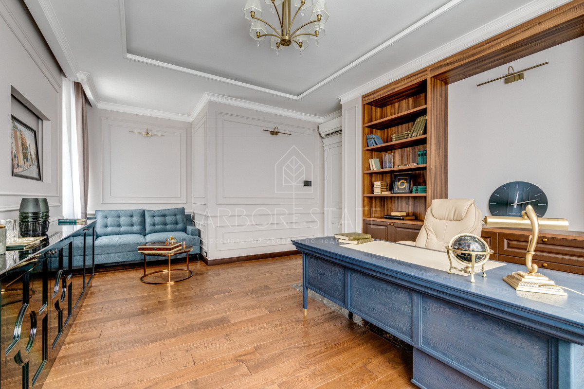 В доме комфортно разместились 5 спальных комнат, 2 кабинета, просторная гостиная и каминный зал, салон красоты, кинозал с баром и игровым столом, квартира для персонала, SPA-комплекс с панорамным бассейном, сауной, хаммамом и комфортным джакузи и многое другое.