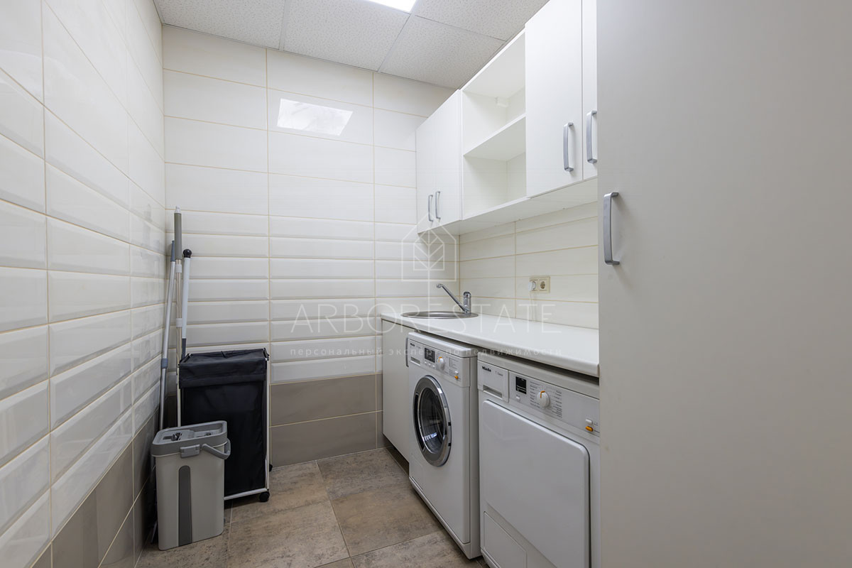 1 этаж: холл, гардеробная, кухня, столовая и выходом на открытую террасу с джакузи и 2 шезлонгами, гостиная и каминная зона, спальня, санузел, постирочная, котельная, кинозал, гараж для 2-х автомобилей.