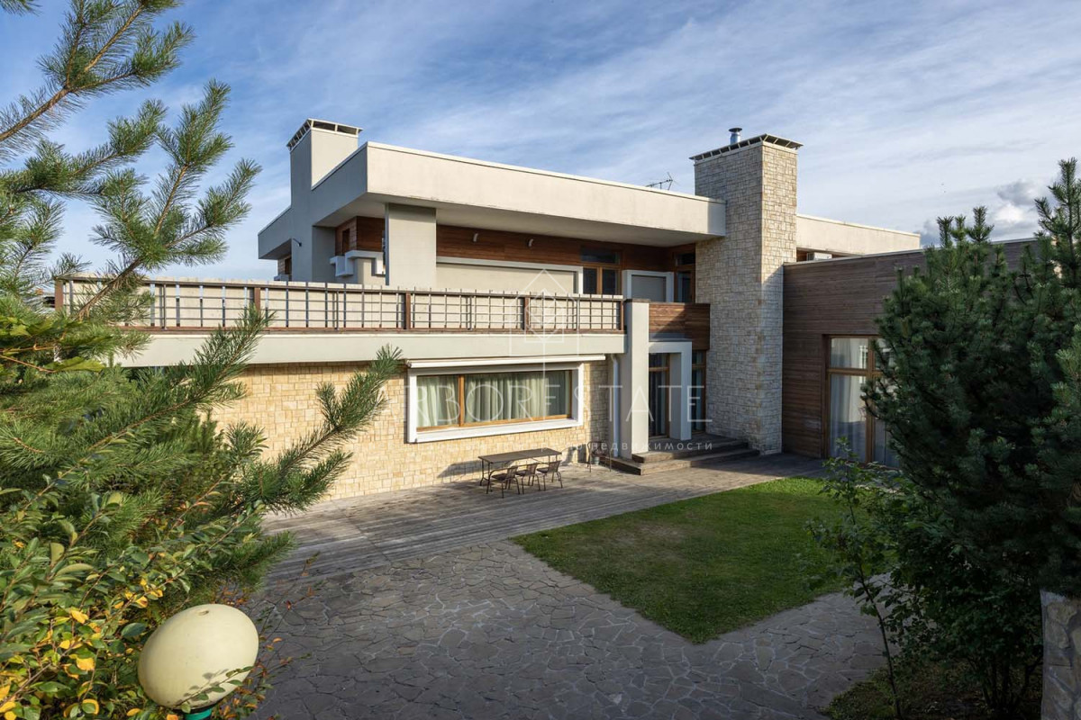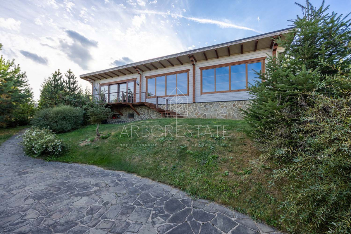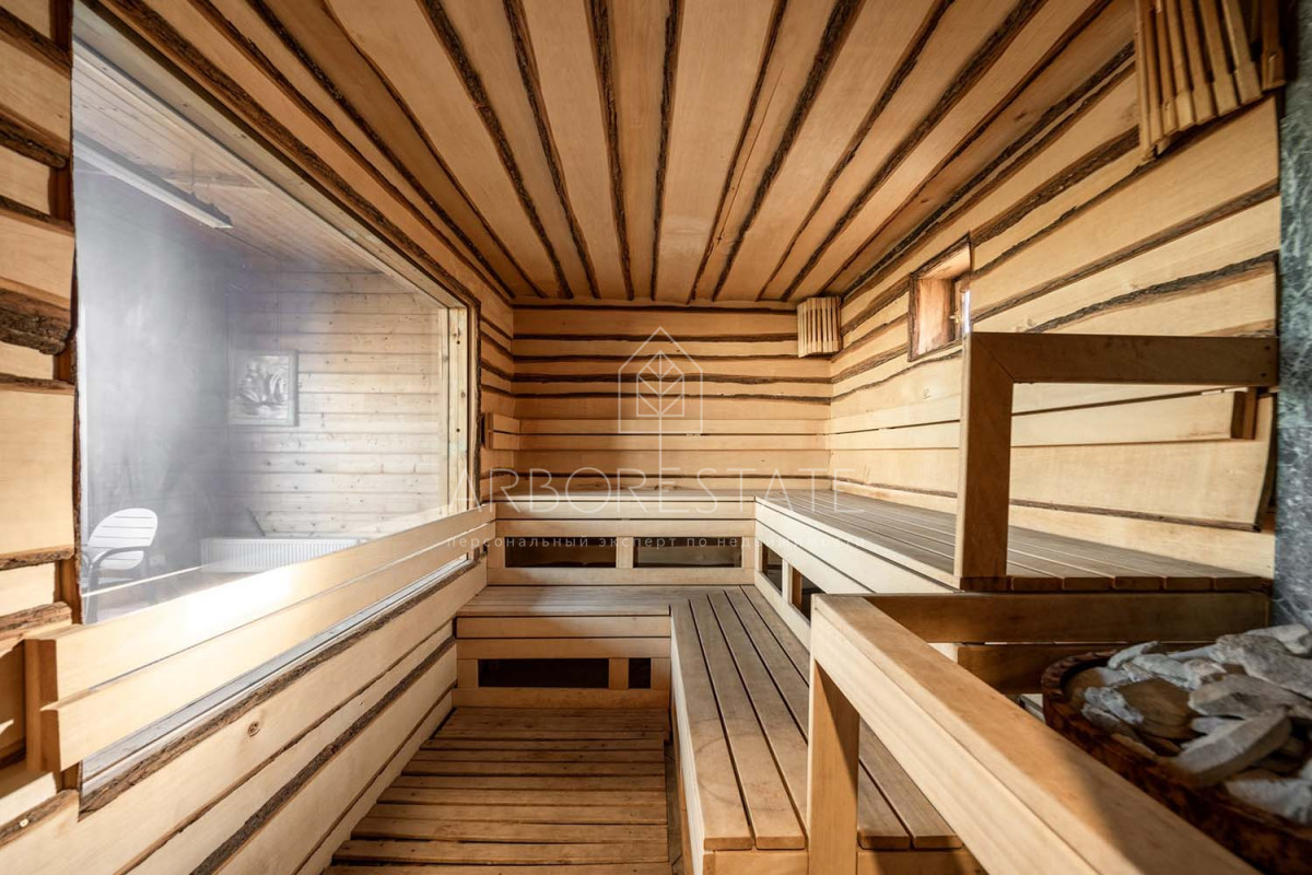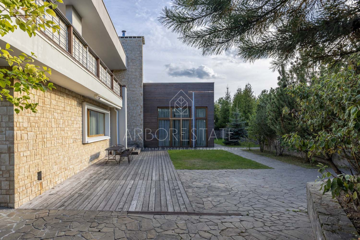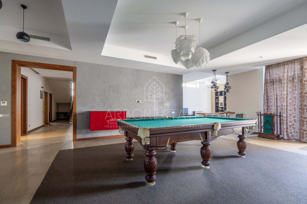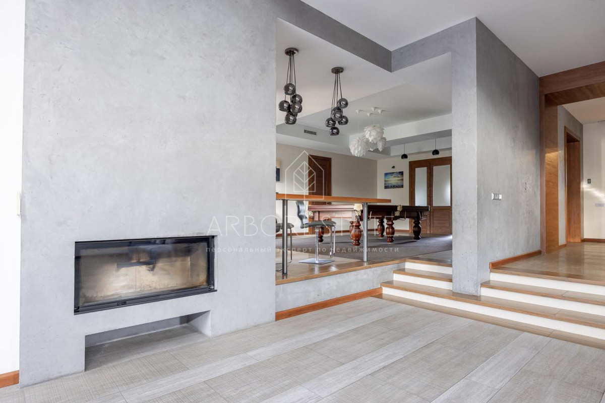 В доме размещаются: прихожая с гардеробом, просторная гостиная с камином, столовая-кухня, бильярдная, две гостевых спальни, два санузла, гараж на 2 автомобиля, отдельно расположен СПА-комплекс с бассейном, сауной и комнатой отдыха.