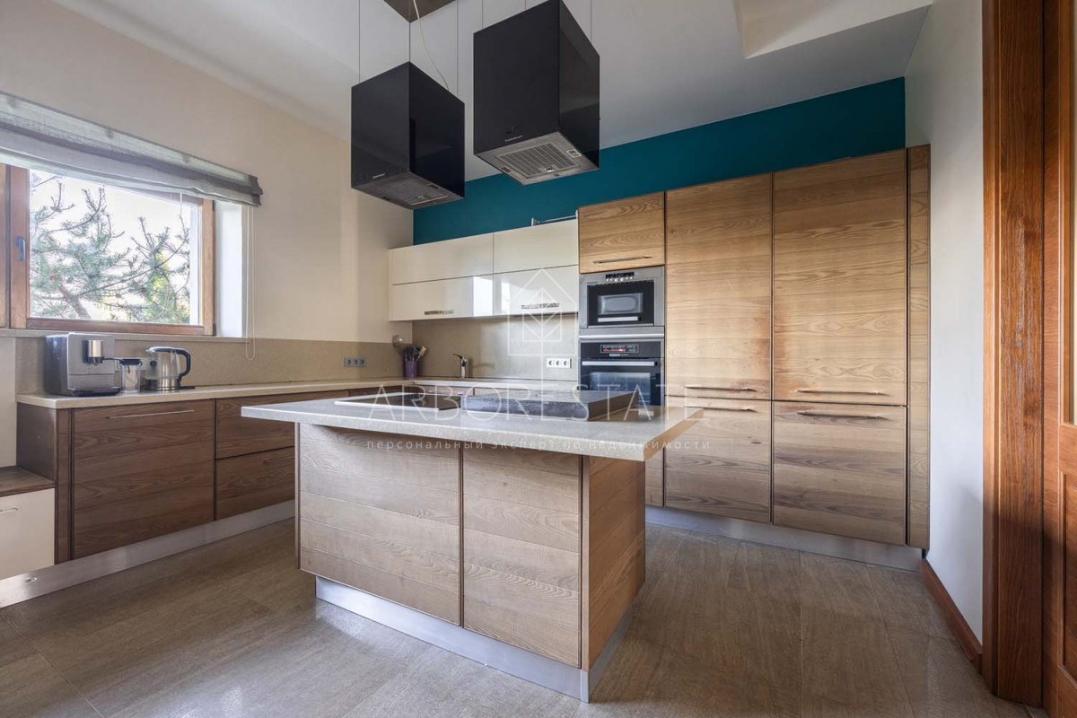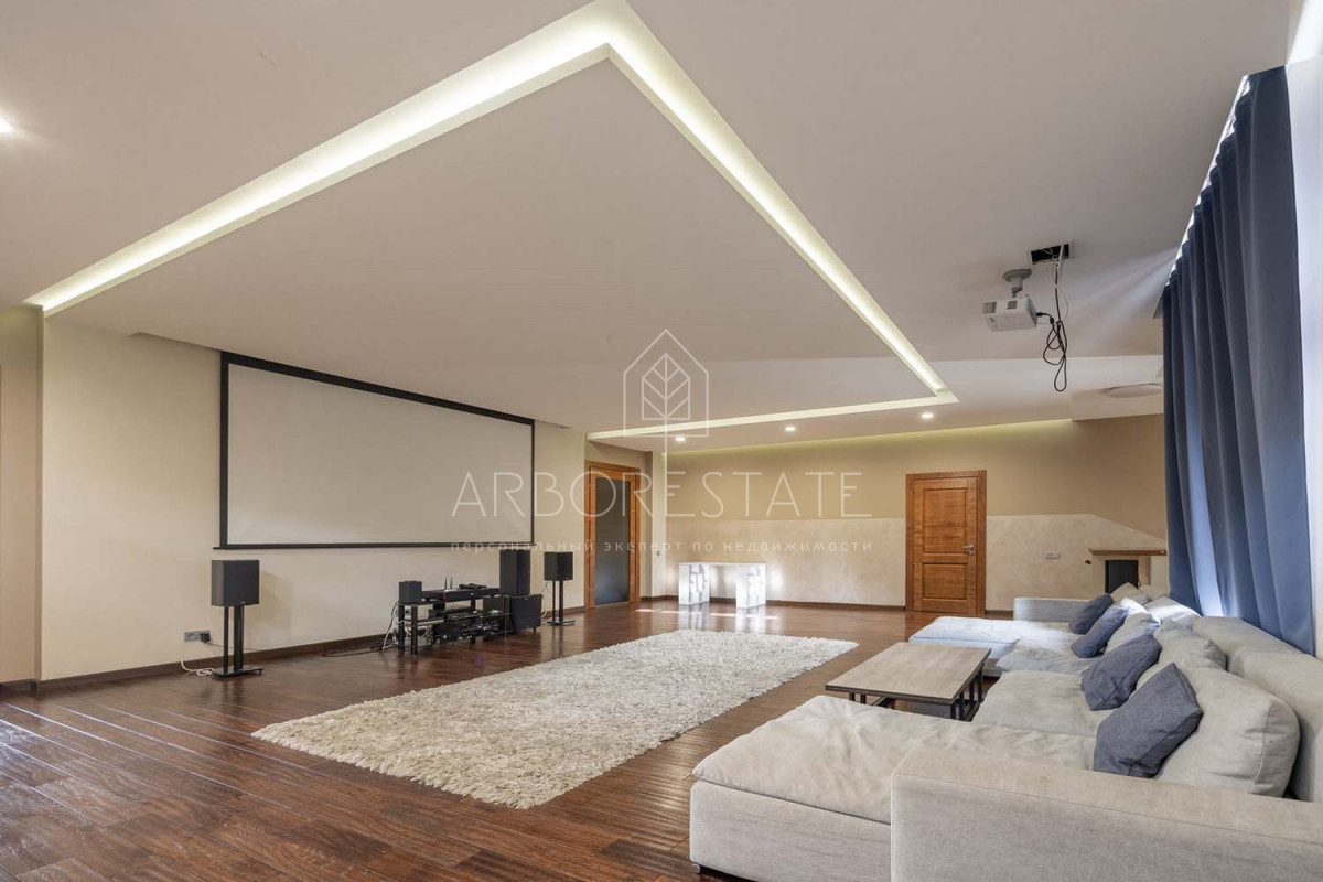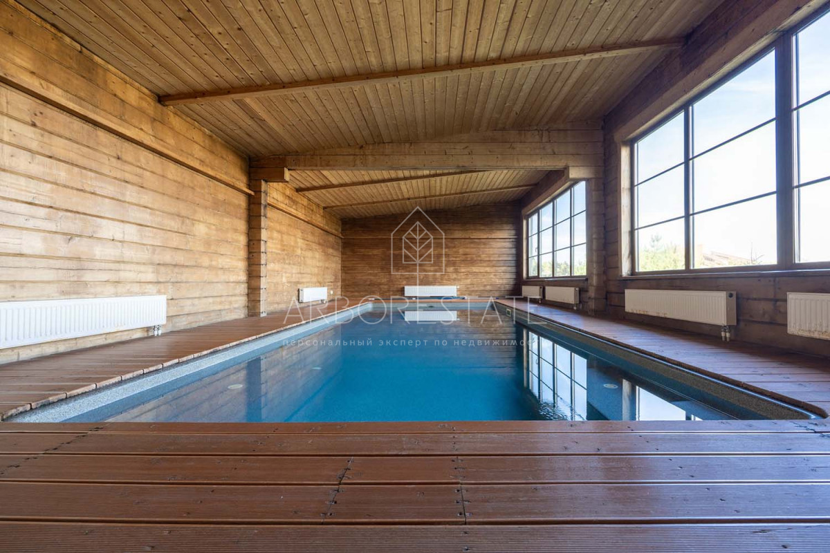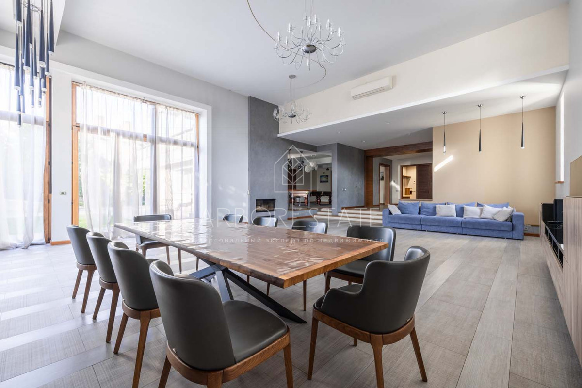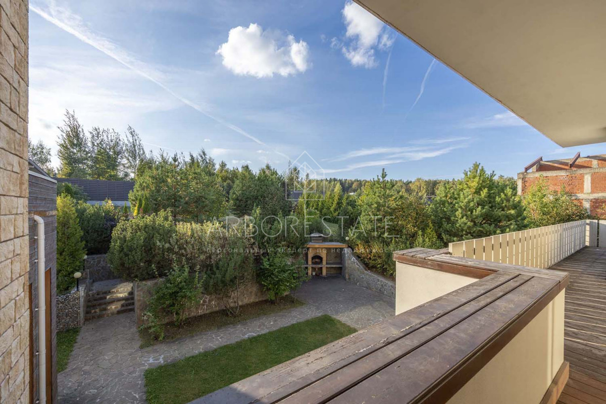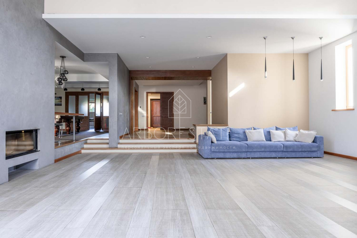 В доме размещаются: прихожая с гардеробом, просторная гостиная с камином, столовая-кухня, бильярдная, две гостевых спальни, два санузла, гараж на 2 автомобиля, отдельно расположен СПА-комплекс с бассейном, сауной и комнатой отдыха.