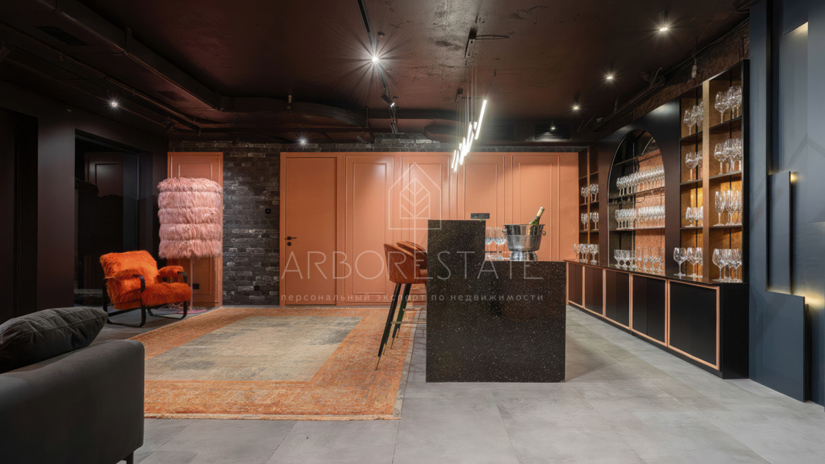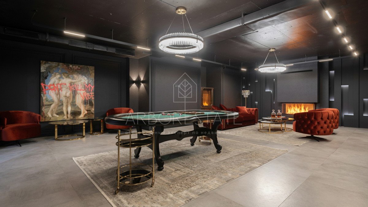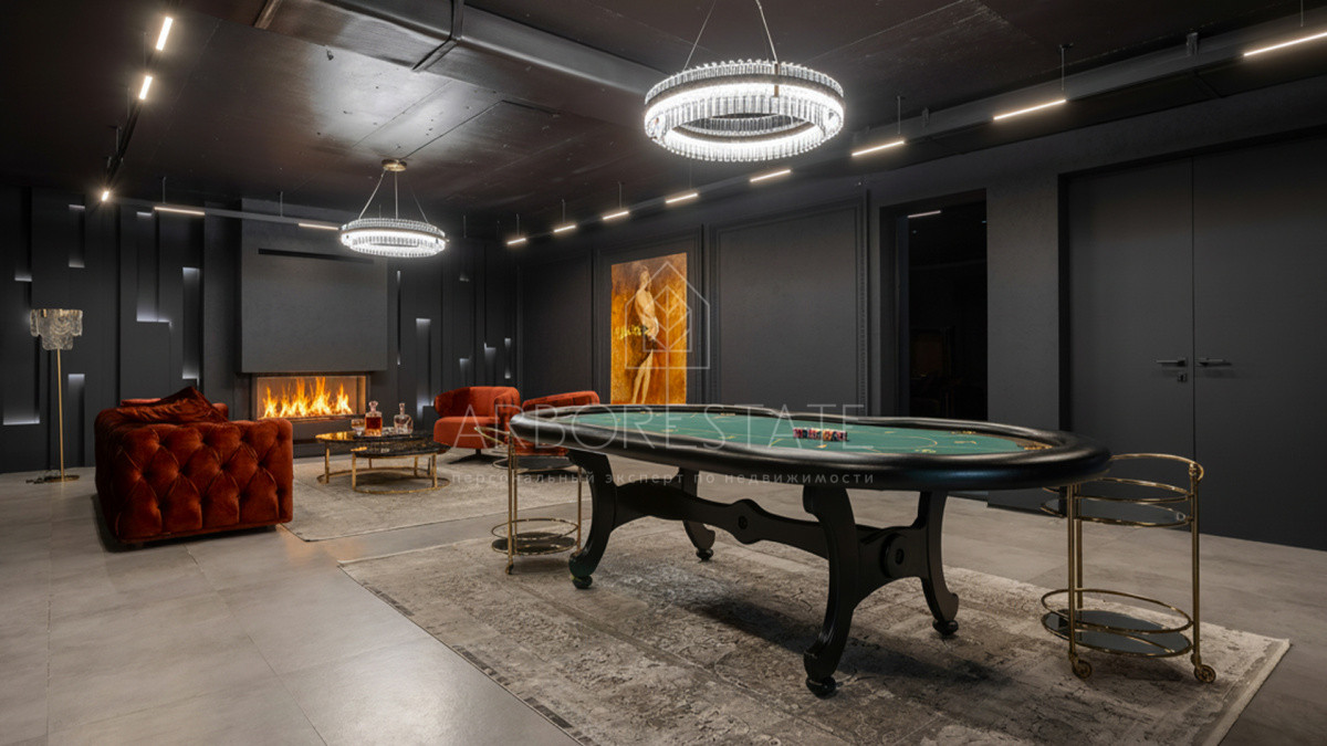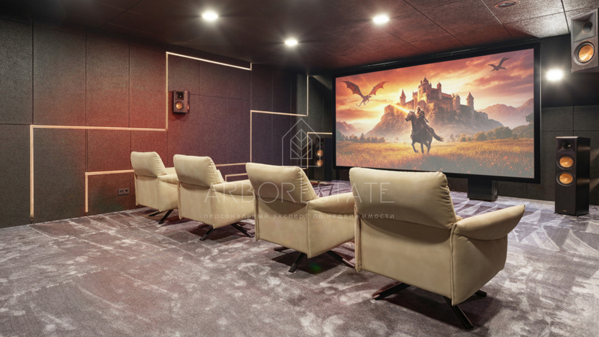 залом с баром, оружейной и домашним кинотеатром, оснащённым оборудованием