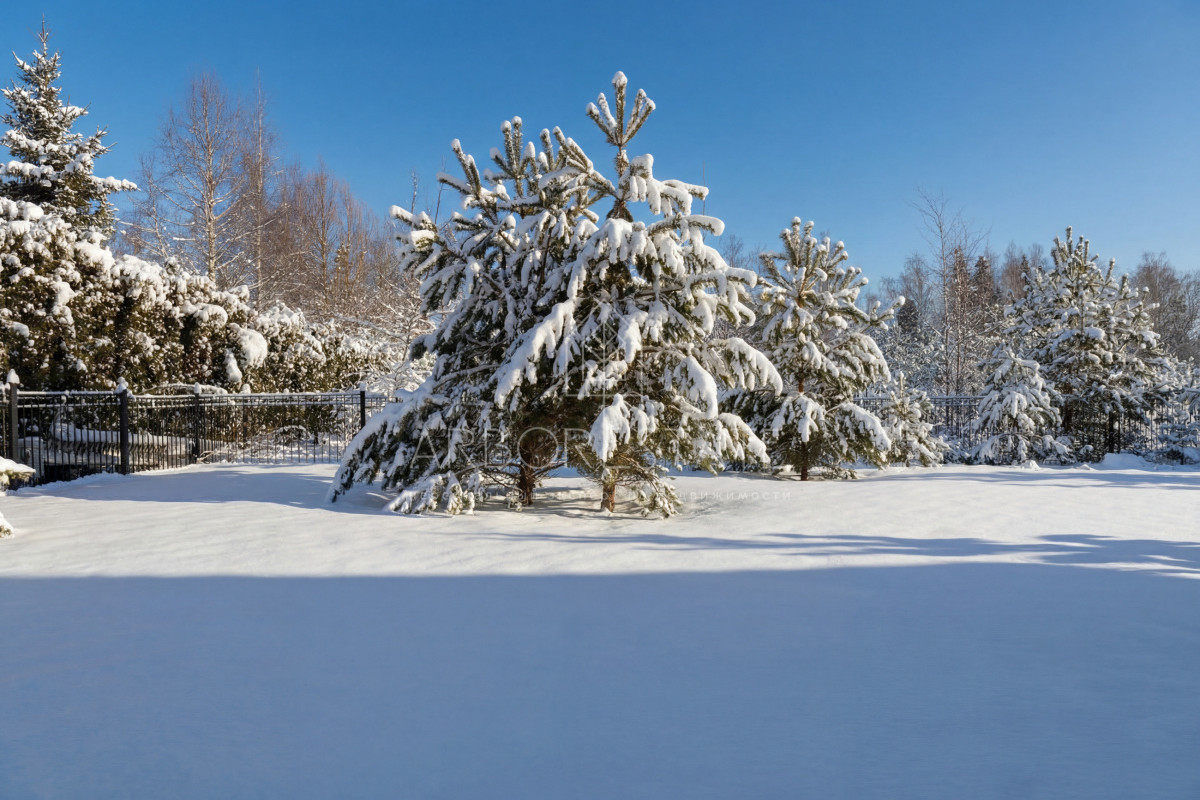 На участке площадью 15 соток высажены крупномеры хвойных пород деревьев.