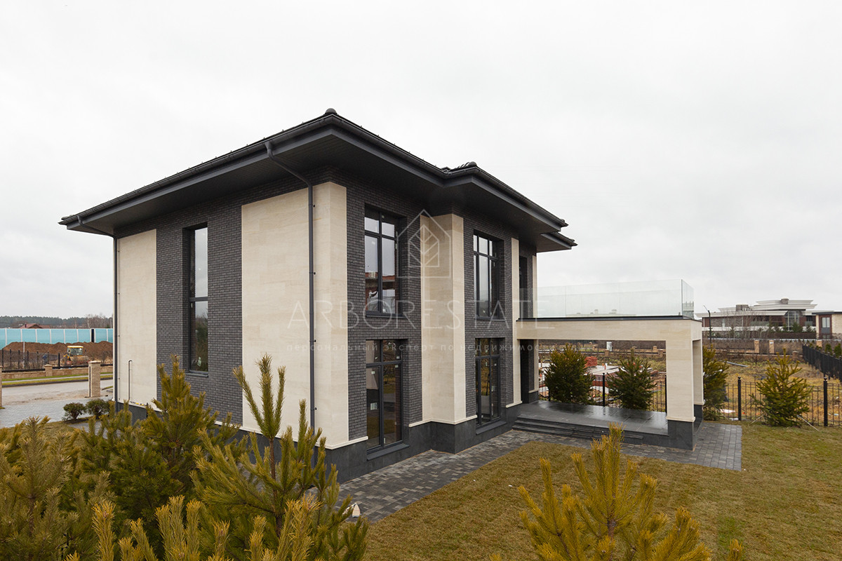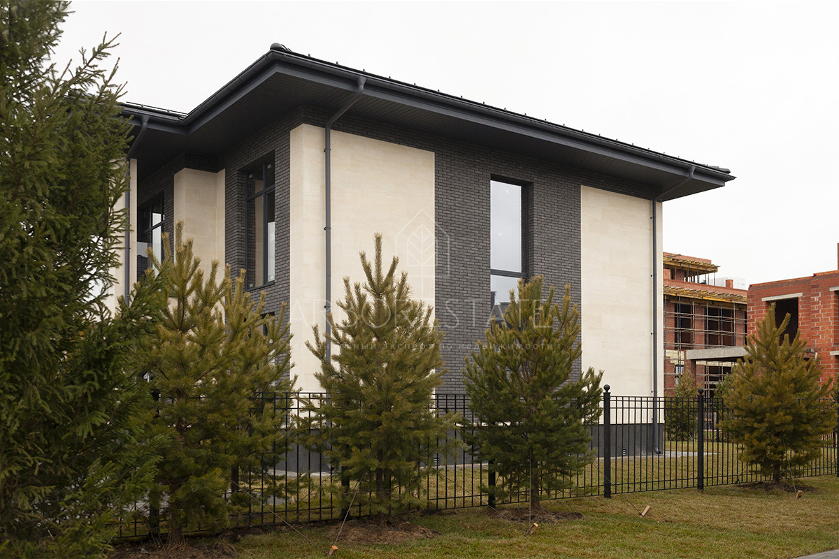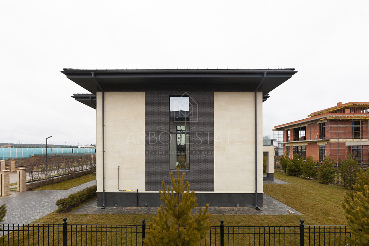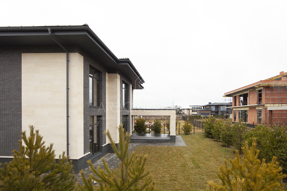 Дом построен на участке правильной прямоугольной формы площадью 7,56 соток. По периметру будут высажены кустарники и деревья, а на основной части территории уложен газон. Участок готов к идеям по благоустройству. Внешняя отделка дома выполнена премиальными материалами в серо-молочной гамме: декоративный кирпич, натуральный песчаник, цементно-песчаная черепица, планкен.
