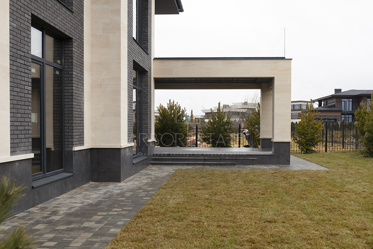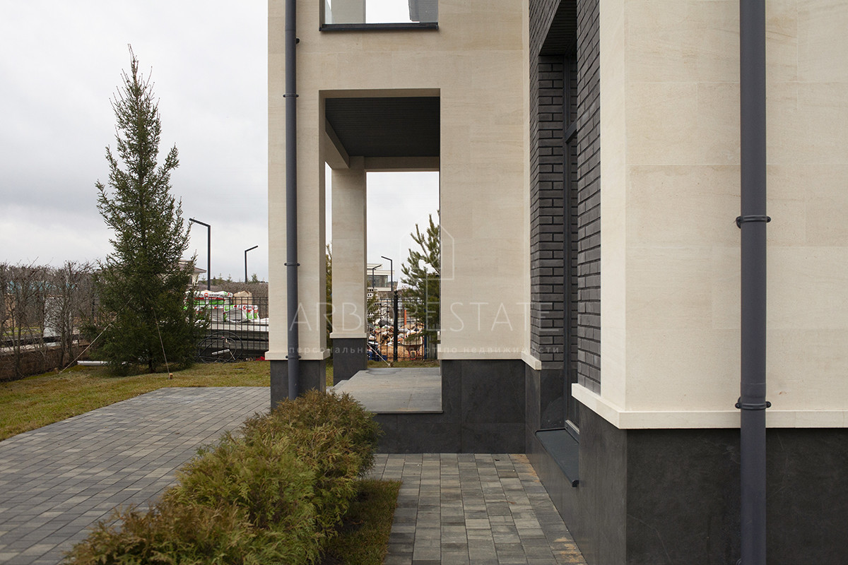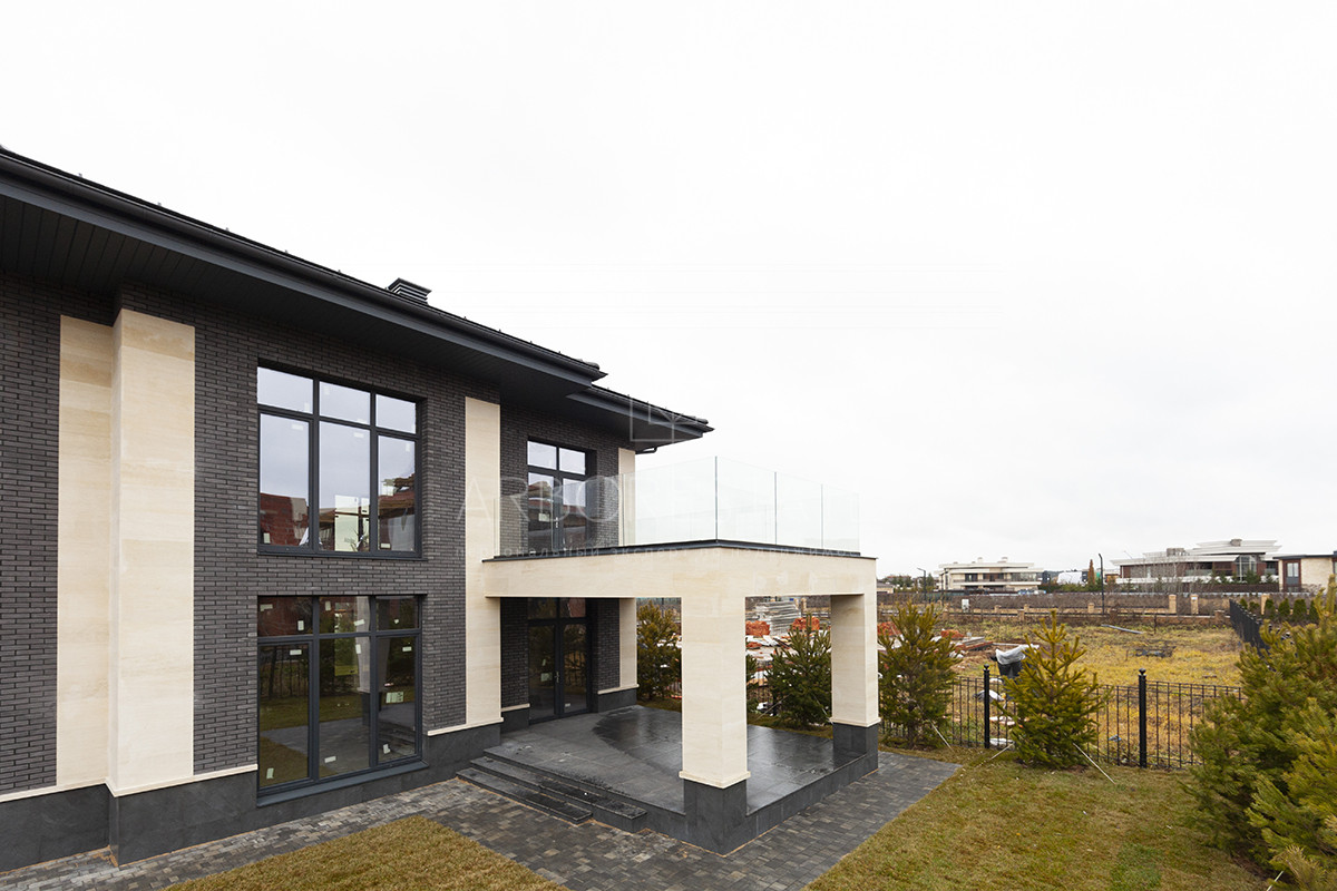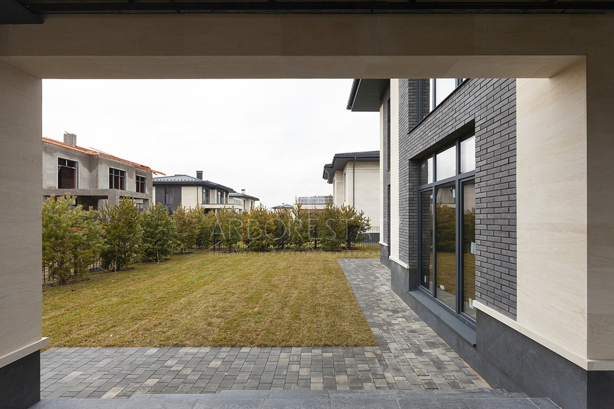 Дом построен на участке правильной прямоугольной формы площадью 7,56 соток. По периметру будут высажены кустарники и деревья, а на основной части территории уложен газон. Участок готов к идеям по благоустройству. Внешняя отделка дома выполнена премиальными материалами в серо-молочной гамме: декоративный кирпич, натуральный песчаник, цементно-песчаная черепица, планкен.
