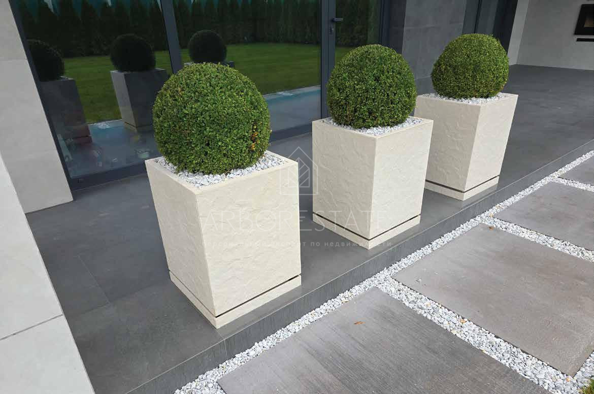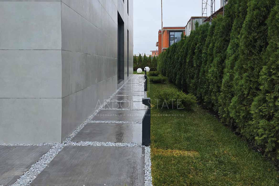 На участке сделан ландшафтный дизайн: зеленая изгородь по периметру,