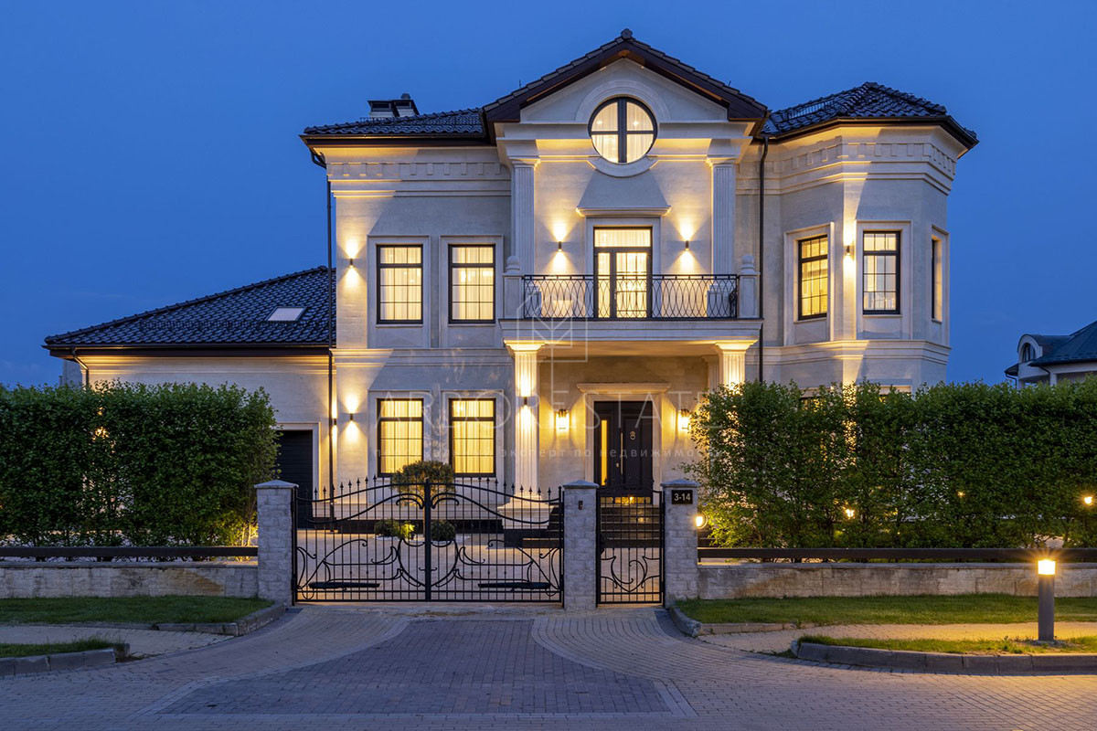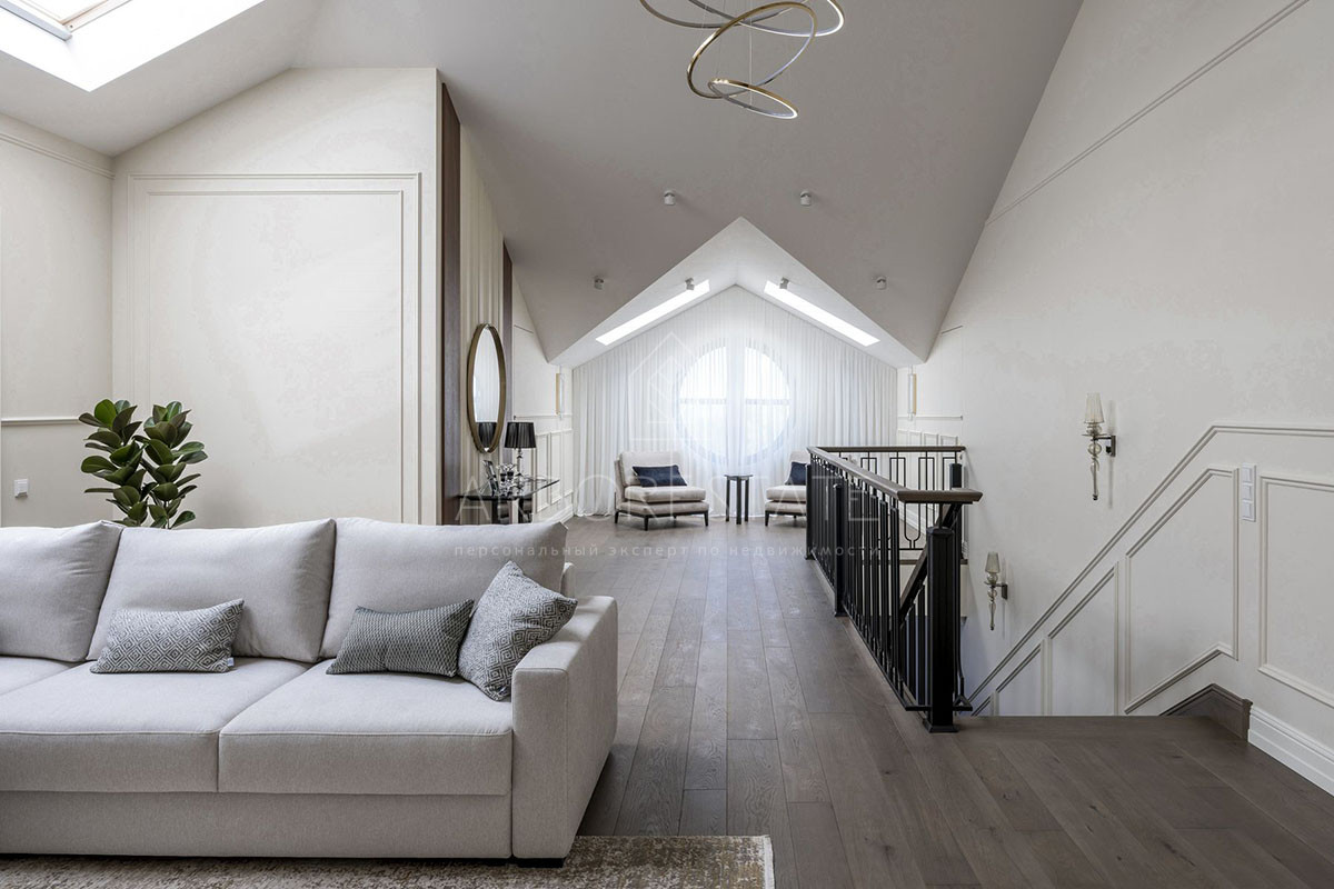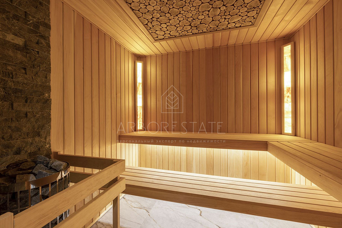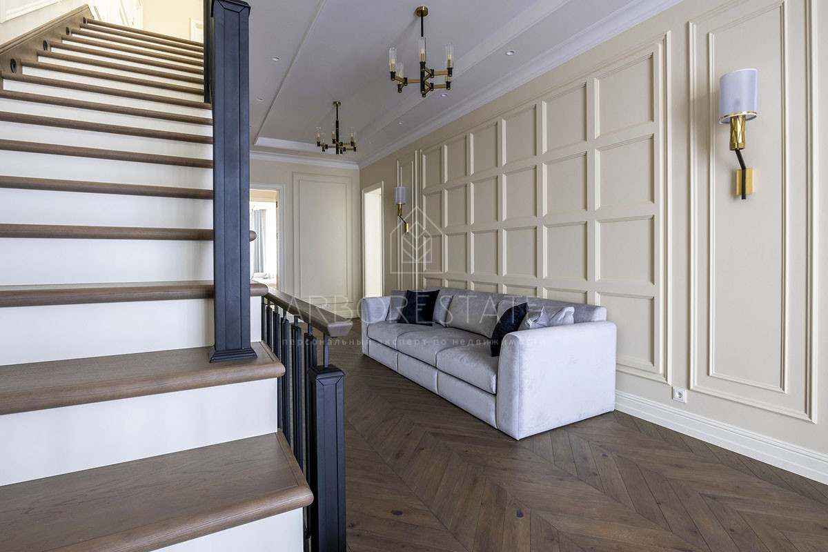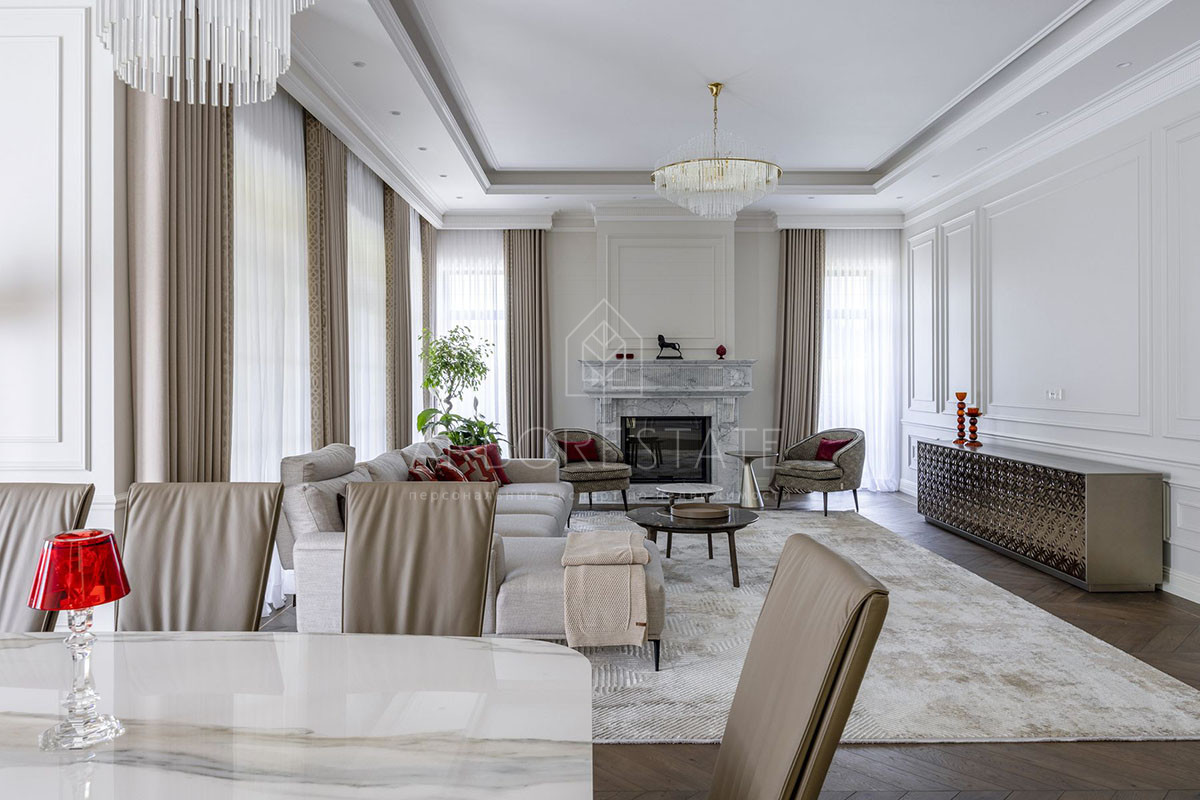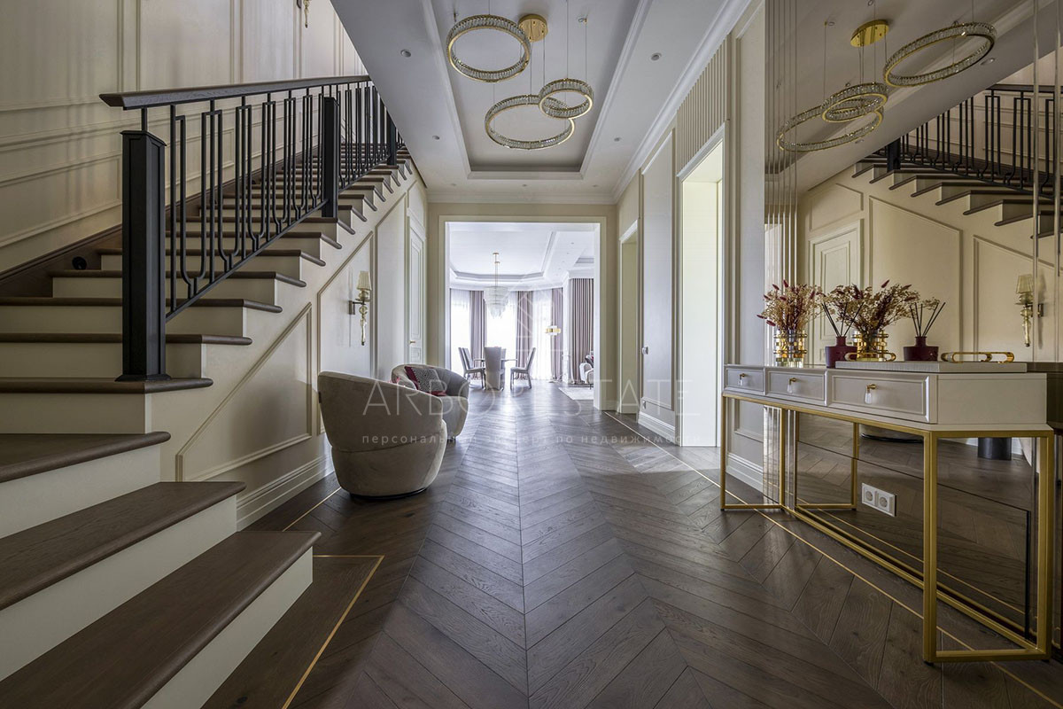 Преимущества дома: современная стилистика отделки, премиальные материалы, 6 спален, СПА зона (сауна, хаммам), гараж на 2 машиноместа, блок для персонала со своей кухней.