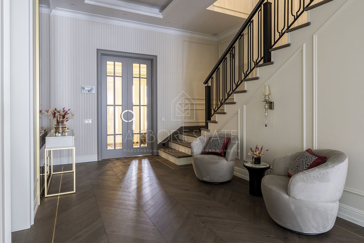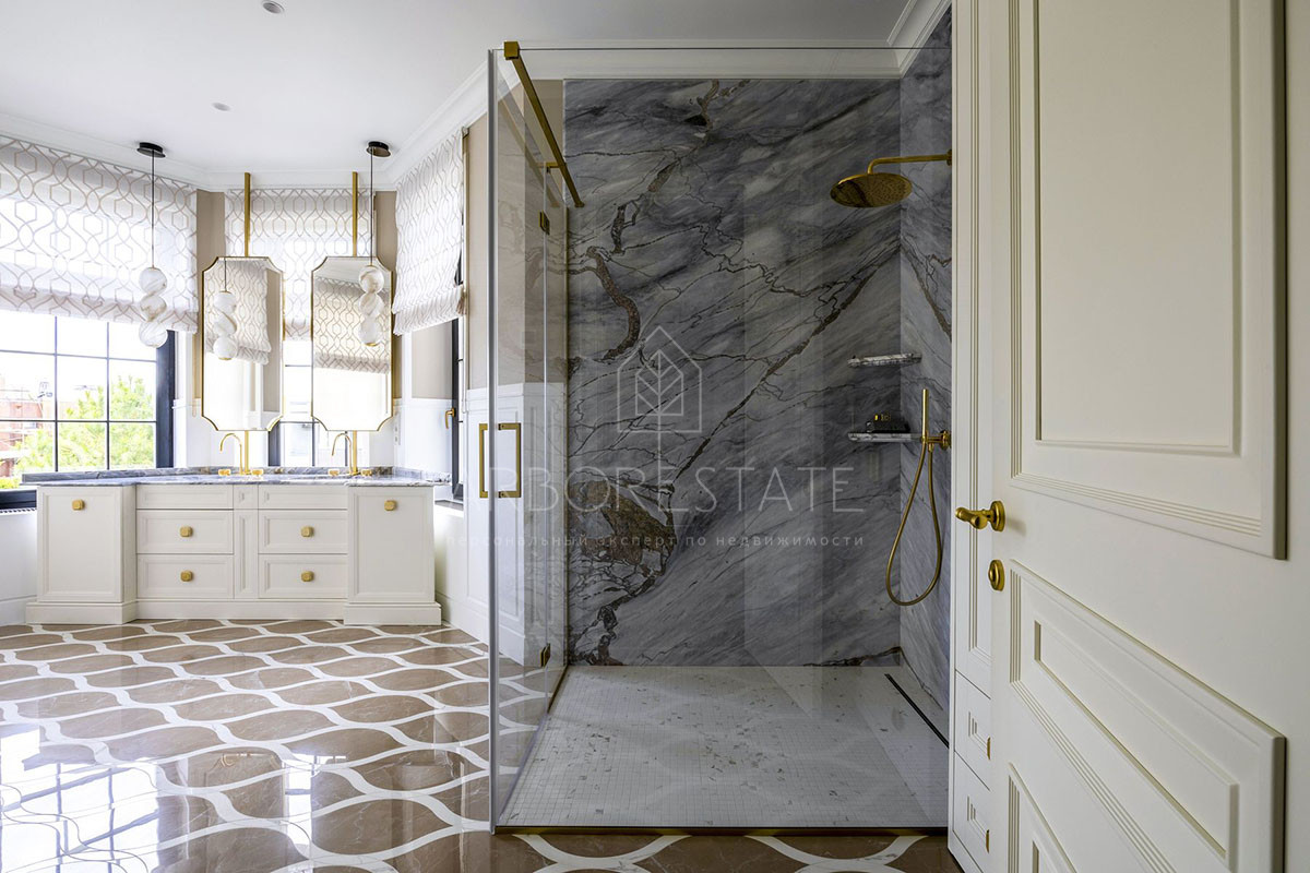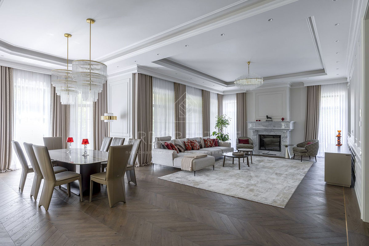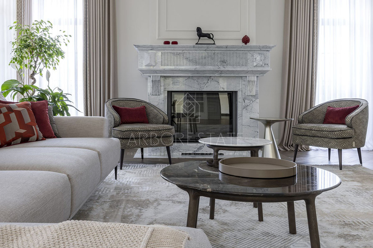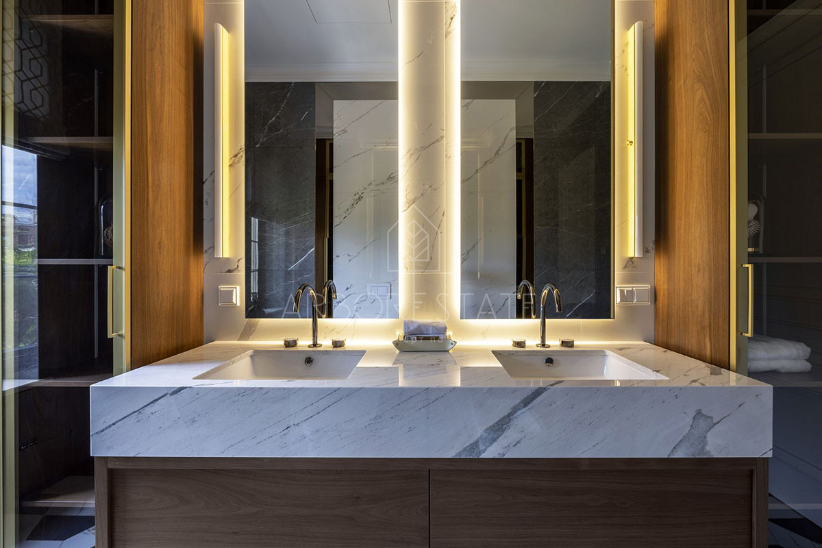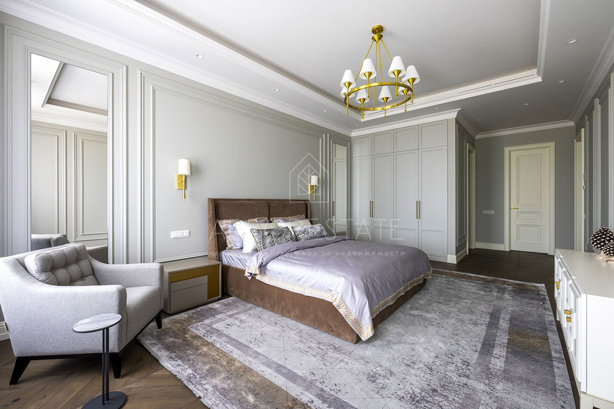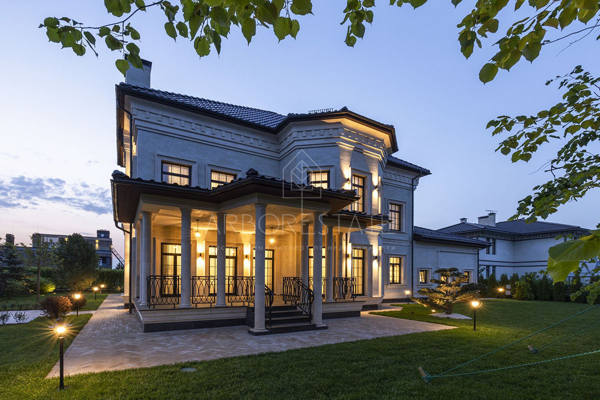 Преимущества дома: современная стилистика отделки, премиальные материалы, 6 спален, СПА зона (сауна, хаммам), гараж на 2 машиноместа, блок для персонала со своей кухней.