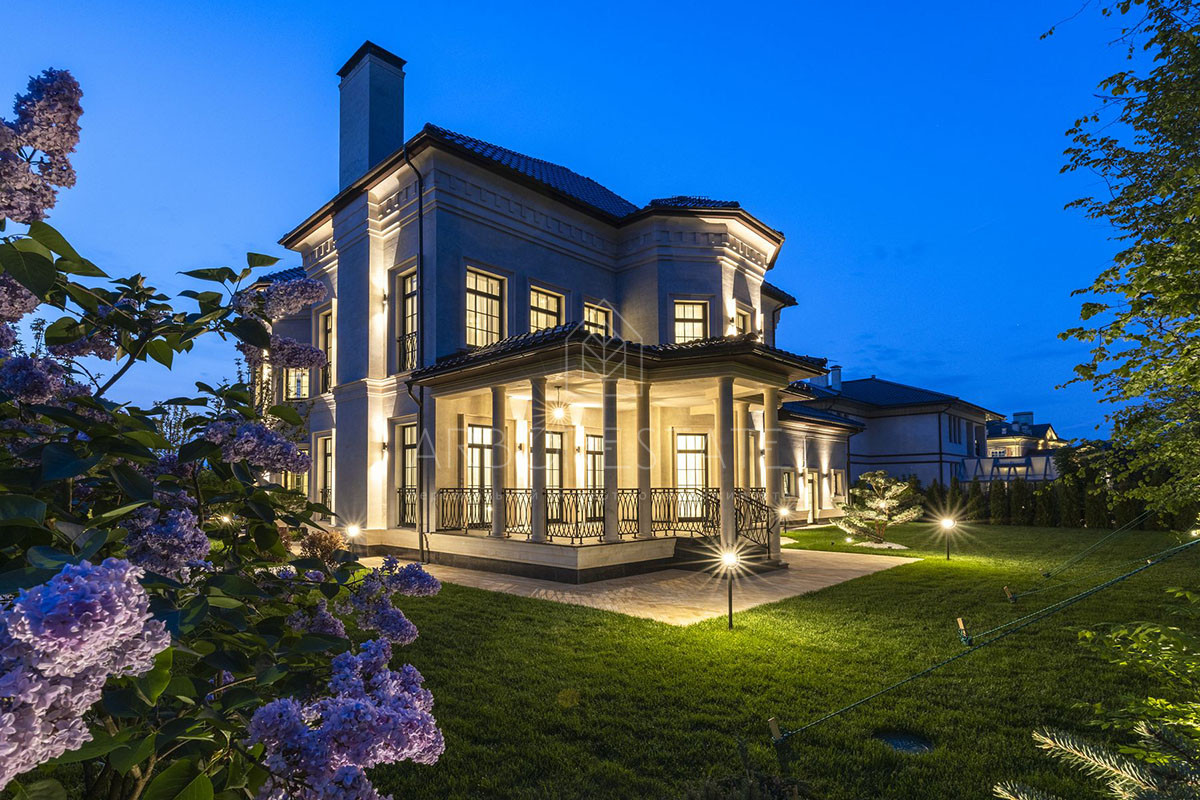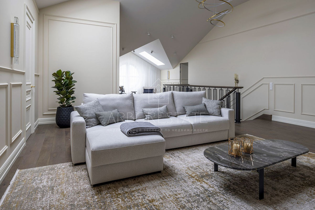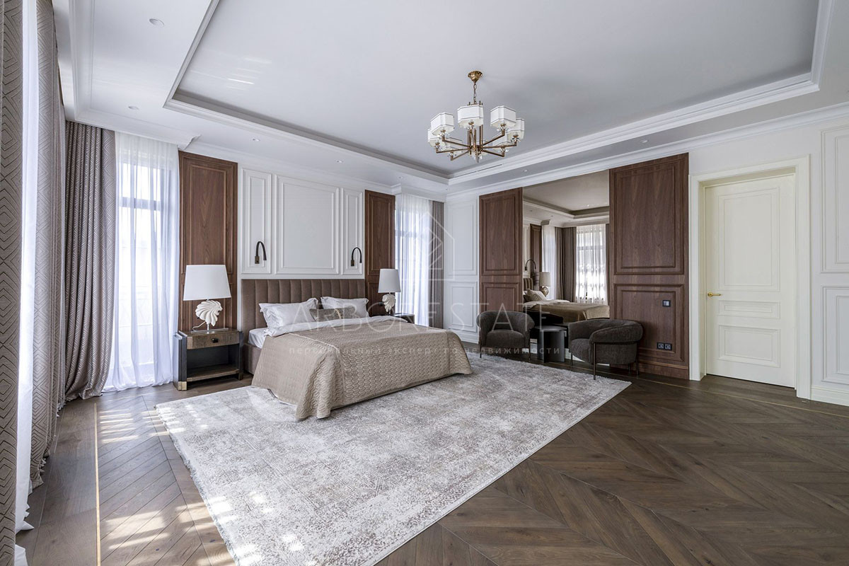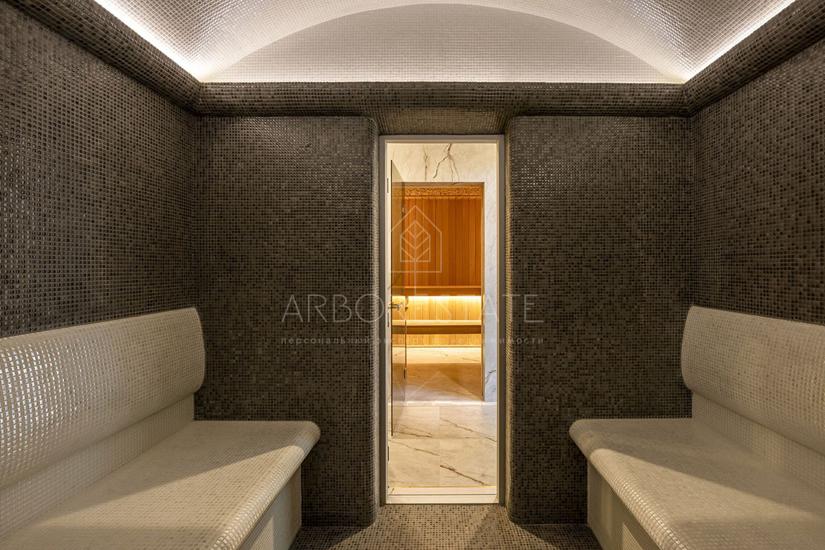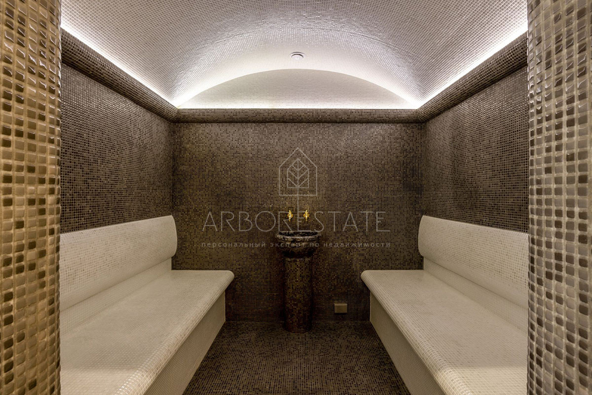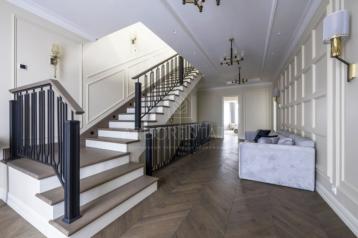 Преимущества дома: современная стилистика отделки, премиальные материалы, 6 спален, СПА зона (сауна, хаммам), гараж на 2 машиноместа, блок для персонала со своей кухней.