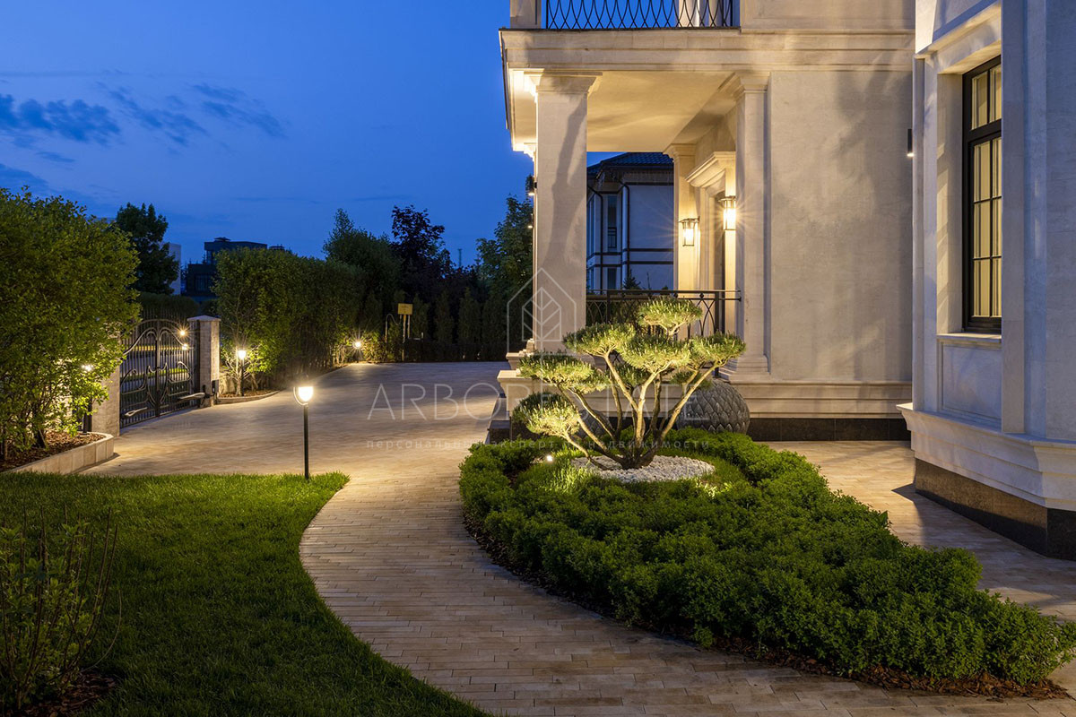 На участке выполнен ландшафт, высажены крупномеры, бонсаи, кедр, бересклеты, сербские ели и цветущие пышные гортензии.