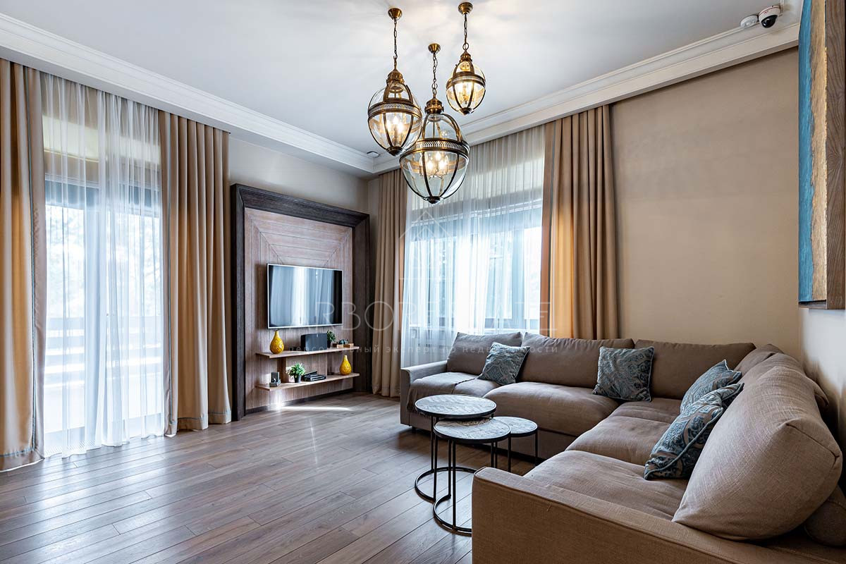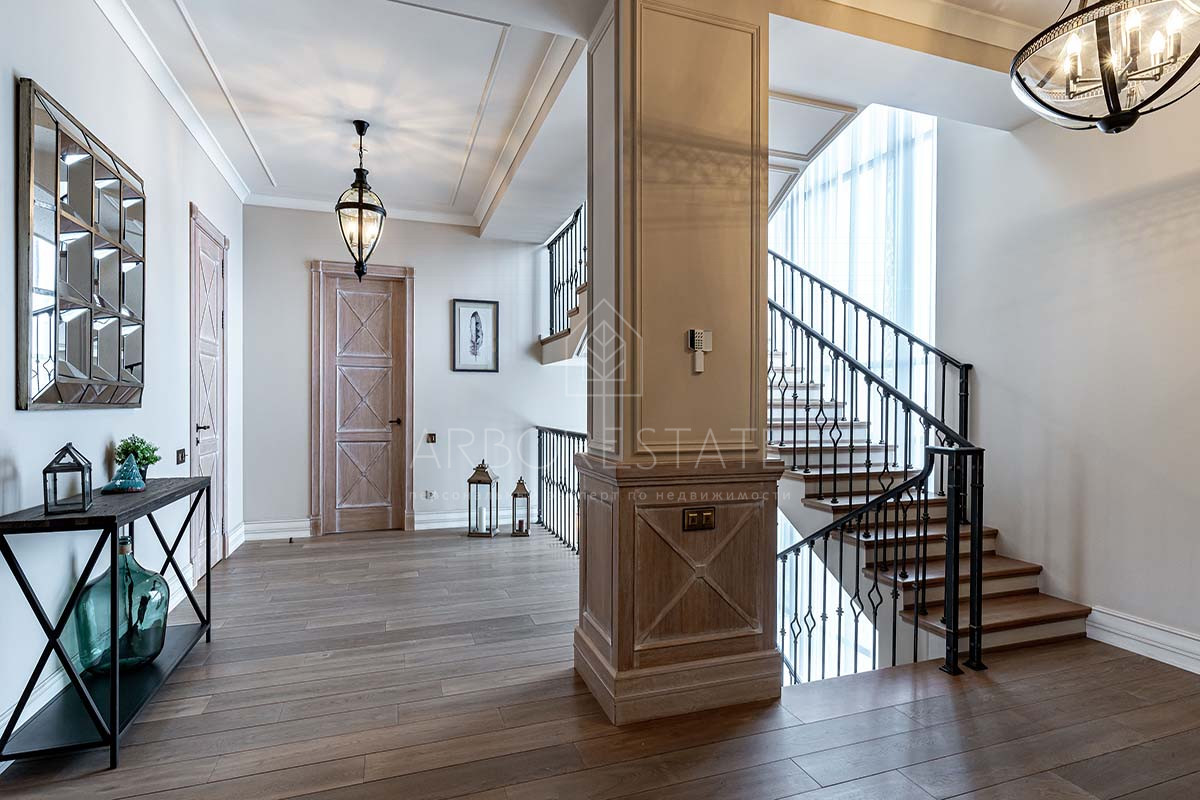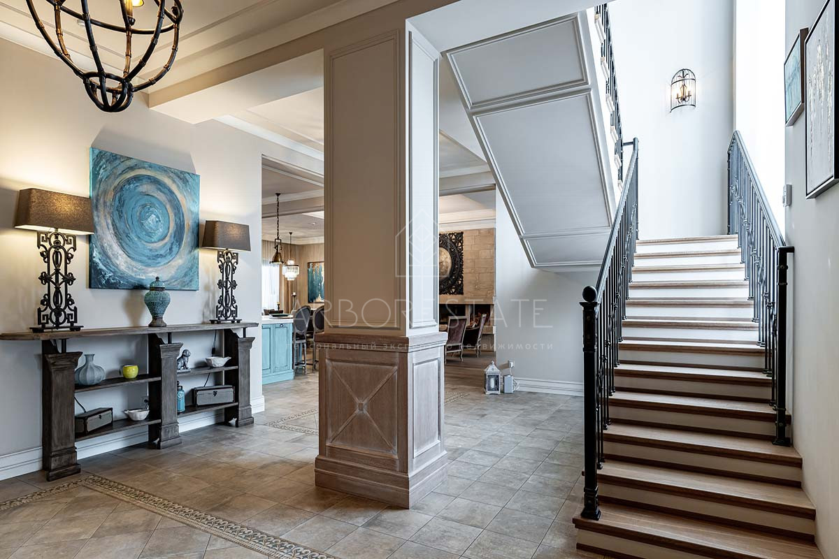 Отделка дома выполнена с использованием высококачественных материалов, интерьер оформлен в светлых тонах и дополнен стильной мебелью, предметами декора и техникой от известных брендов.