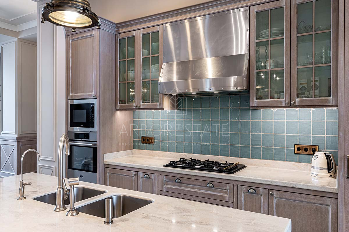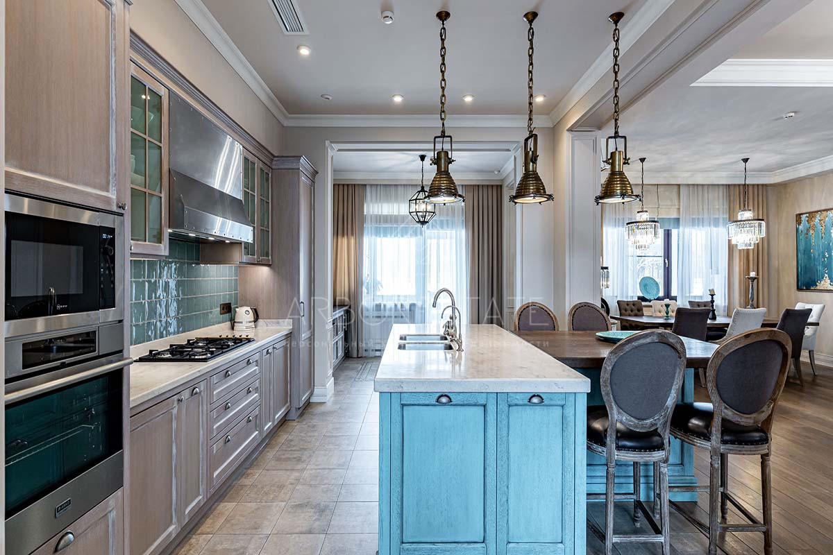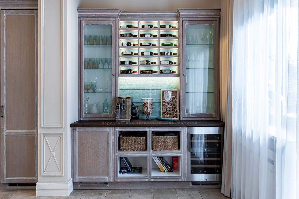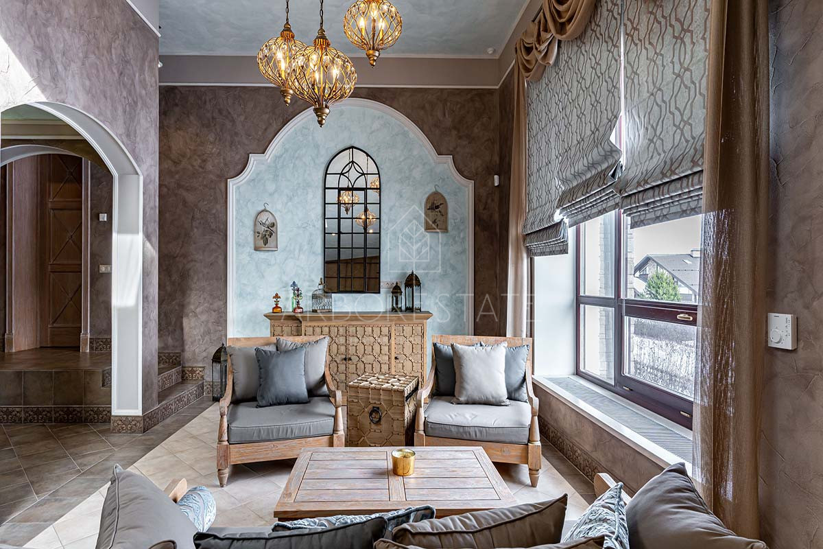 Отделка дома выполнена с использованием высококачественных материалов, интерьер оформлен в светлых тонах и дополнен стильной мебелью, предметами декора и техникой от известных брендов.