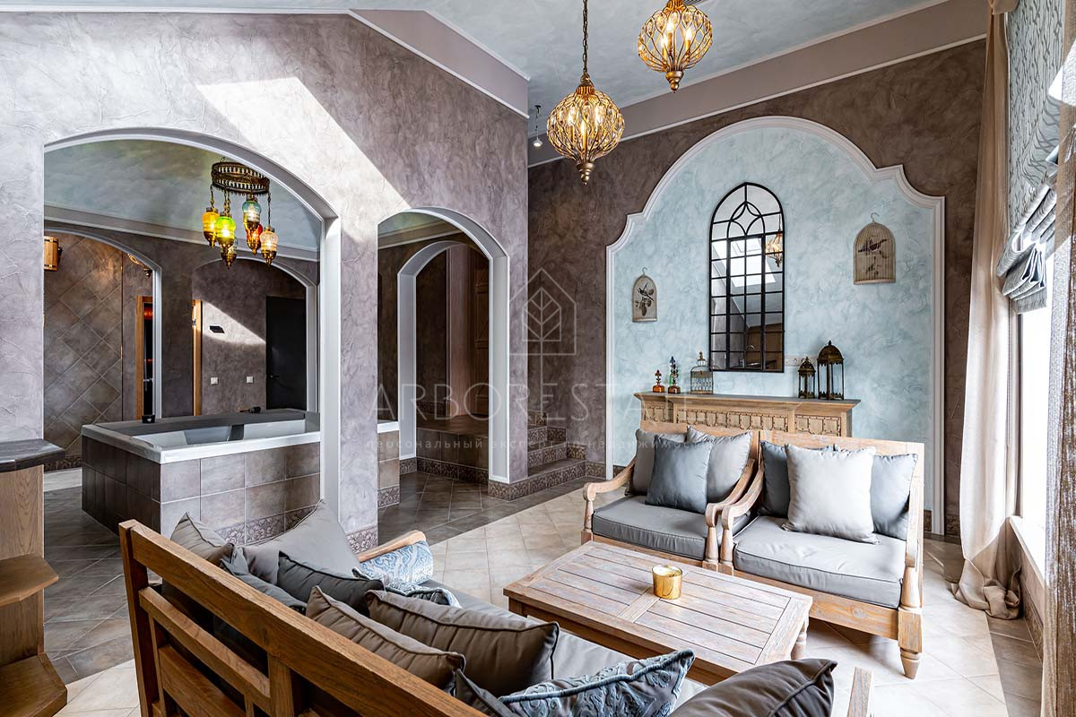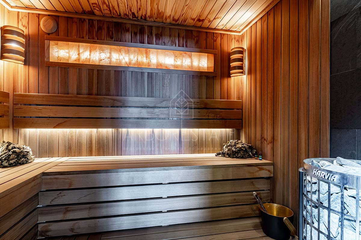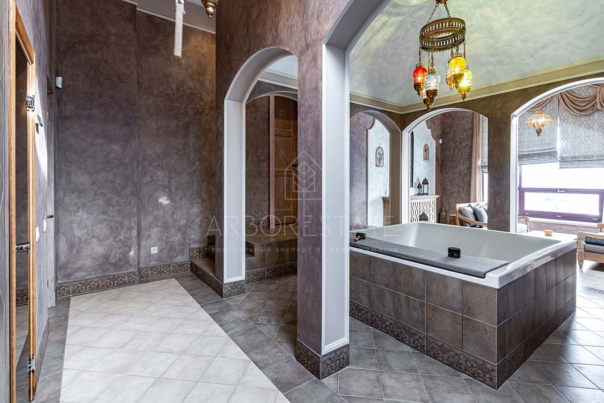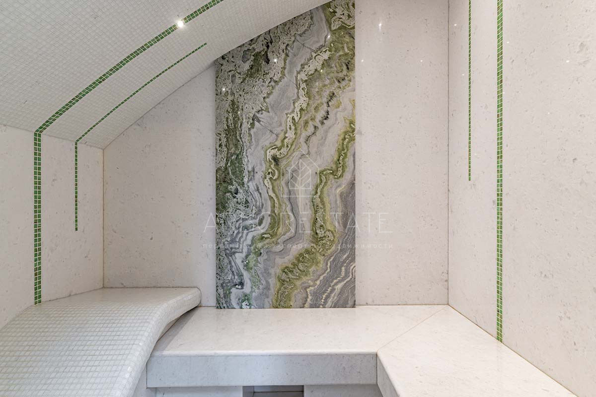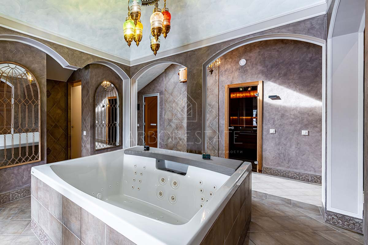 На втором этаже расположены холл, мастер-спальня с гардеробной и санузлом, 2 детские комнаты, санузел, спальня и СПА-зона с сауной, хаммамом и зоной отдыха с мини-баром.