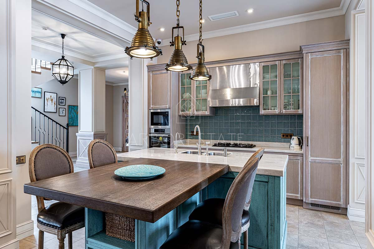 Кухня оснащена встроенной техникой, что делает её не только функциональной, но и стильной. Гостиная с действующим дровяным камином и выходом на летнюю террасу создаёт атмосферу уюта и тепла, становясь прекрасным местом для общения с родными и близкими. Для удобства имеется отдельный вход в блок для персонала.
