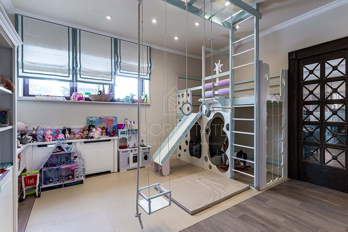 На первом этаже находятся холл, гардеробная, кухня, столовая, гостиная, спальня с ванной, детская игровая комната, санузел, постирочная, комната для обслуживающего персонала с санузлом, котельная, кладовая и гараж на 2 автомобиля.