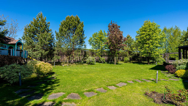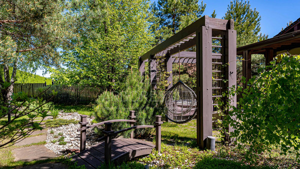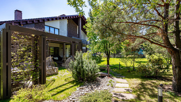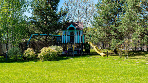 На участке выполнен ландшафтный дизайн, оборудован каскадный ручей, гриль-комплекс для барбекю, детская площадка и собственная скважина.