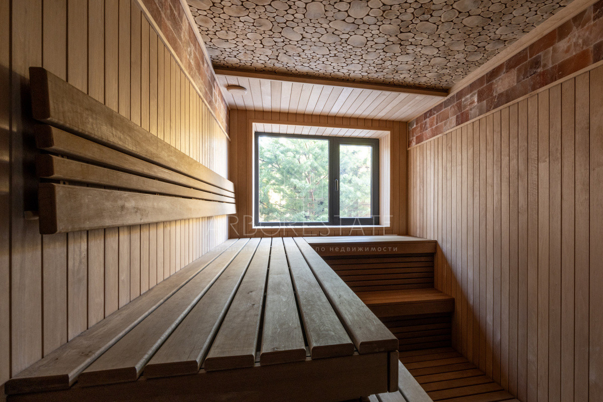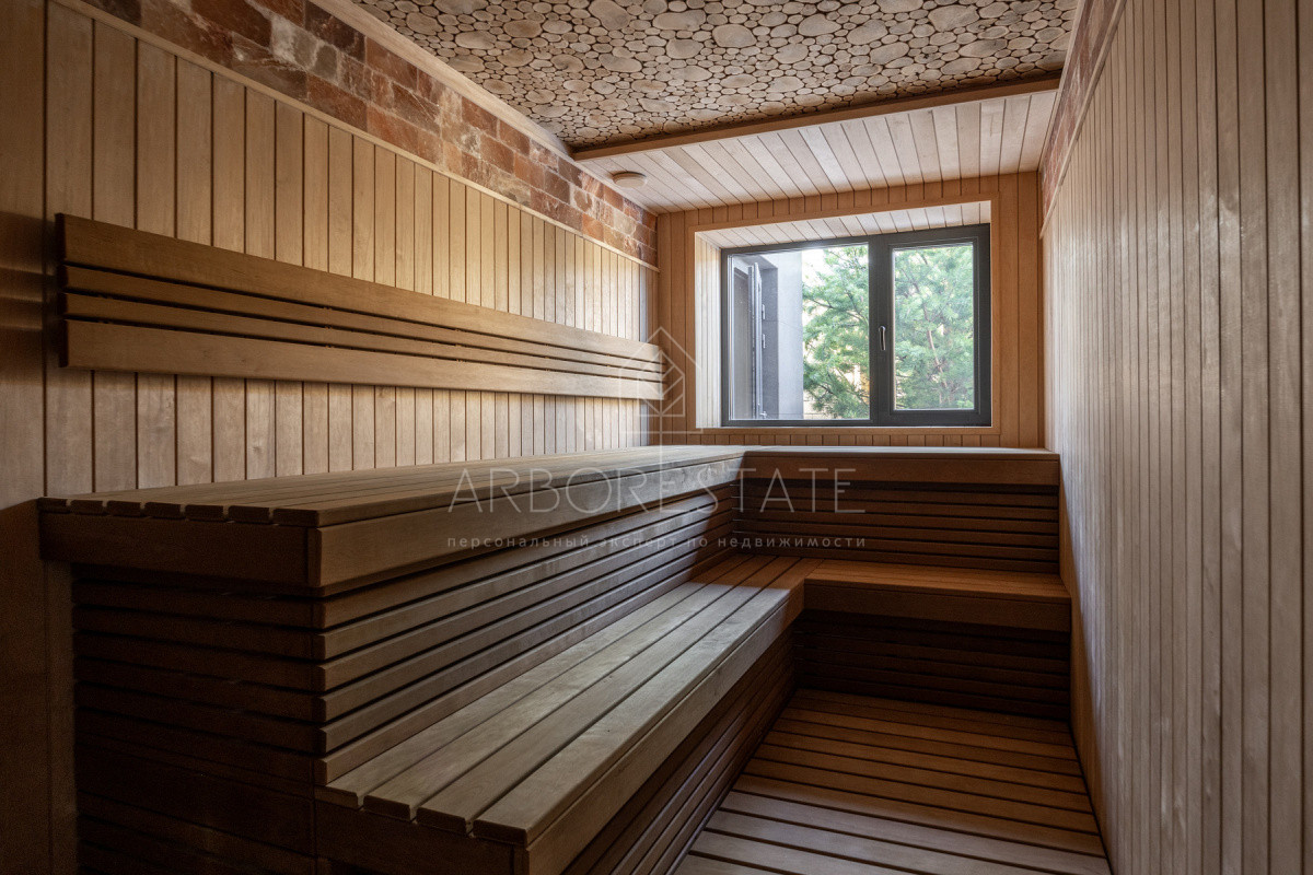 1 этаж: прихожая, холл, гардеробная, гостиная-столовая-кухня с выходом в приватную часть участка, гостевой санузел, гостевая спальня с санузлом, гардеробная, постирочная, СПА-зона с сауной, душевой и комнатой отдыха, постирочная, блок для персонала, гараж на 2 автомобиля.