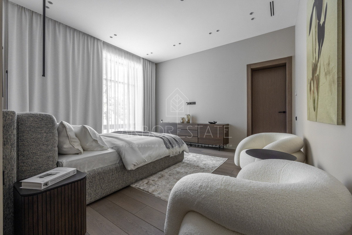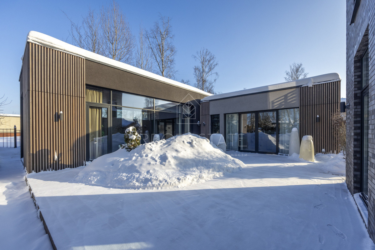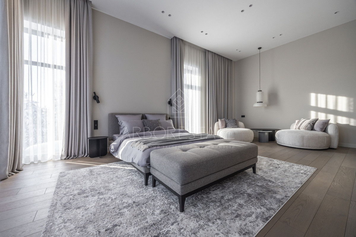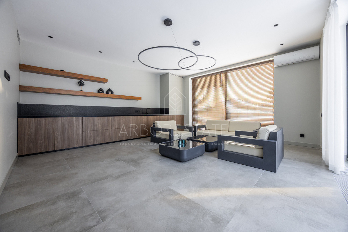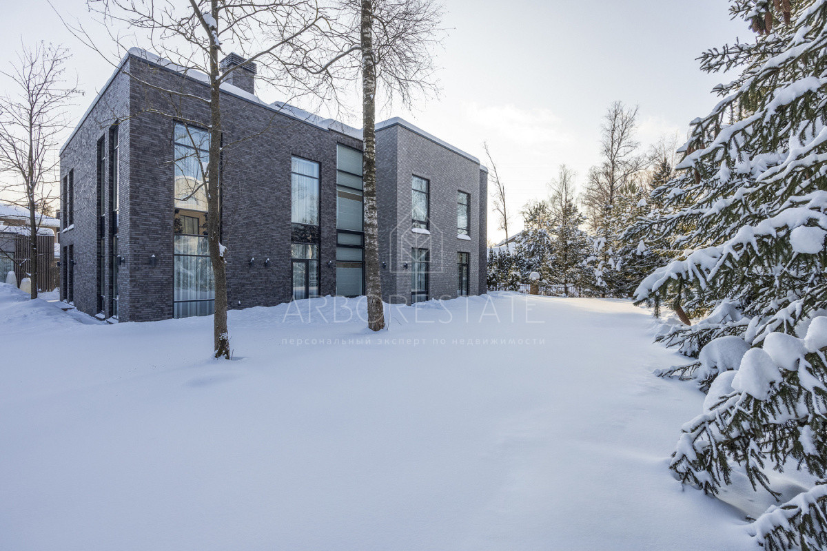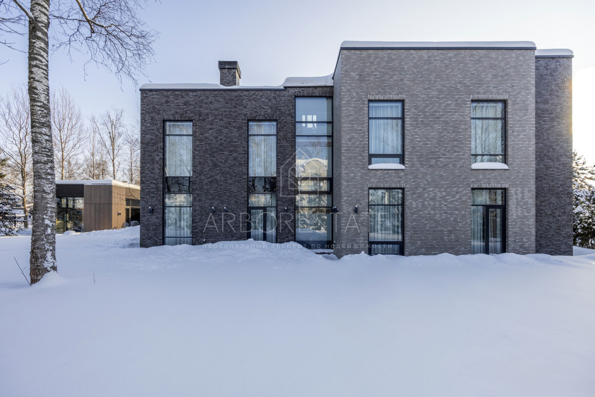 Дом меблирован. Построен в современном стиле со строгими и лаконичными фасадами. Эксплуатируемая кровля (275,74 кв.м.) позволяет создать зону для отдыха на свежем воздухе.