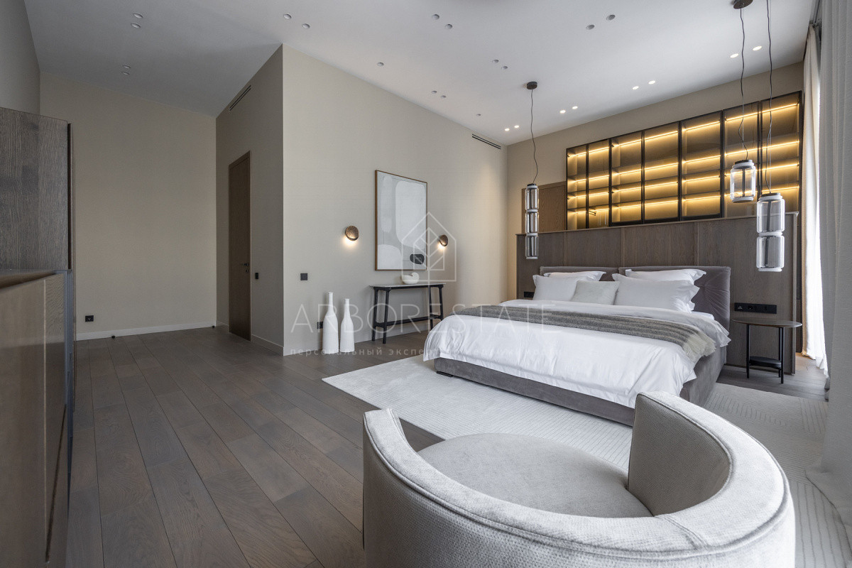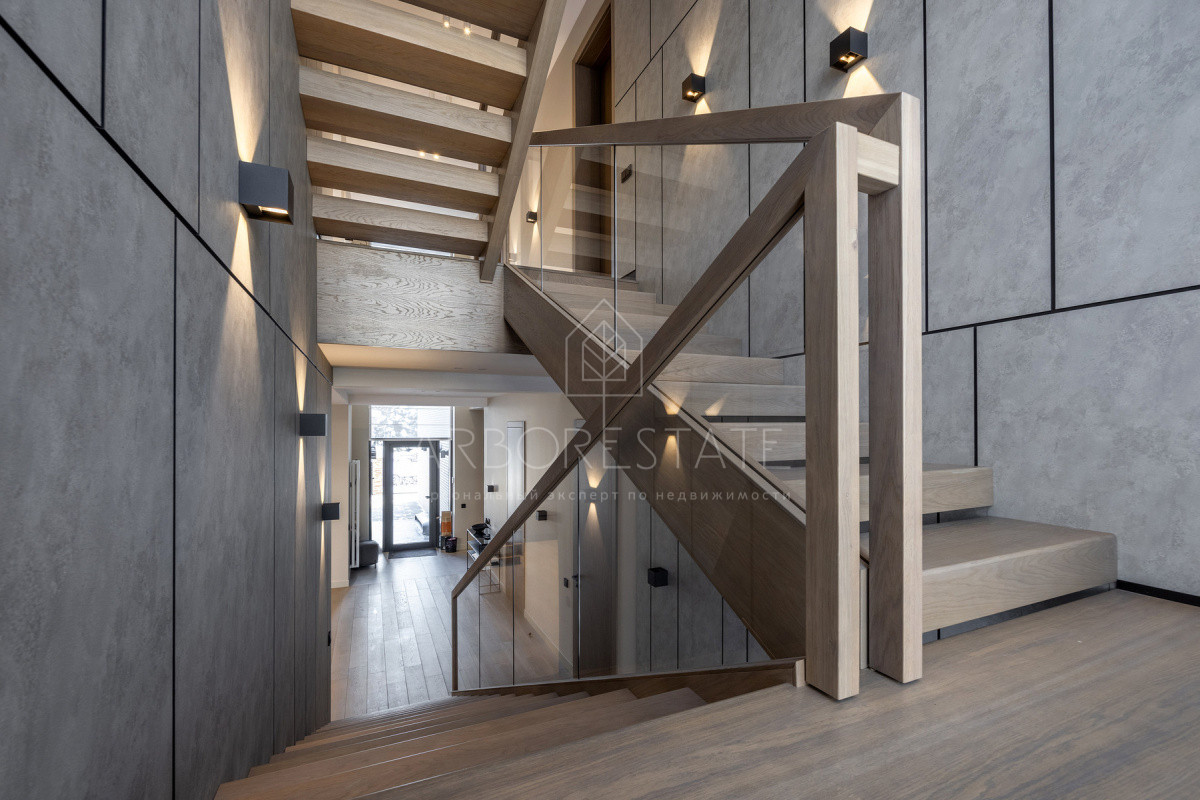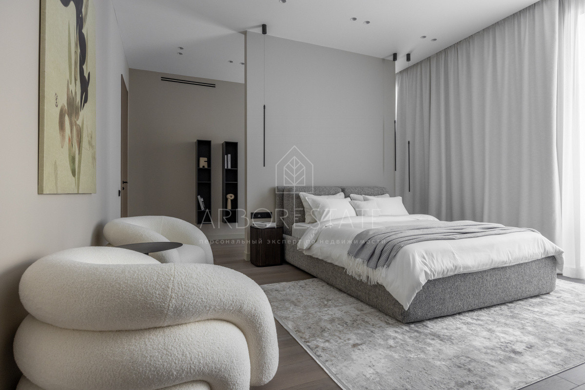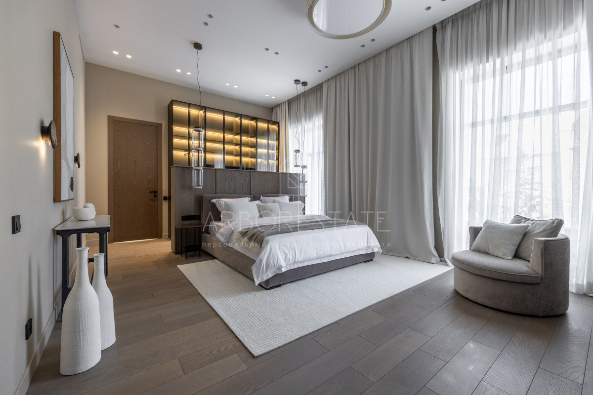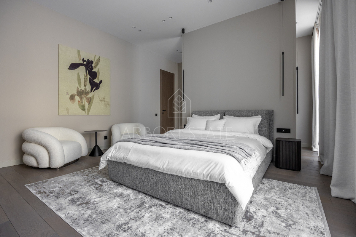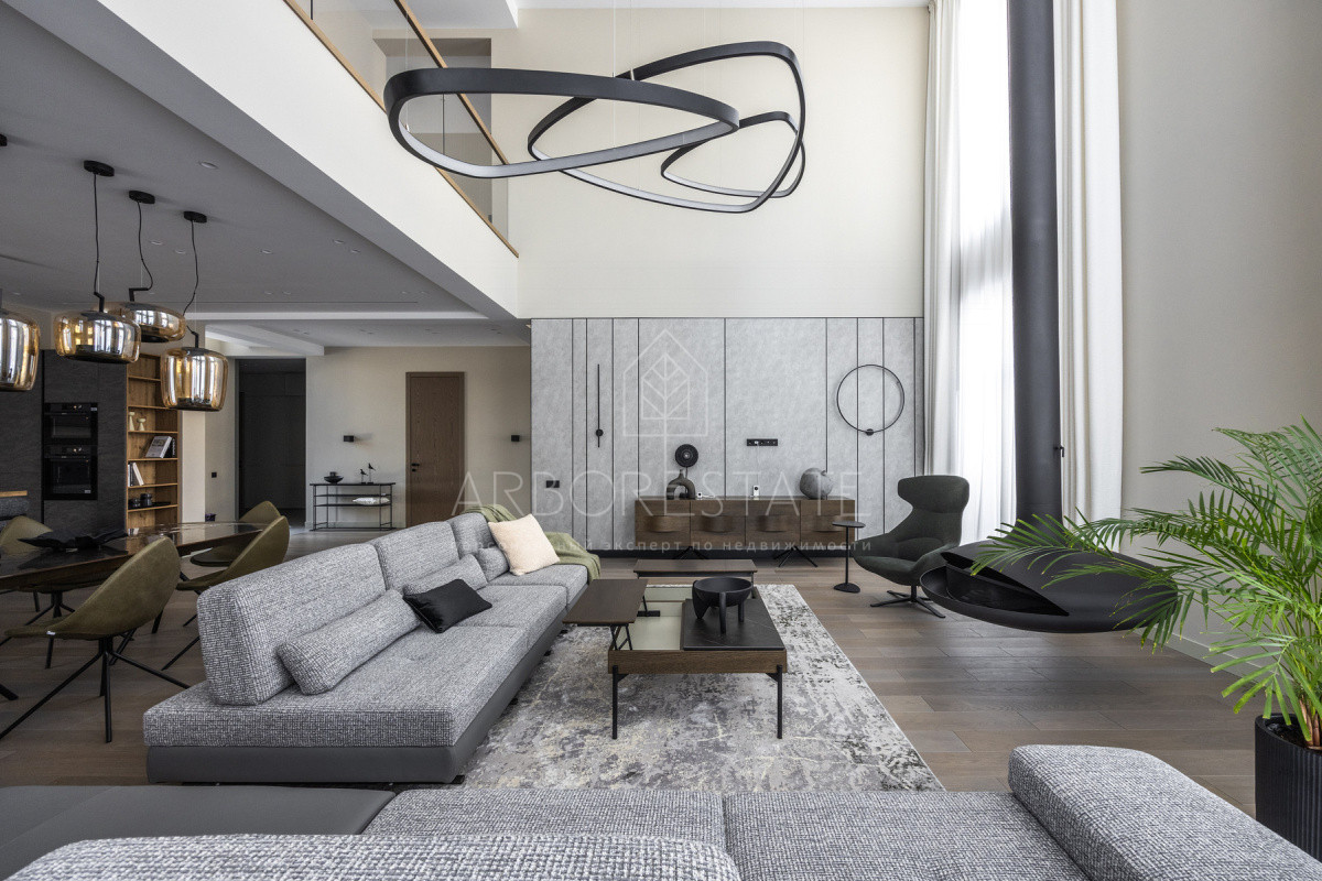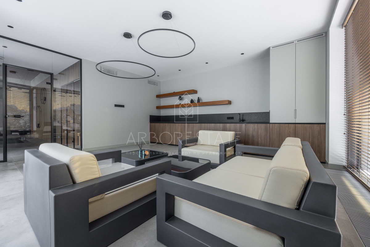 Дом меблирован. Построен в современном стиле со строгими и лаконичными фасадами. Эксплуатируемая кровля (275,74 кв.м.) позволяет создать зону для отдыха на свежем воздухе.