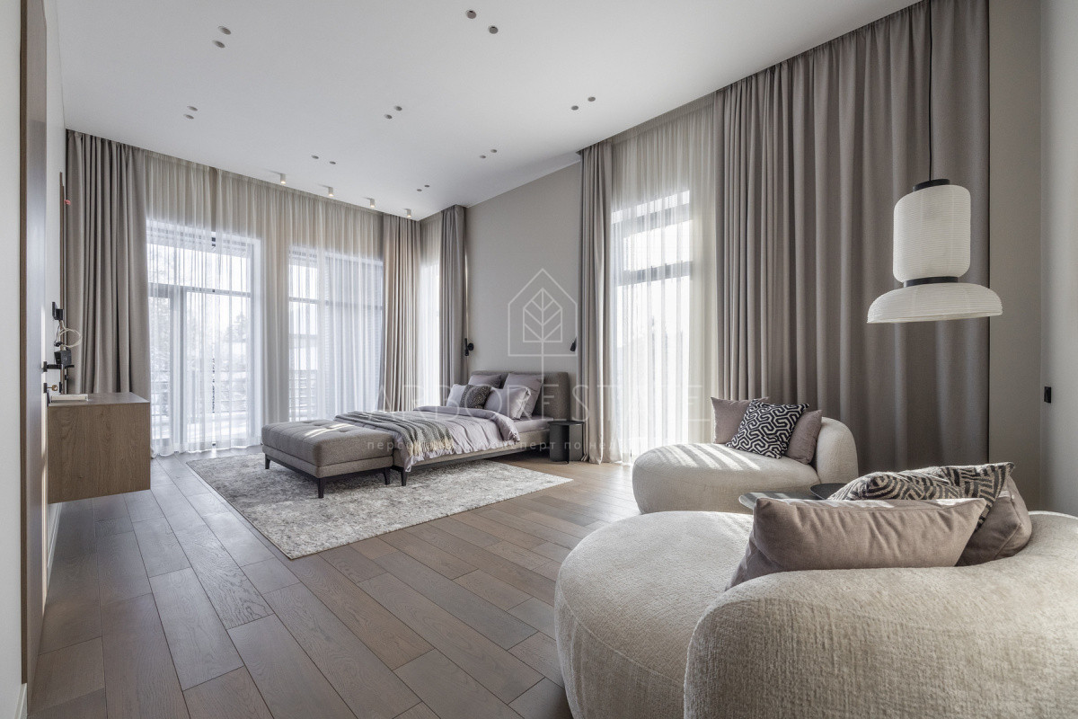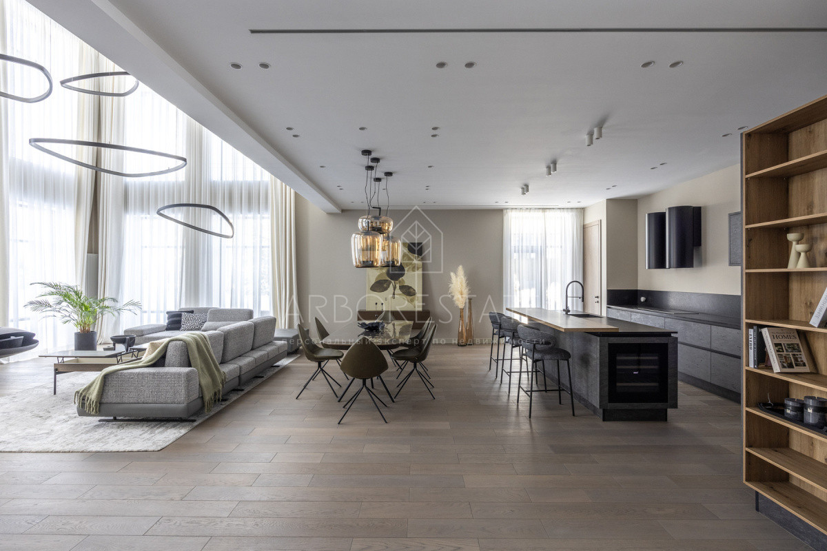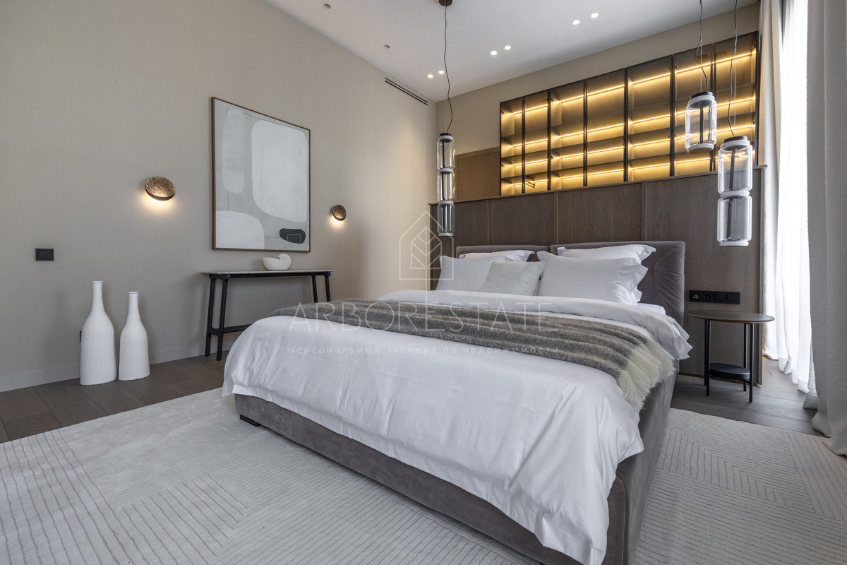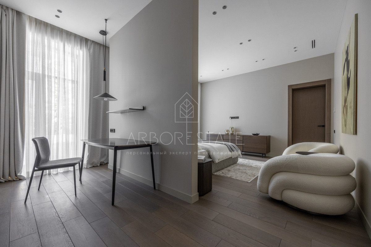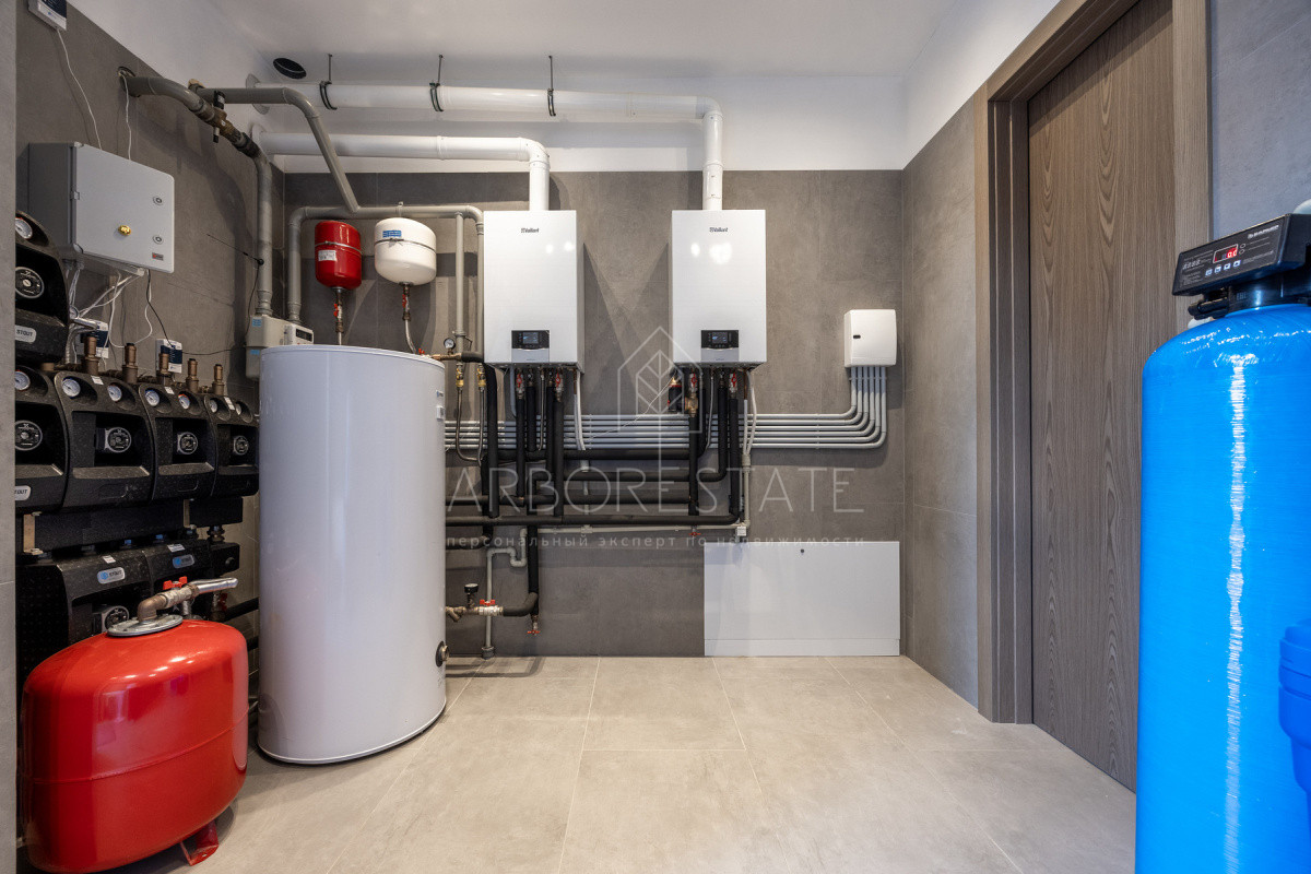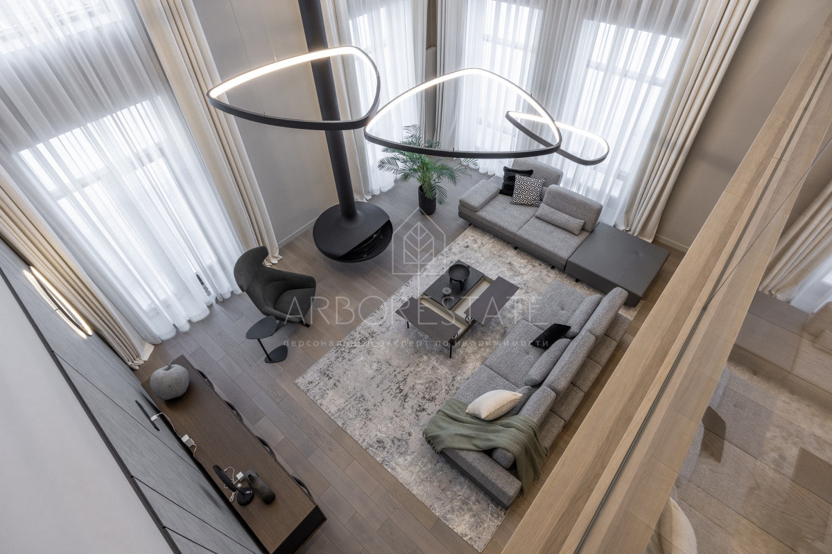 Дом меблирован. Построен в современном стиле со строгими и лаконичными фасадами. Эксплуатируемая кровля (275,74 кв.м.) позволяет создать зону для отдыха на свежем воздухе.