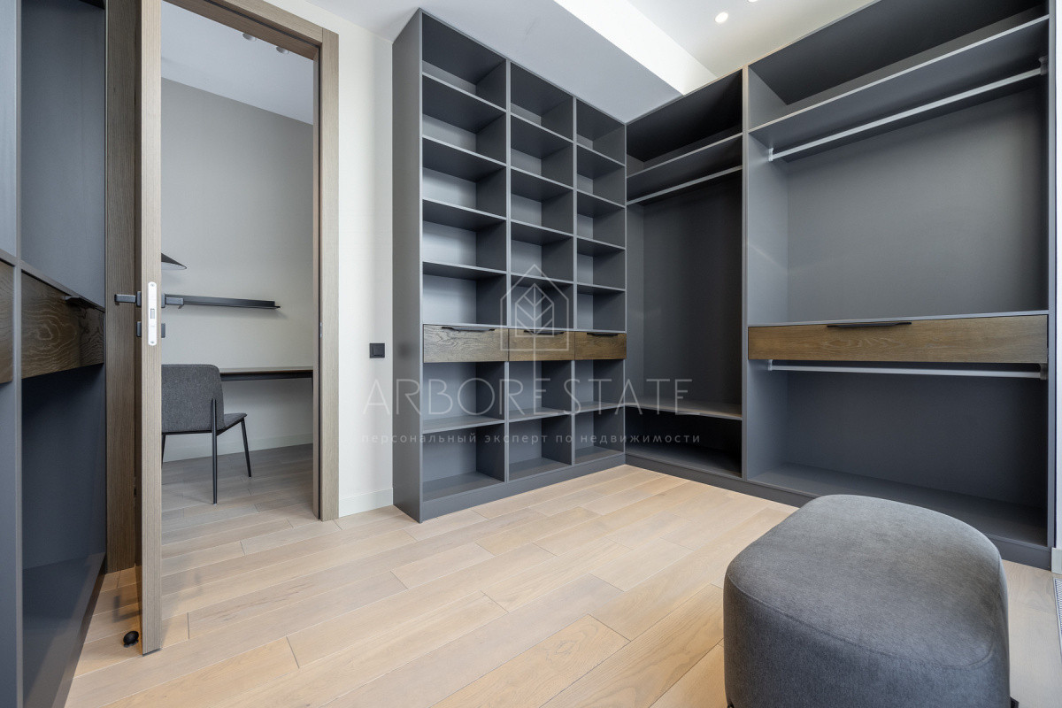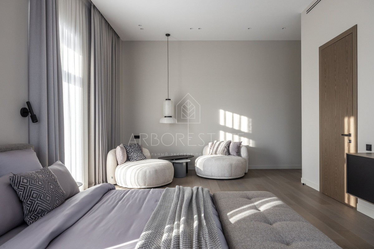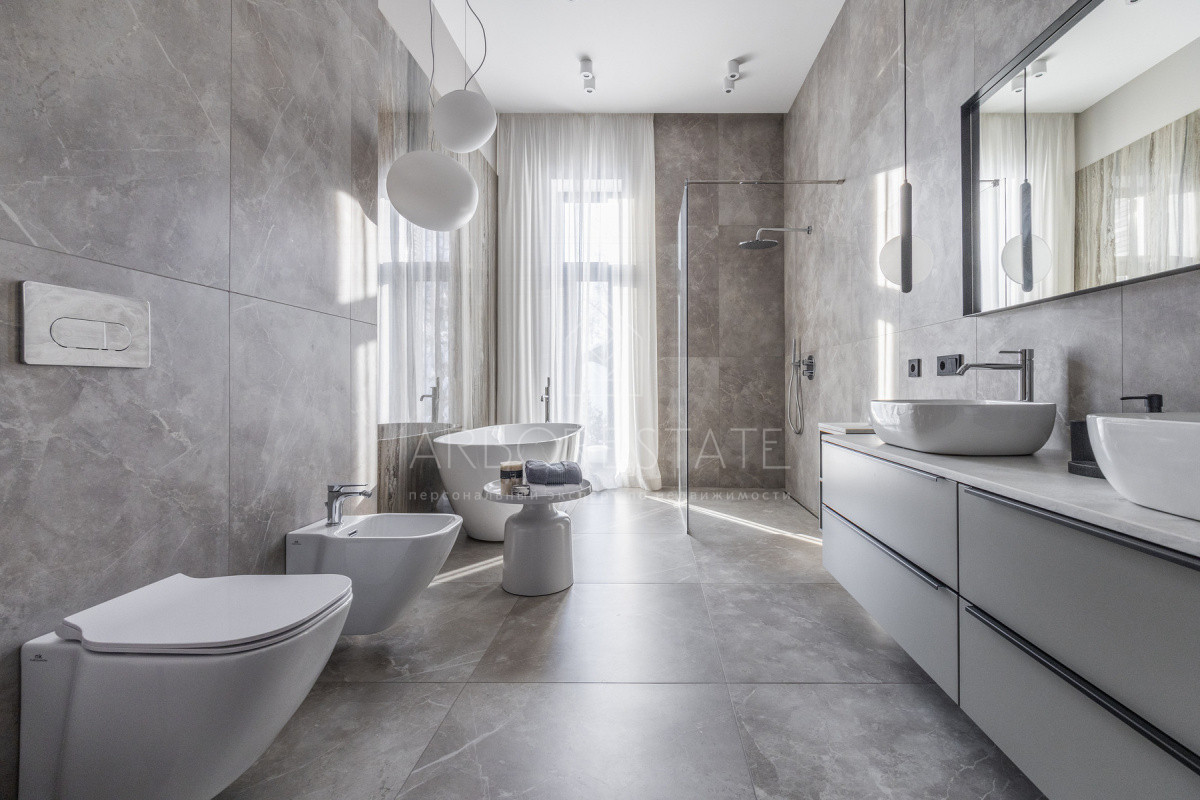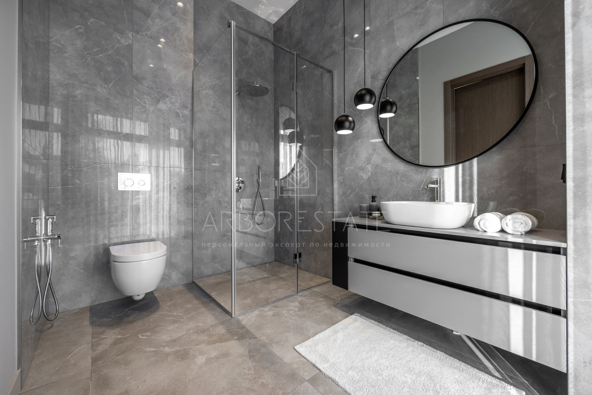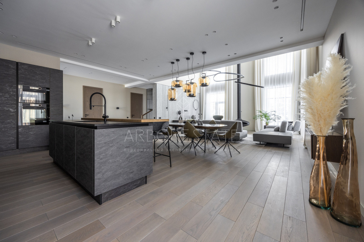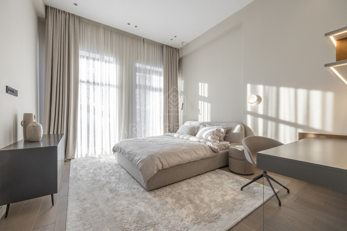 Дом меблирован. Построен в современном стиле со строгими и лаконичными фасадами. Эксплуатируемая кровля (275,74 кв.м.) позволяет создать зону для отдыха на свежем воздухе.