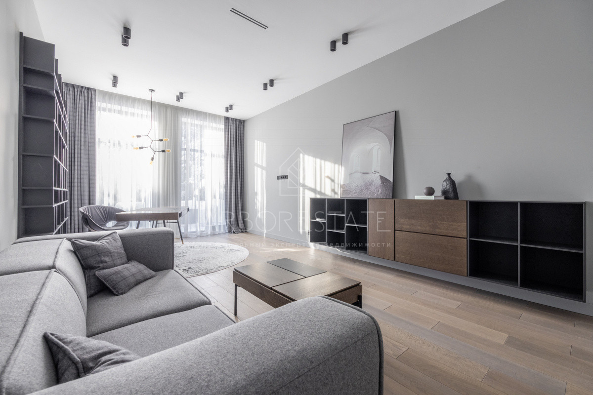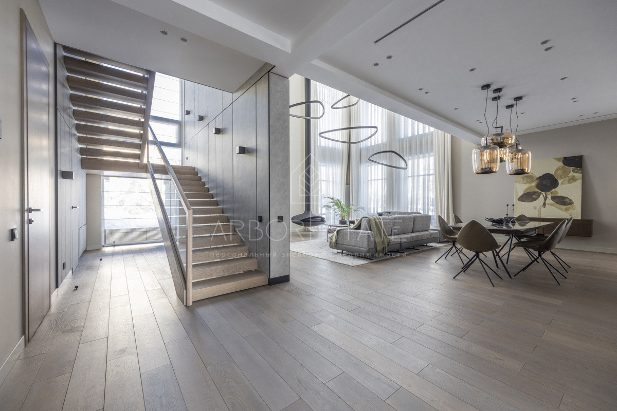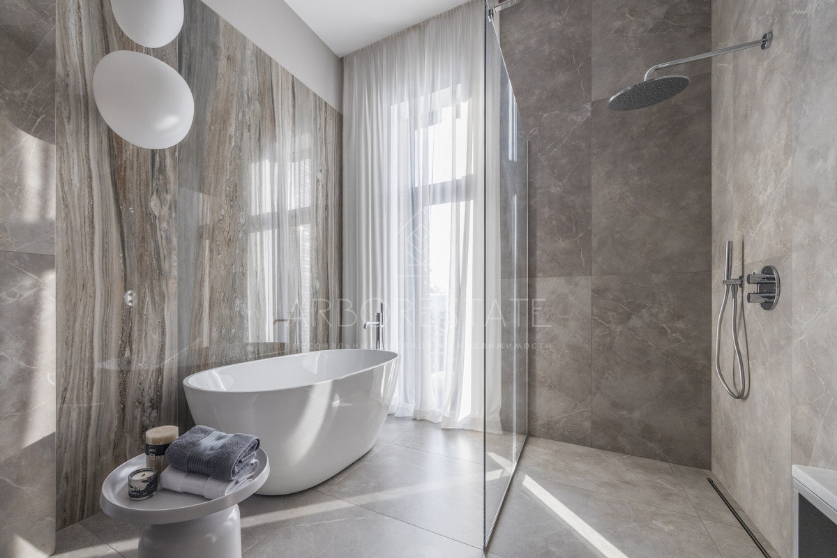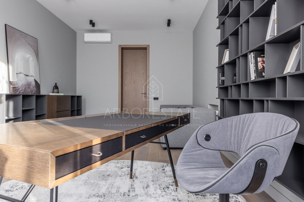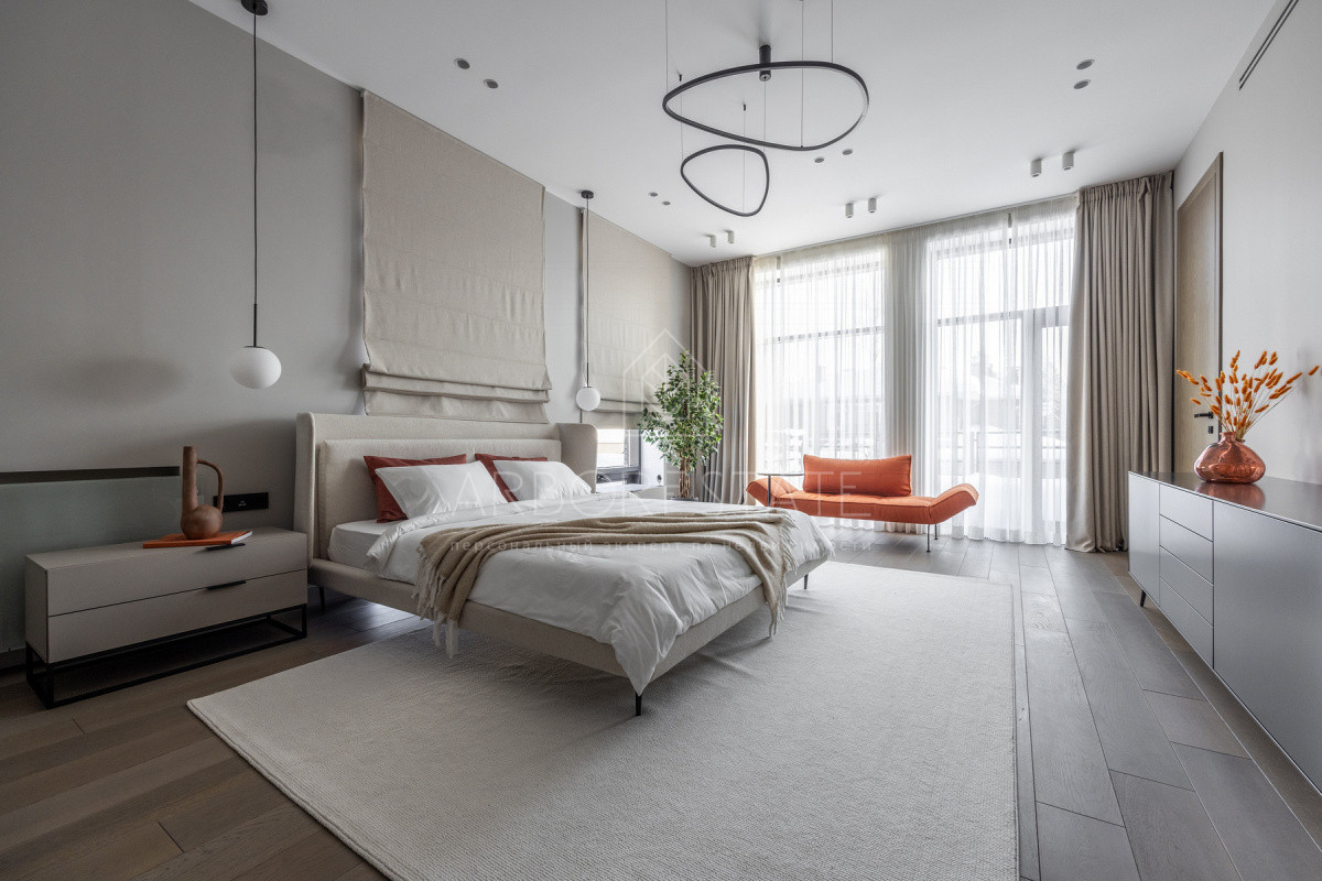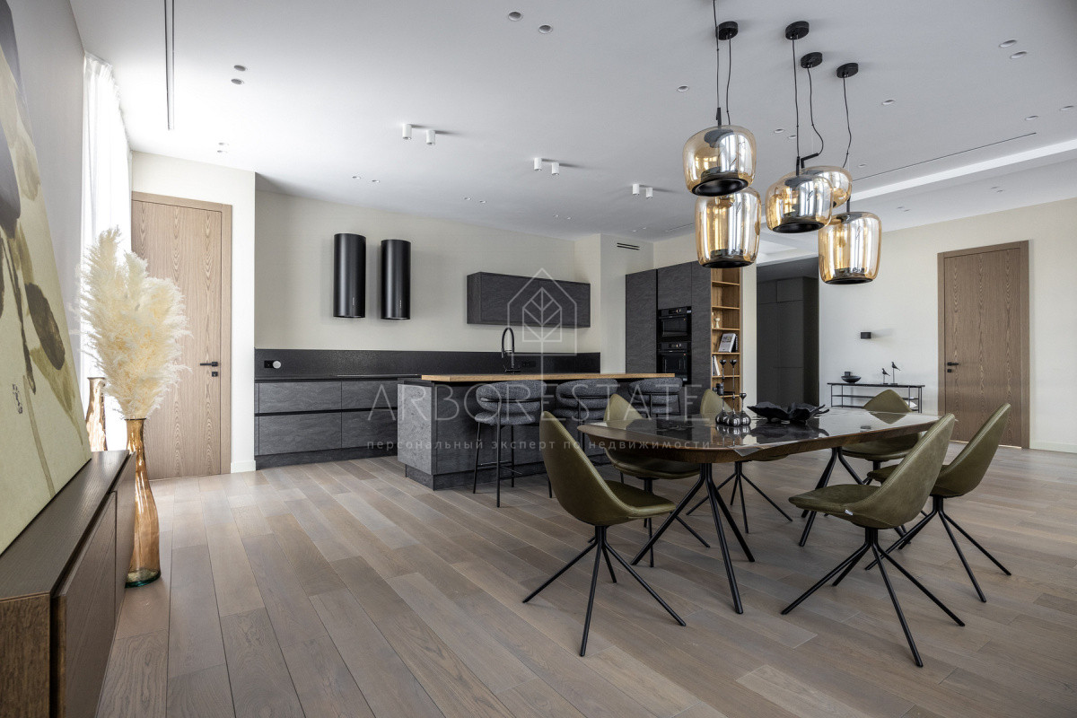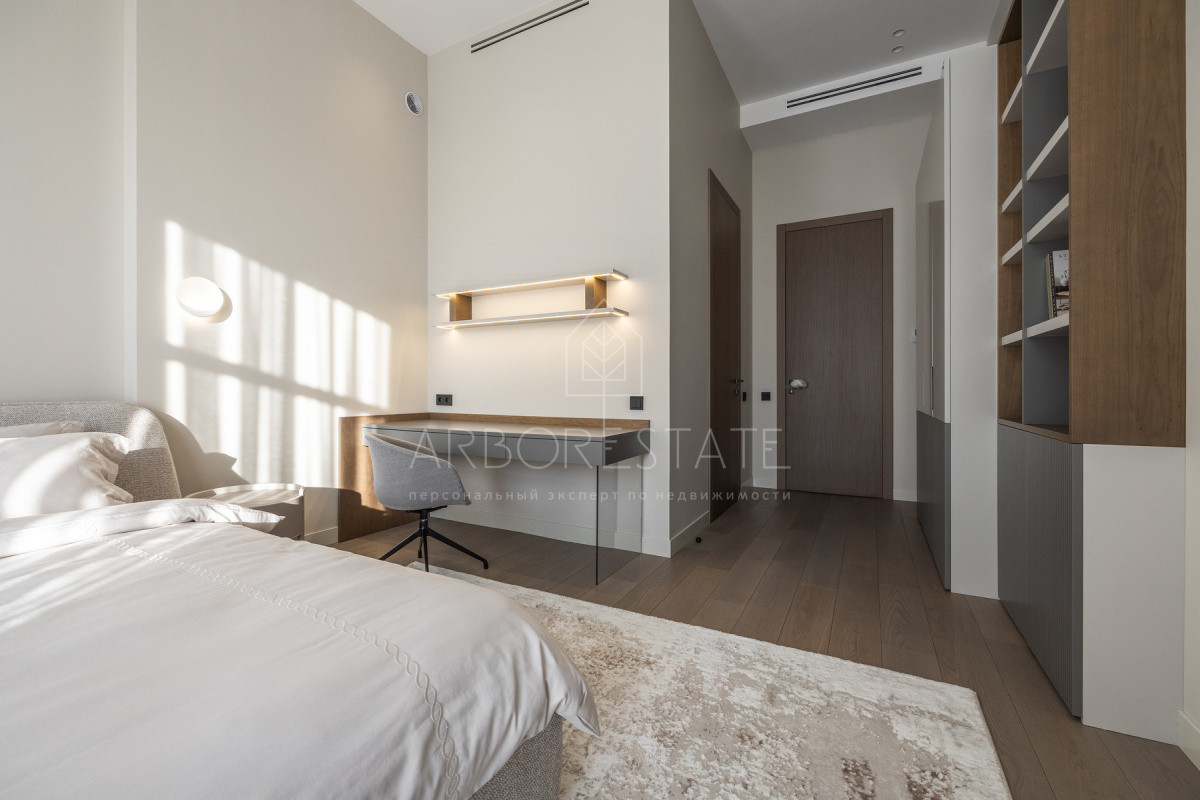 Дом меблирован. Построен в современном стиле со строгими и лаконичными фасадами. Эксплуатируемая кровля (275,74 кв.м.) позволяет создать зону для отдыха на свежем воздухе.