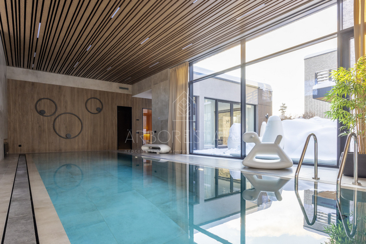 1 этаж: Холл, гардеробная, кухня-столовая-гостиная, гостевая спальня с санузлом и гардеробной, кабинет, бассейн, сауна, с/у, комната отдыха, блок персонала (спальня, с/у), котельная, гараж
