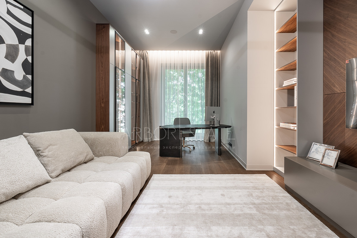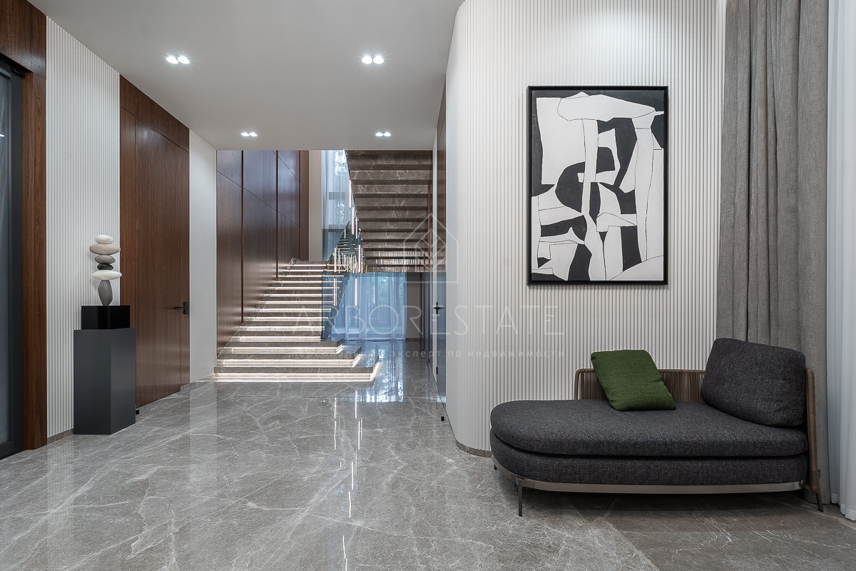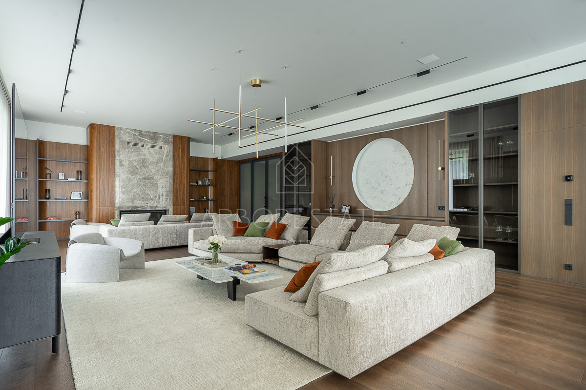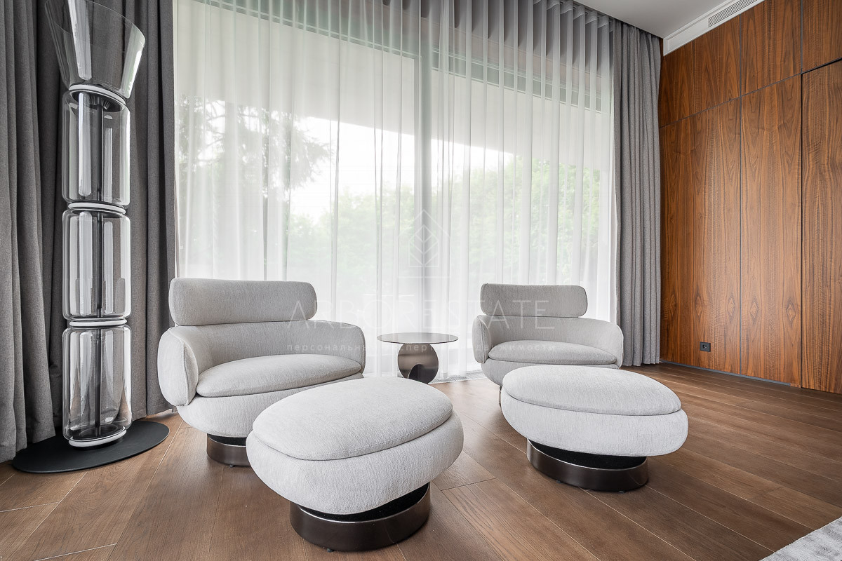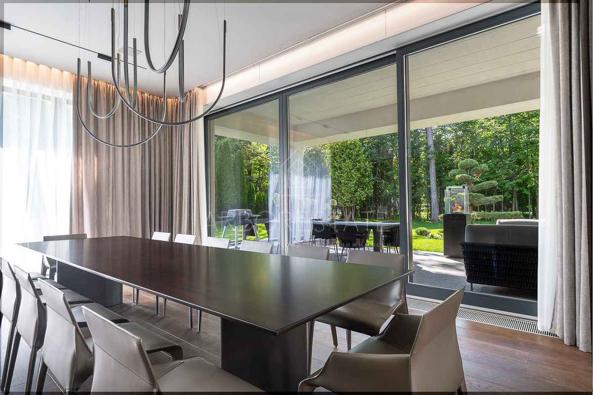 Коттедж имеет общую площадь 1256 м2 и располагается на приватном лесном участке. В доме: пять спален со своими гардеробными комнатами и санузлами, кухня, столовая и гостиная с камином, несколько открытых балконов и террас, квартира для персонала, гараж на три автомобиля, зона СПА с сауной, переливной бассейн, подсобные и обслуживающие помещения, включая рабочую кухню, постирочную. В отделке использовались высоко качественные натуральные материалы, мрамор, дерево, мебель известных Итальянских брендов: Minotti, Paltrona Frau, Poliform, Porada. Бытовая кухонная техника Miele, стиральное и сушильное оборудование Asco.