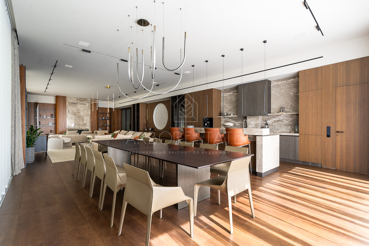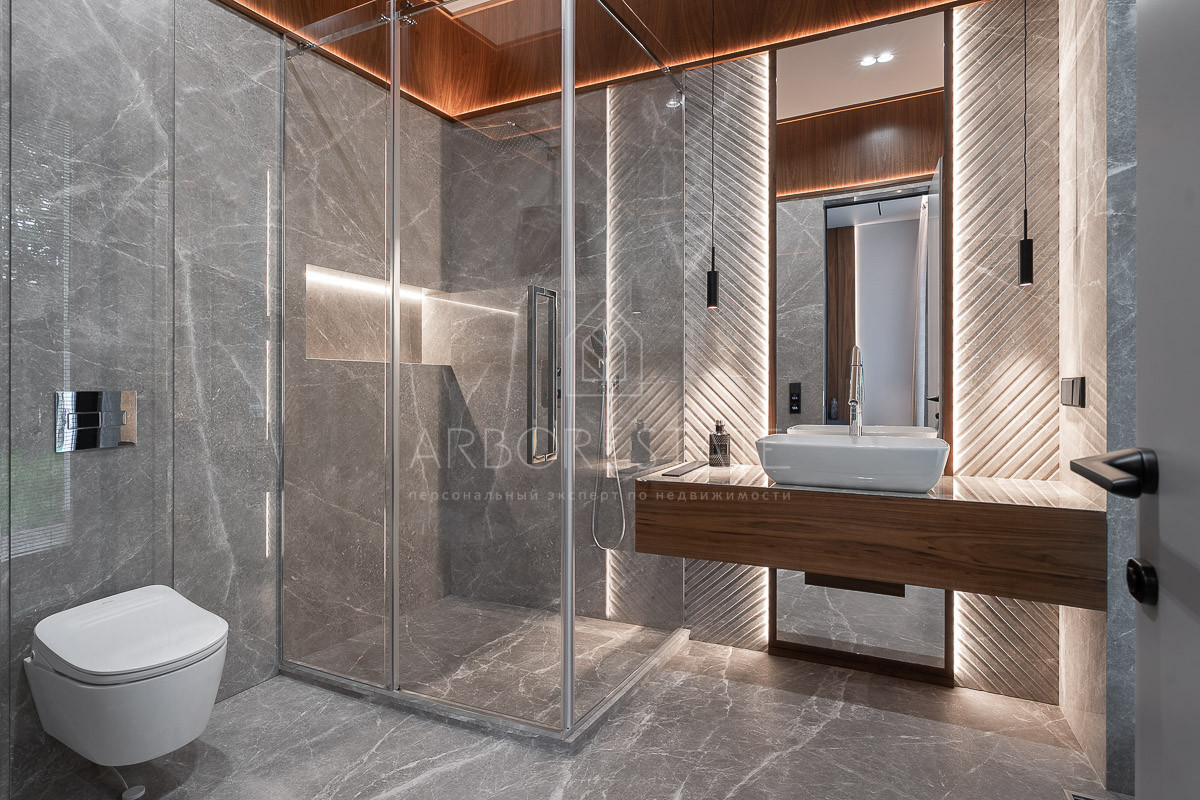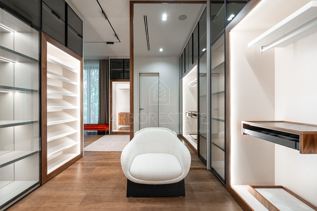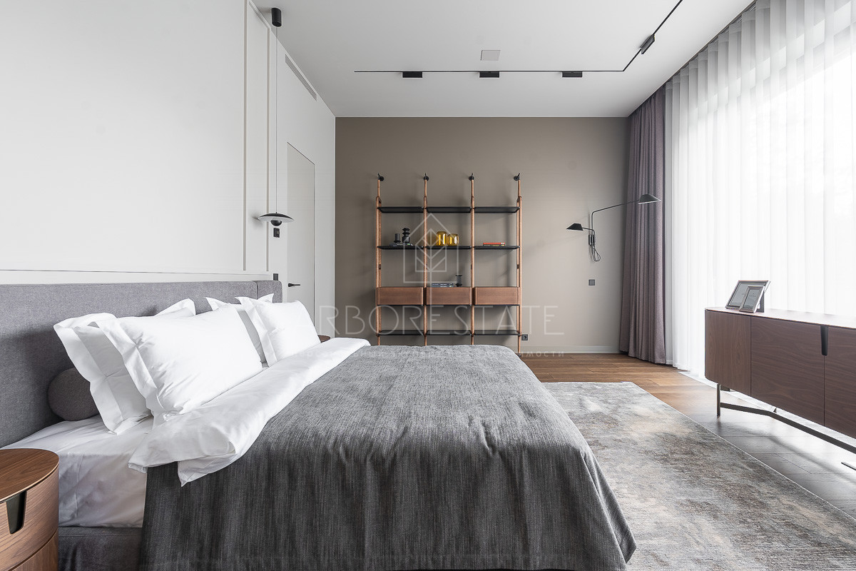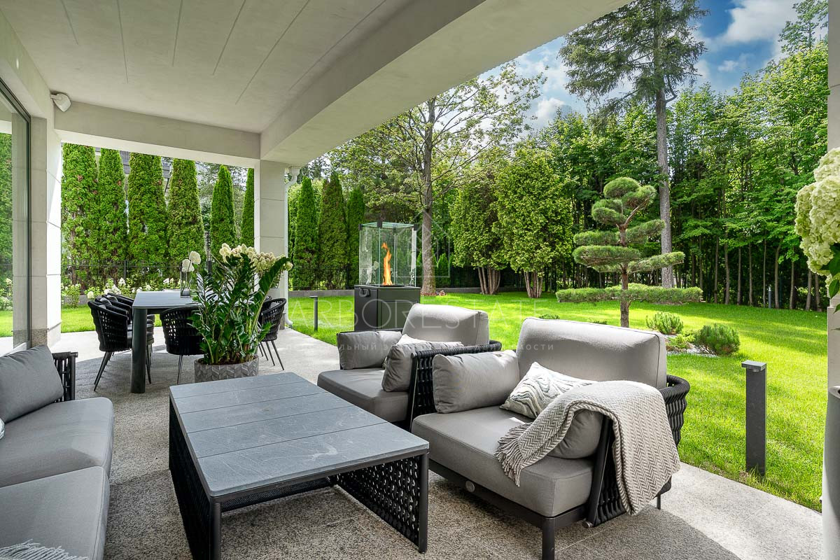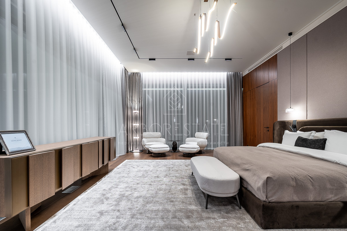 Коттедж имеет общую площадь 1256 м2 и располагается на приватном лесном участке. В доме: пять спален со своими гардеробными комнатами и санузлами, кухня, столовая и гостиная с камином, несколько открытых балконов и террас, квартира для персонала, гараж на три автомобиля, зона СПА с сауной, переливной бассейн, подсобные и обслуживающие помещения, включая рабочую кухню, постирочную. В отделке использовались высоко качественные натуральные материалы, мрамор, дерево, мебель известных Итальянских брендов: Minotti, Paltrona Frau, Poliform, Porada. Бытовая кухонная техника Miele, стиральное и сушильное оборудование Asco.