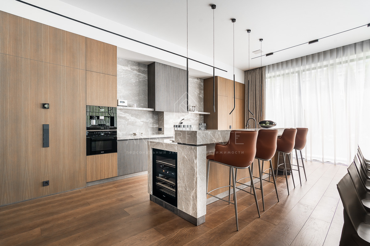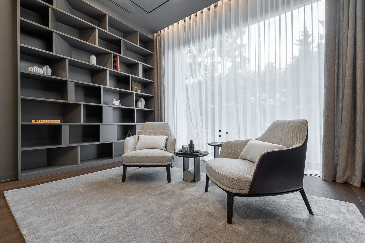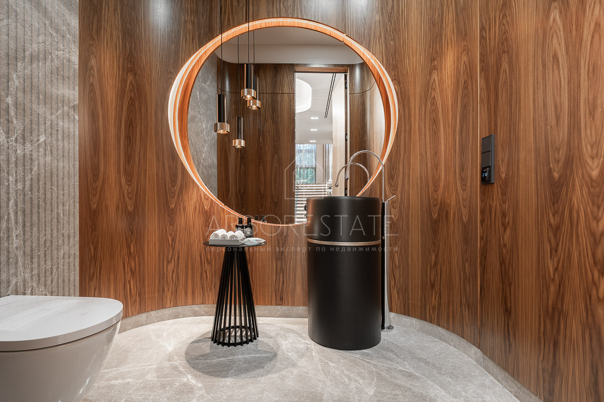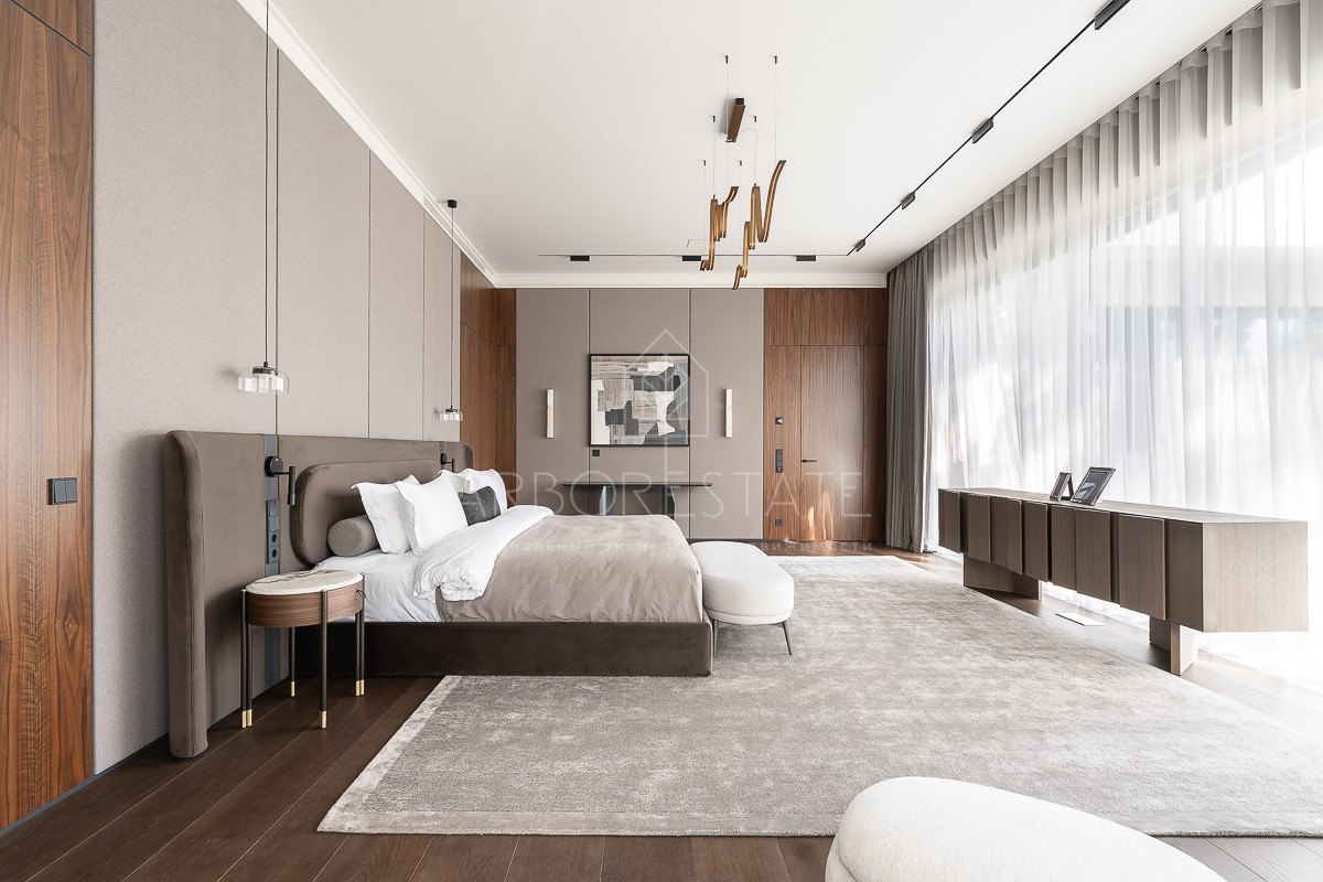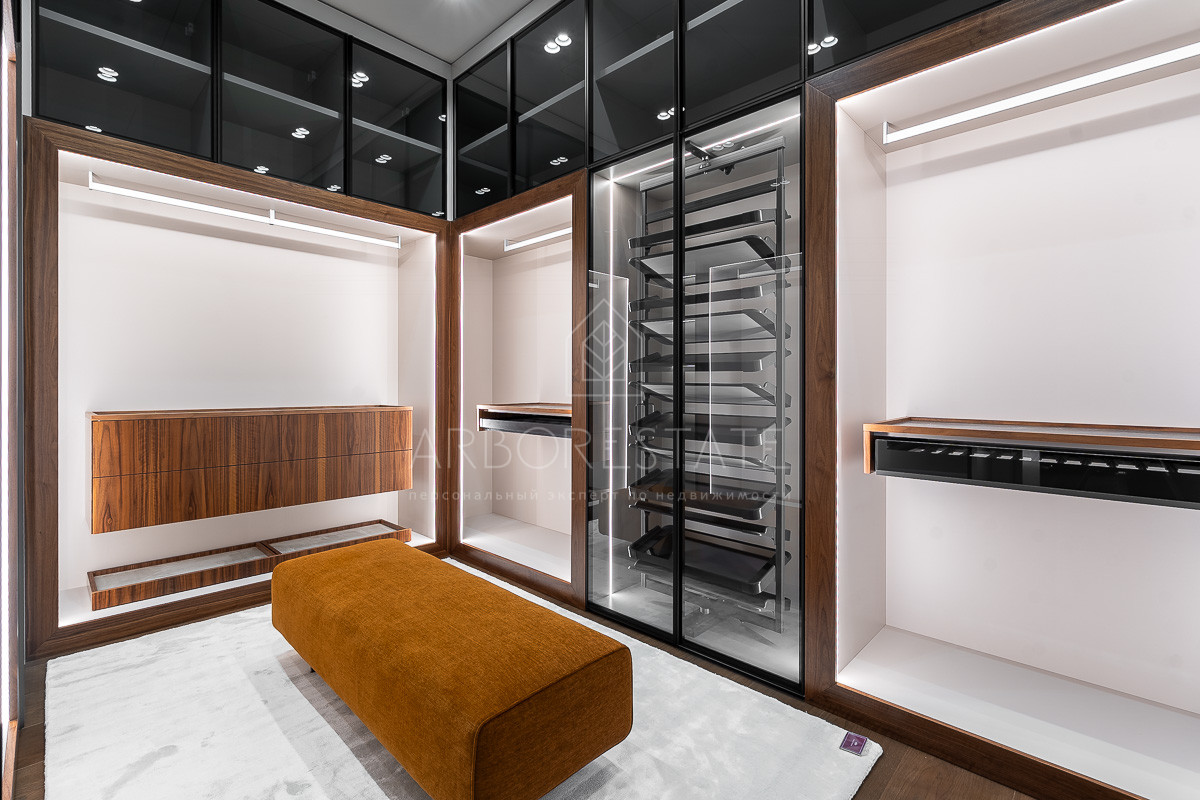 Коттедж имеет общую площадь 1256 м2 и располагается на приватном лесном участке. В доме: пять спален со своими гардеробными комнатами и санузлами, кухня, столовая и гостиная с камином, несколько открытых балконов и террас, квартира для персонала, гараж на три автомобиля, зона СПА с сауной, переливной бассейн, подсобные и обслуживающие помещения, включая рабочую кухню, постирочную. В отделке использовались высоко качественные натуральные материалы, мрамор, дерево, мебель известных Итальянских брендов: Minotti, Paltrona Frau, Poliform, Porada. Бытовая кухонная техника Miele, стиральное и сушильное оборудование Asco.