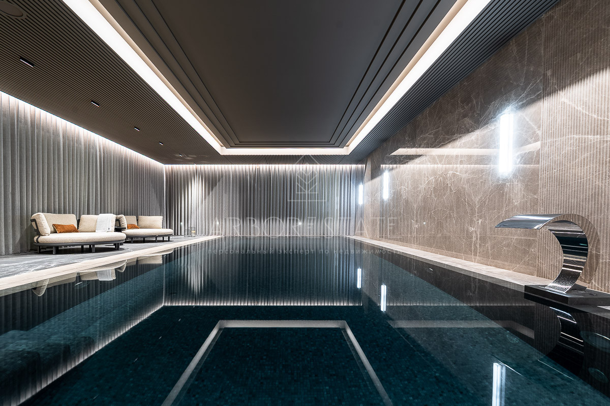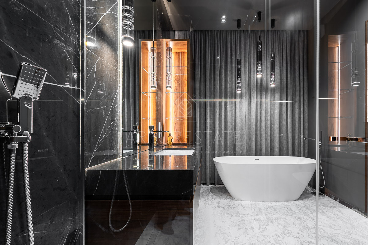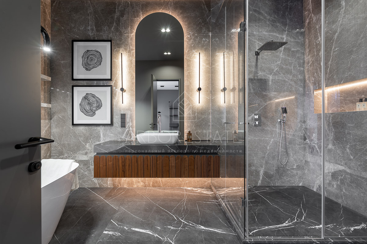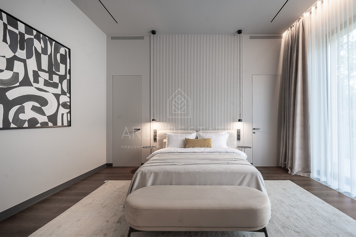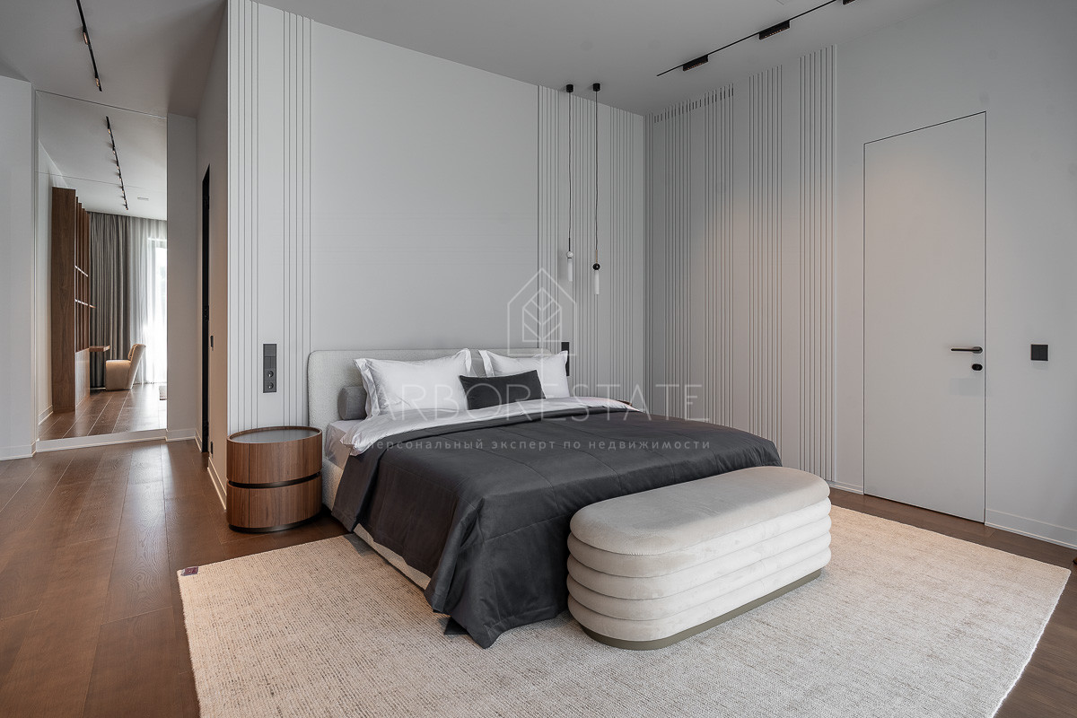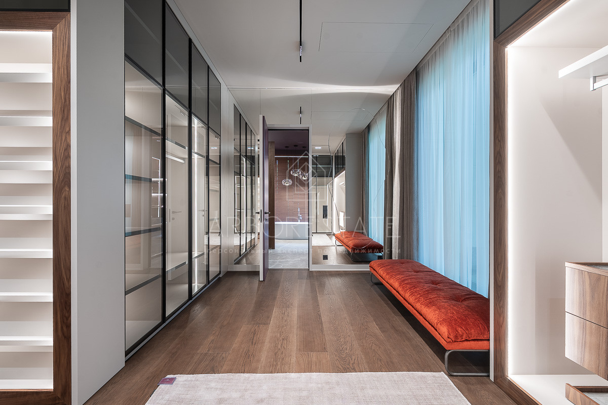 Коттедж имеет общую площадь 1256 м2 и располагается на приватном лесном участке. В доме: пять спален со своими гардеробными комнатами и санузлами, кухня, столовая и гостиная с камином, несколько открытых балконов и террас, квартира для персонала, гараж на три автомобиля, зона СПА с сауной, переливной бассейн, подсобные и обслуживающие помещения, включая рабочую кухню, постирочную. В отделке использовались высоко качественные натуральные материалы, мрамор, дерево, мебель известных Итальянских брендов: Minotti, Paltrona Frau, Poliform, Porada. Бытовая кухонная техника Miele, стиральное и сушильное оборудование Asco.
