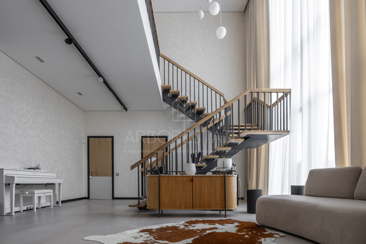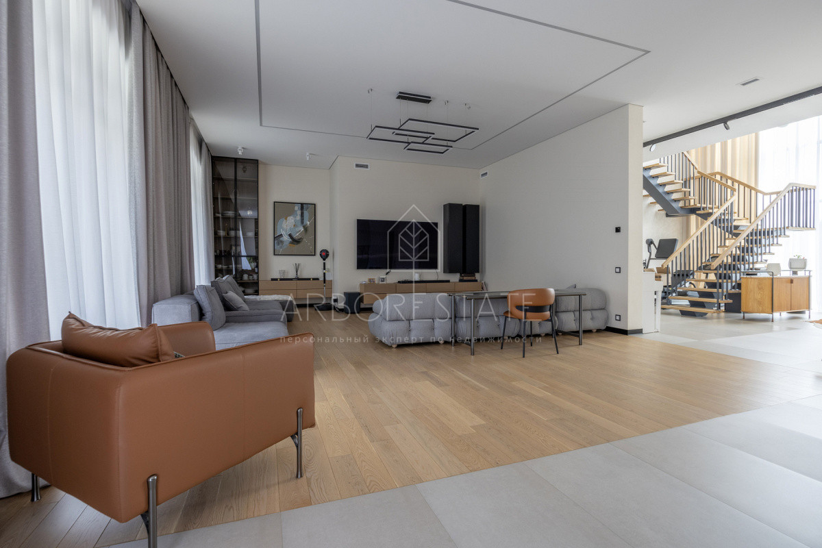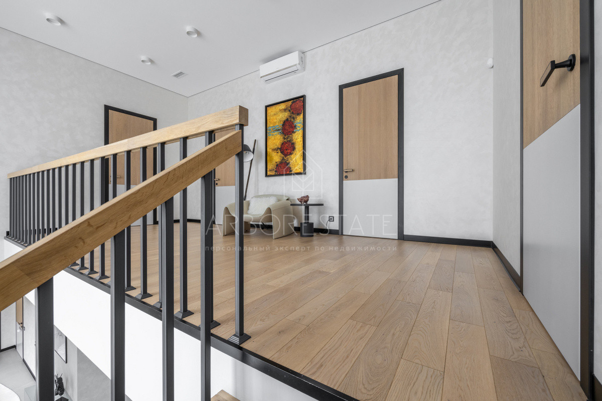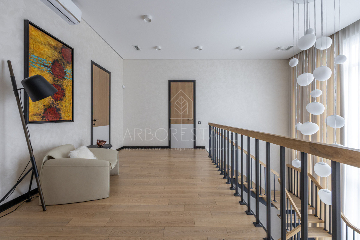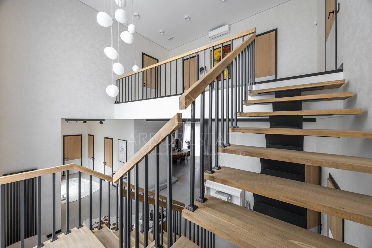 Архитектурной особенностью дома является второй свет в зоне лестницы с высотой потолков до 7 метров, что создает ощущение объема и наполненности пространства. Высота потолков на первом этаже составляет 3,8 метра.