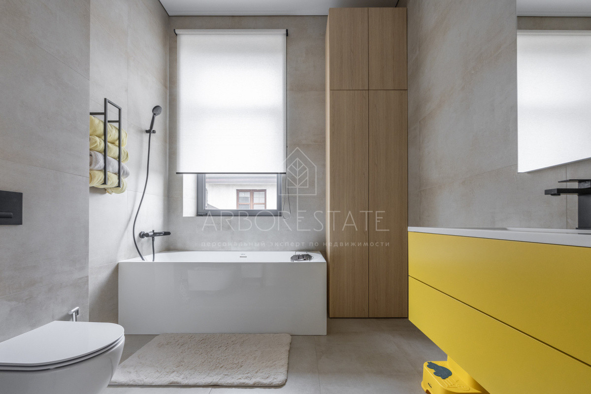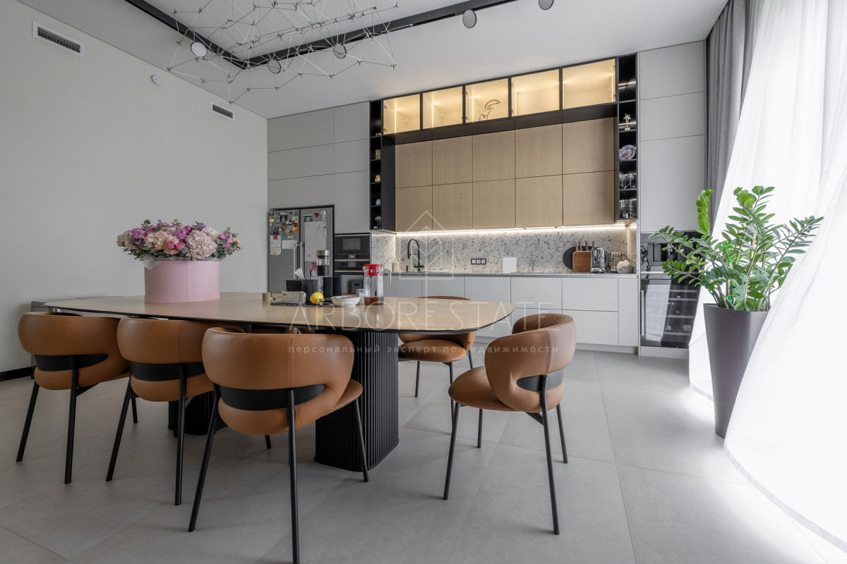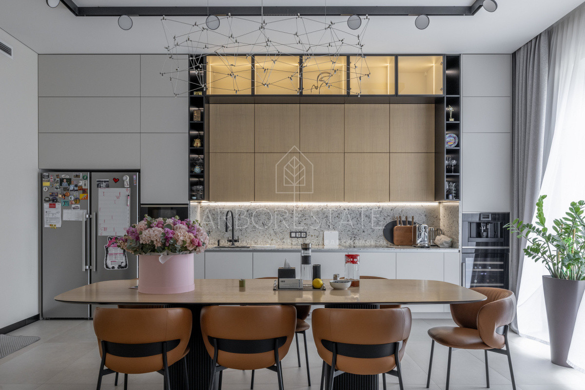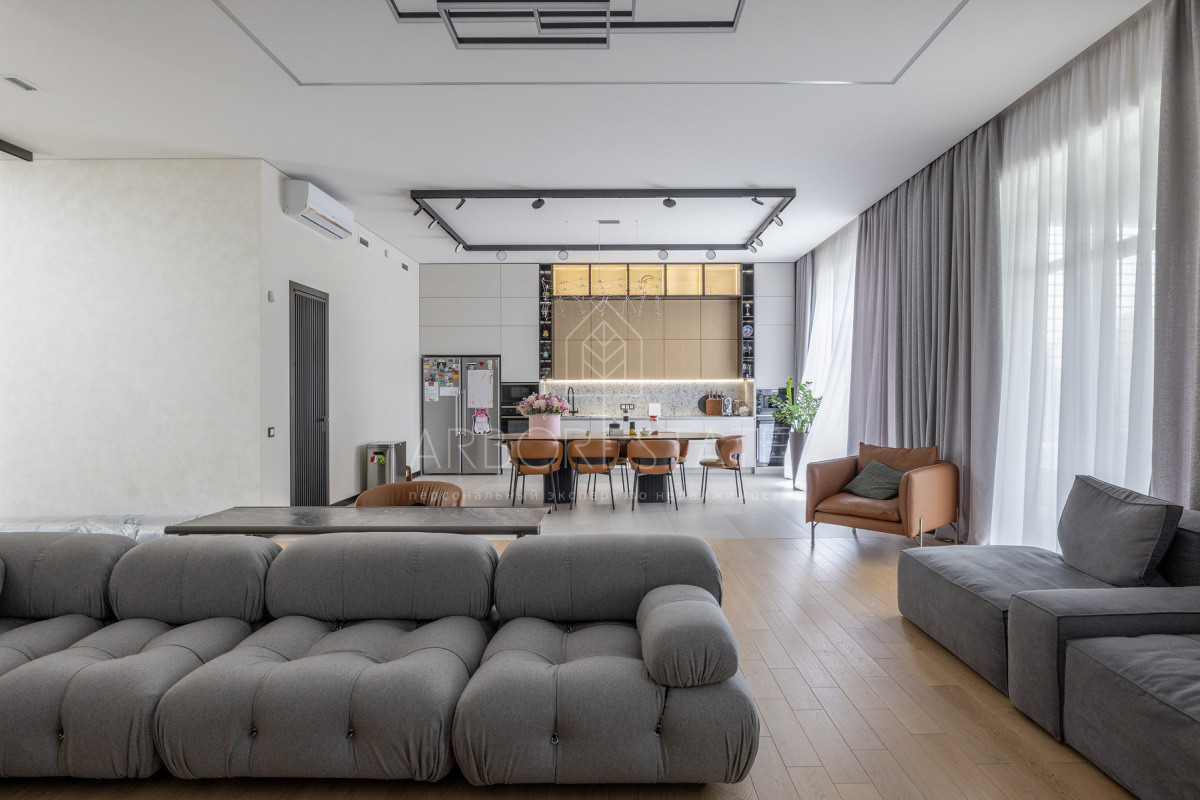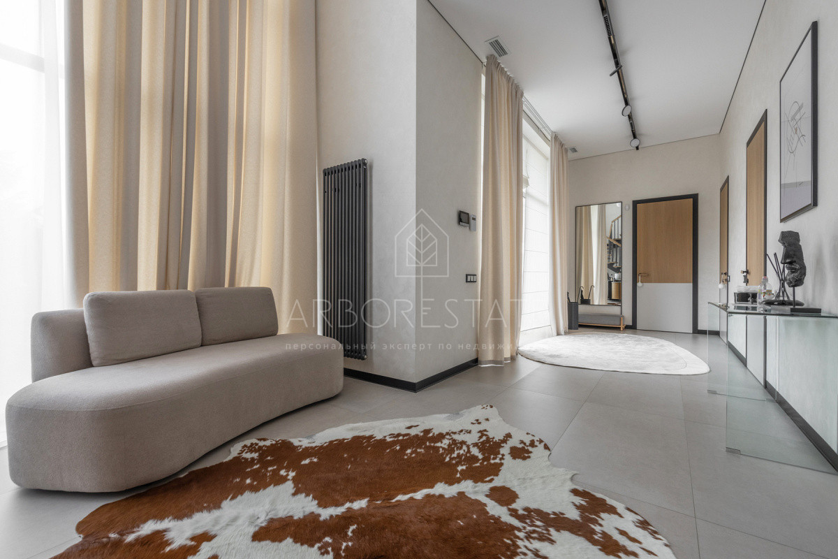 Архитектурной особенностью дома является второй свет в зоне лестницы с высотой потолков до 7 метров, что создает ощущение объема и наполненности пространства. Высота потолков на первом этаже составляет 3,8 метра.