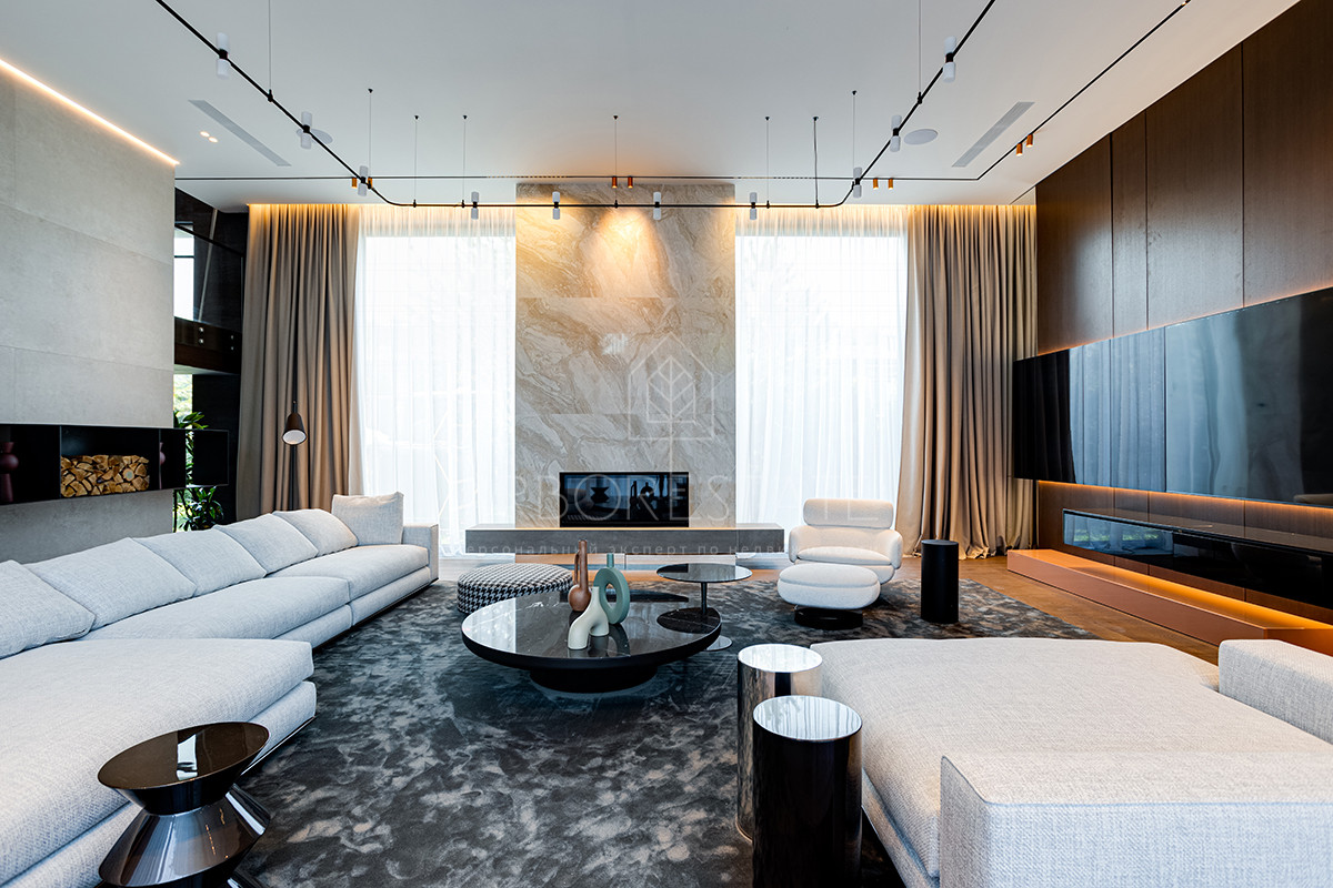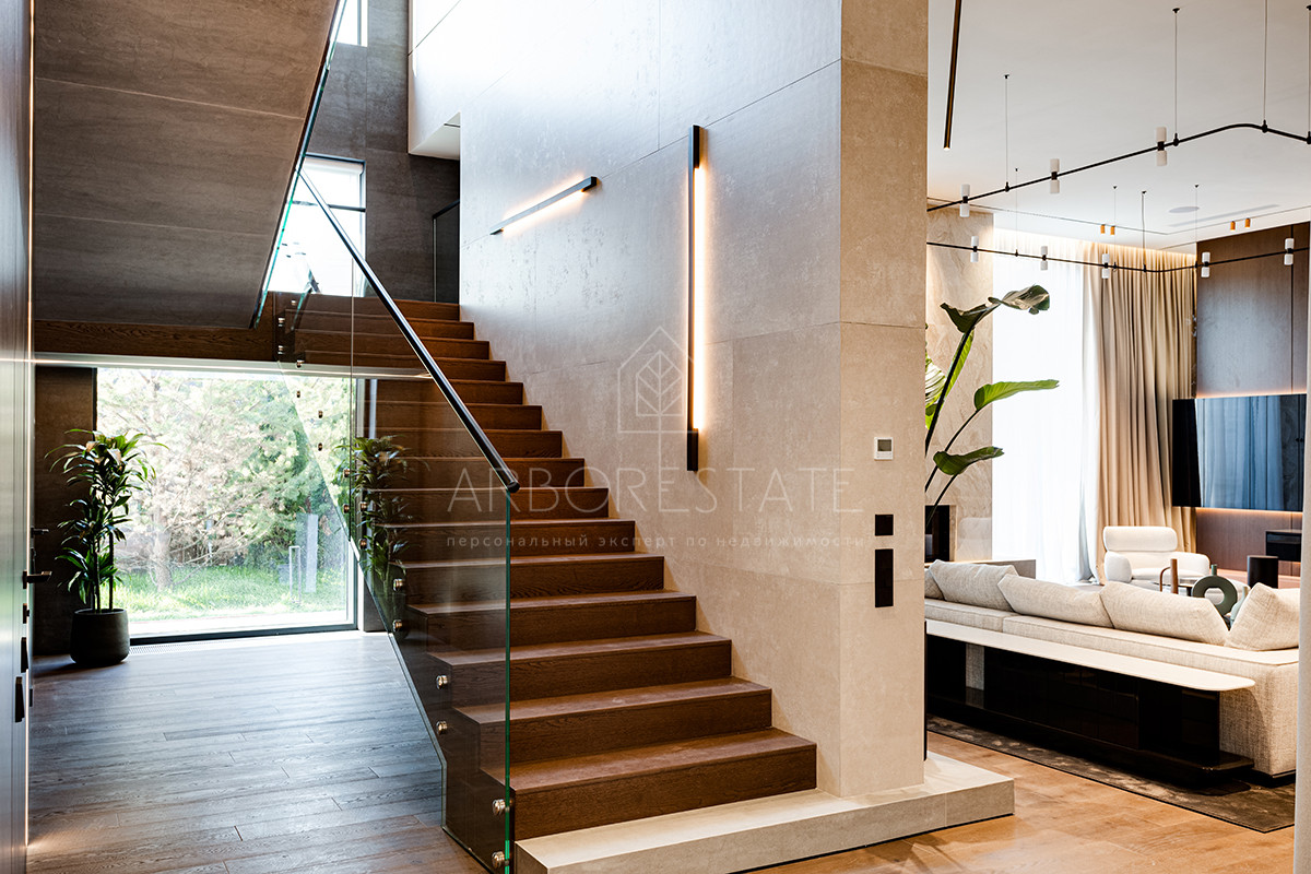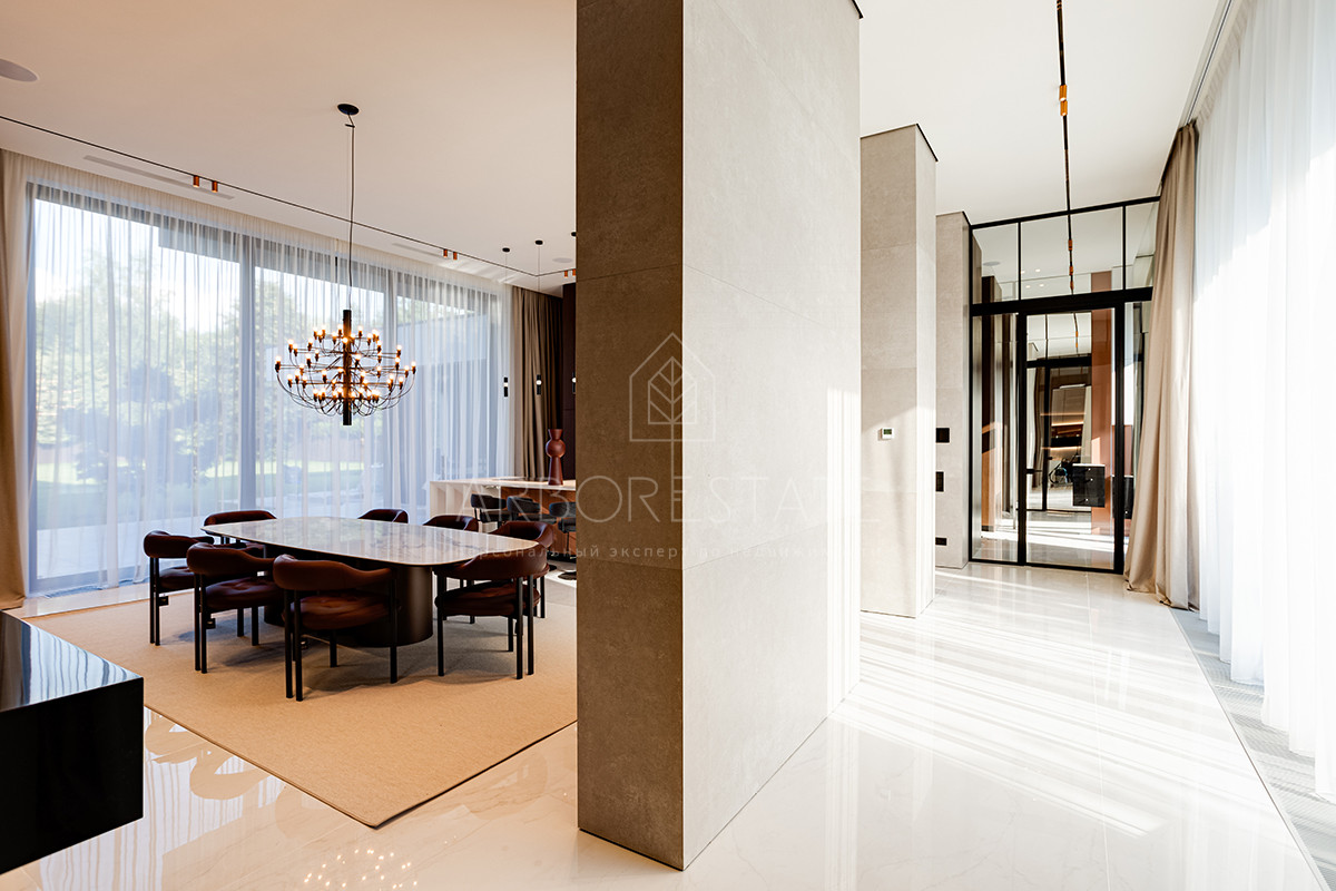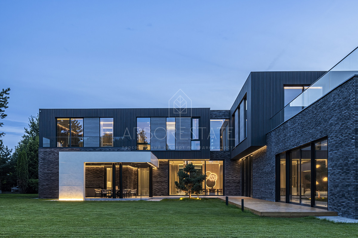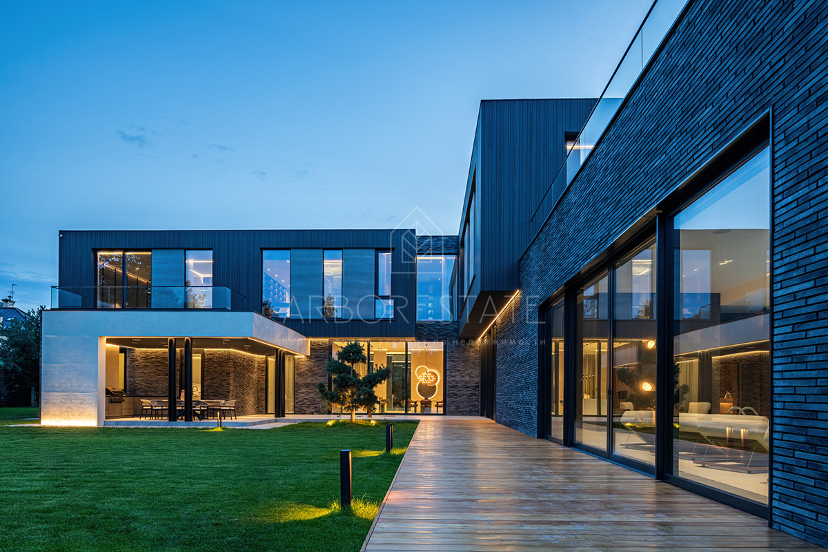 разделено на приватную, общественную, СПА зону и блок для персонала. В отделке фасадов применена крупноформатная керамика контрастных цветов и разноширокий термированный планкен. Большие площади остекления визуально связывают внутреннее пространство дома с улицей. Во внутренней отделке дома применены качественные отделочные материалы - инженерная доска FINEX, керамика LAMINAM, натуральный камень, столярные изделия и панели, двери UNION. Дом оборудован приточно-вытяжной системой с канальным кондиционированием воздуха. В котельной установлены котлы Viessman. Мебель - MINOTTI, POLIFORM, MERIDIANI, Cattelan Italia. Освещение - CENTRSVET, Flos, Vibia. Сантехника - HANSGROHE, Villeroy&Boch, Salini. Бытовая техника - Miele, ASKO.