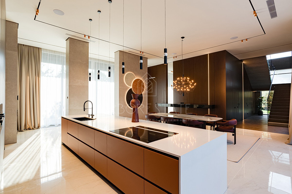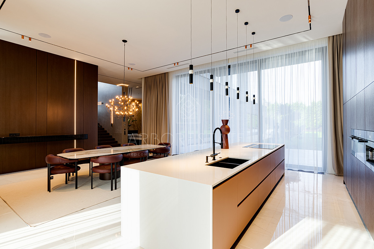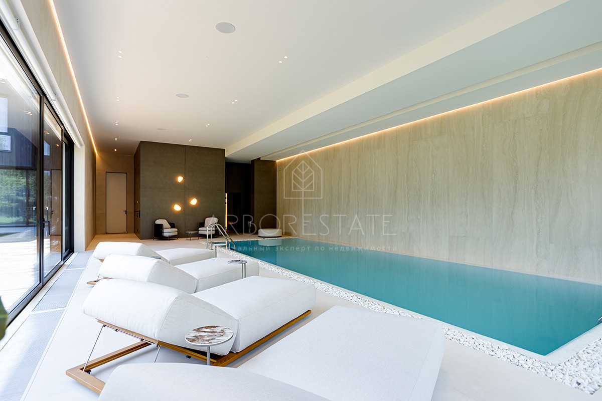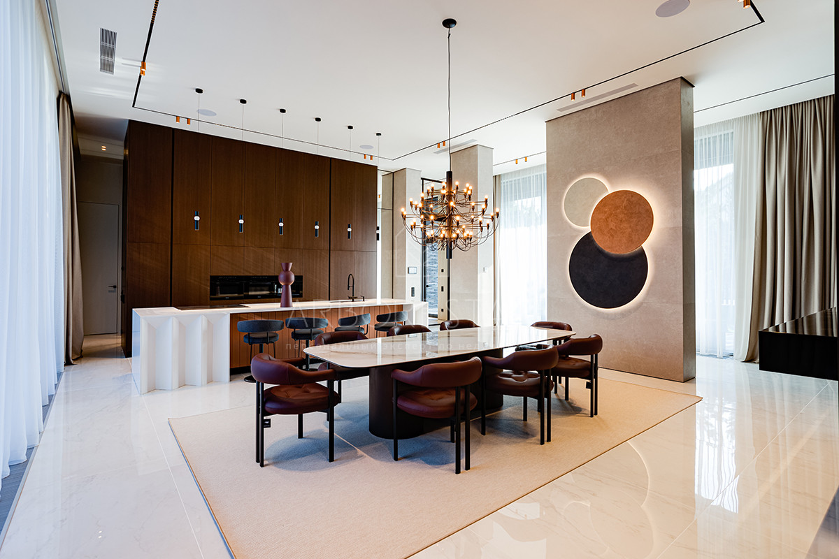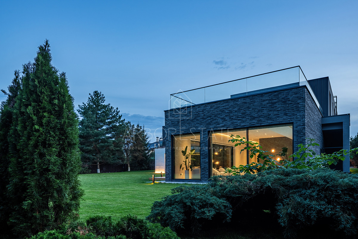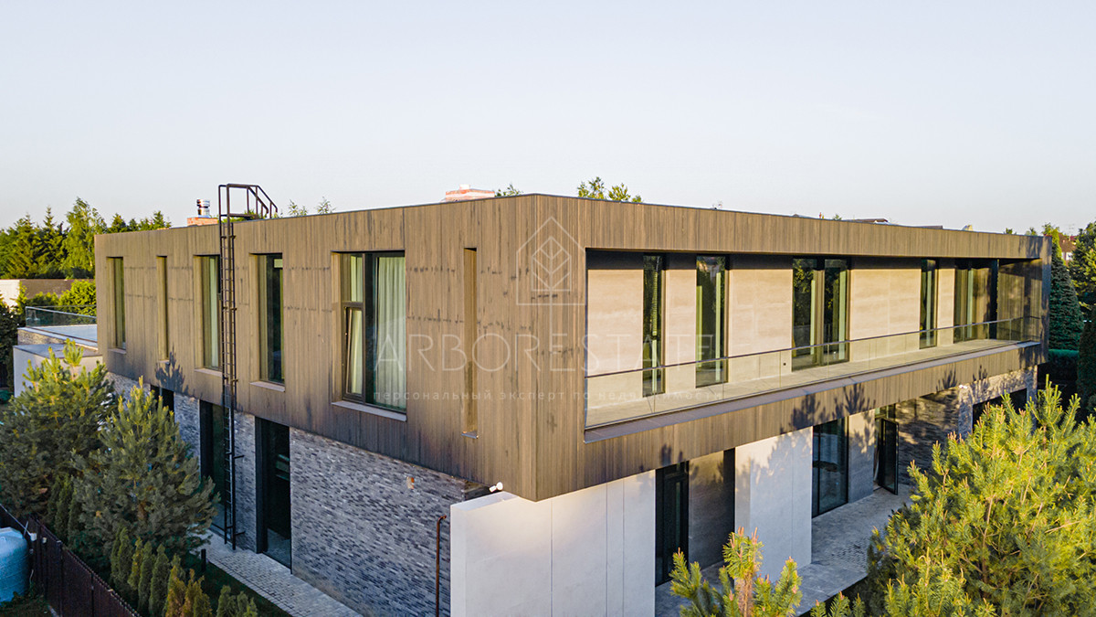 разделено на приватную, общественную, СПА зону и блок для персонала. В отделке фасадов применена крупноформатная керамика контрастных цветов и разноширокий термированный планкен. Большие площади остекления визуально связывают внутреннее пространство дома с улицей. Во внутренней отделке дома применены качественные отделочные материалы - инженерная доска FINEX, керамика LAMINAM, натуральный камень, столярные изделия и панели, двери UNION. Дом оборудован приточно-вытяжной системой с канальным кондиционированием воздуха. В котельной установлены котлы Viessman. Мебель - MINOTTI, POLIFORM, MERIDIANI, Cattelan Italia. Освещение - CENTRSVET, Flos, Vibia. Сантехника - HANSGROHE, Villeroy&Boch, Salini. Бытовая техника - Miele, ASKO.