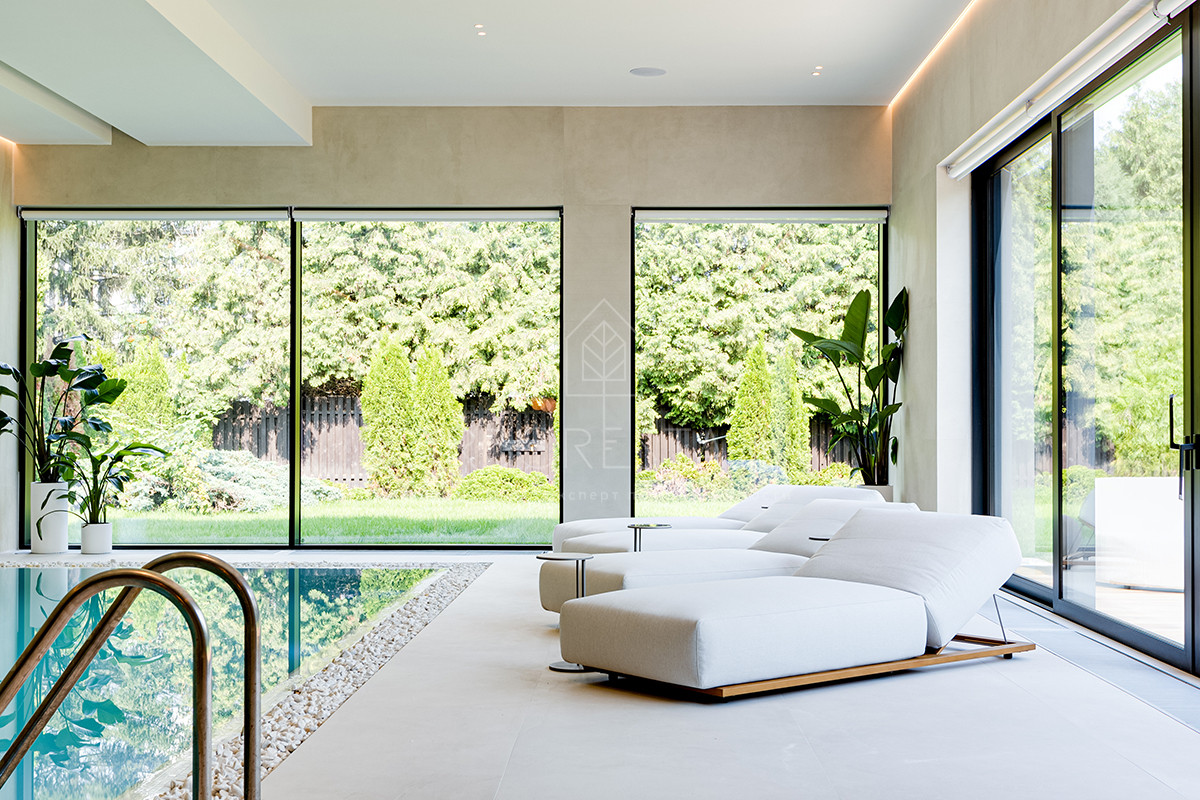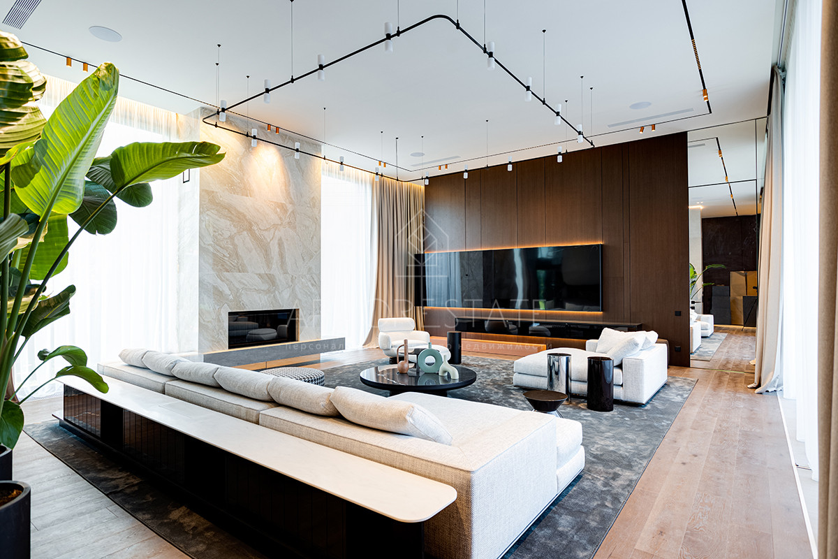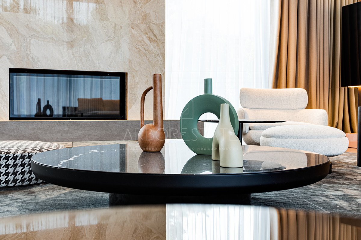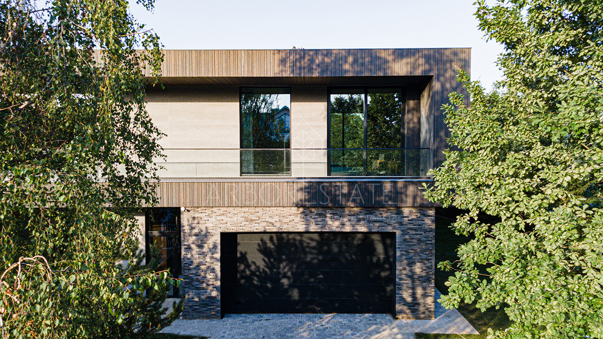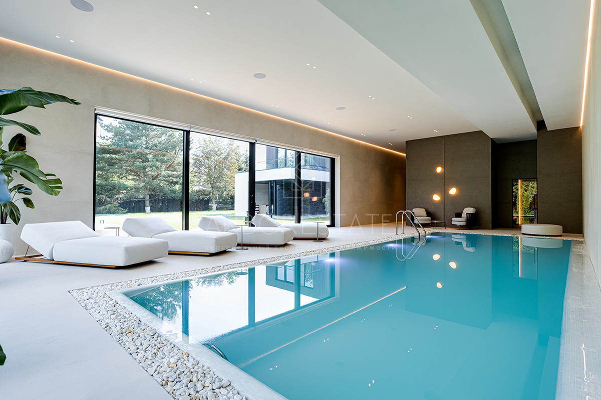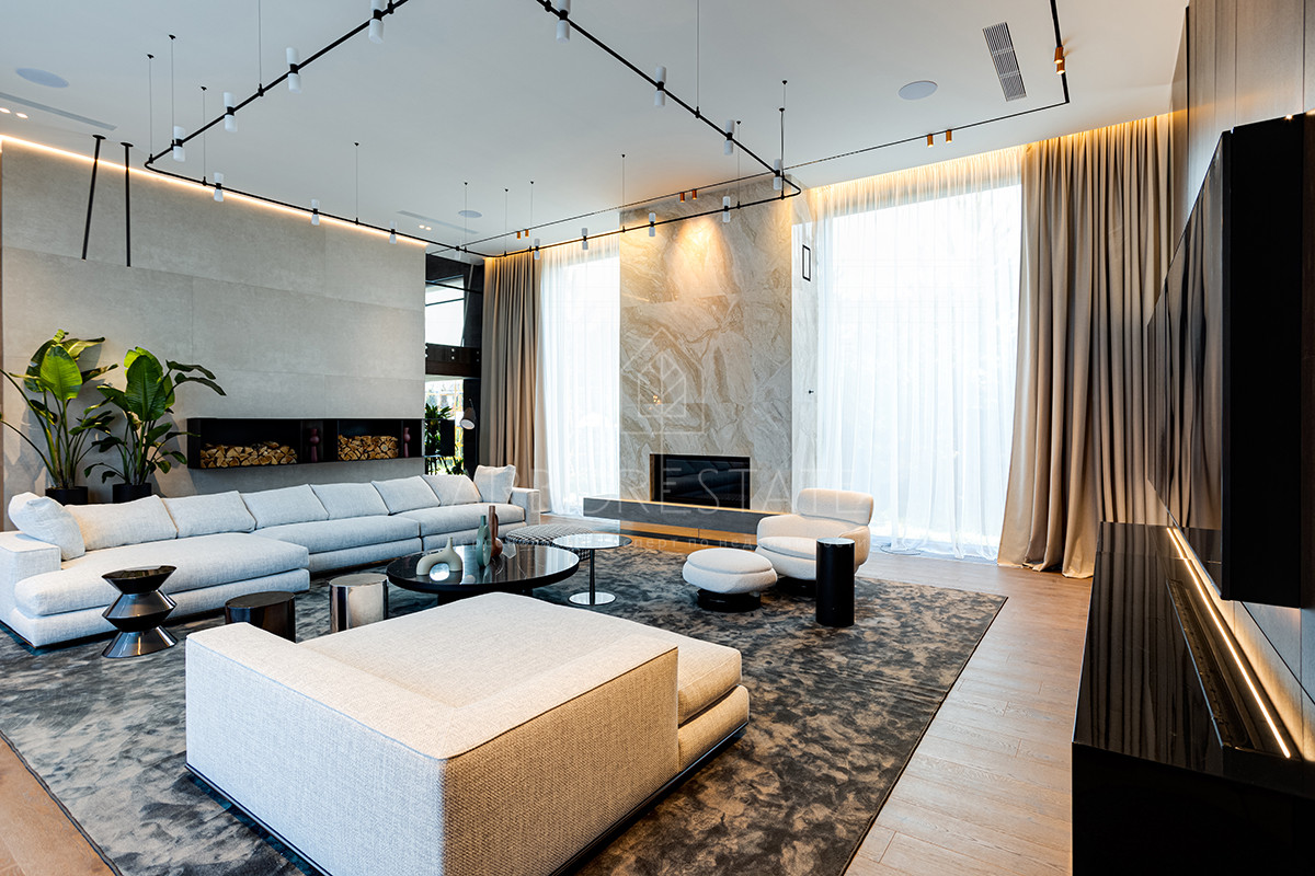 разделено на приватную, общественную, СПА зону и блок для персонала. В отделке фасадов применена крупноформатная керамика контрастных цветов и разноширокий термированный планкен. Большие площади остекления визуально связывают внутреннее пространство дома с улицей. Во внутренней отделке дома применены качественные отделочные материалы - инженерная доска FINEX, керамика LAMINAM, натуральный камень, столярные изделия и панели, двери UNION. Дом оборудован приточно-вытяжной системой с канальным кондиционированием воздуха. В котельной установлены котлы Viessman. Мебель - MINOTTI, POLIFORM, MERIDIANI, Cattelan Italia. Освещение - CENTRSVET, Flos, Vibia. Сантехника - HANSGROHE, Villeroy&Boch, Salini. Бытовая техника - Miele, ASKO.