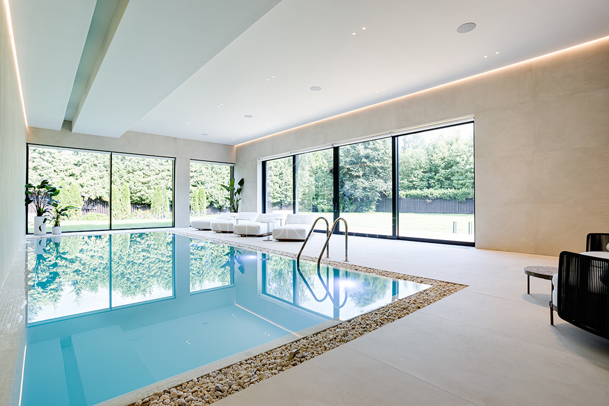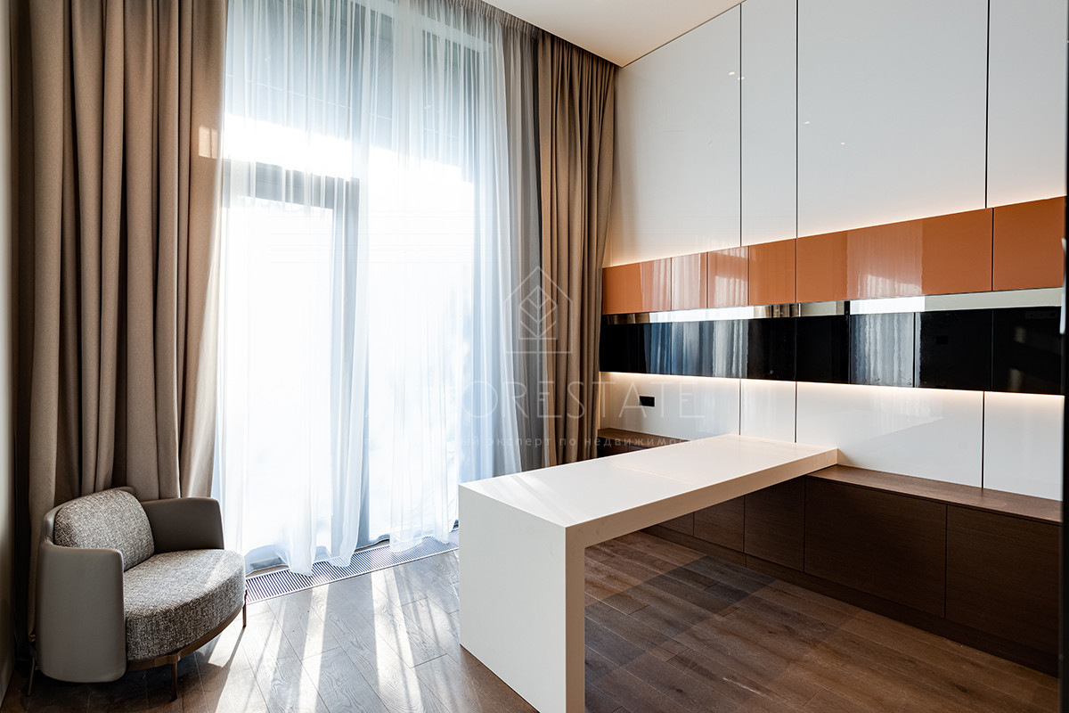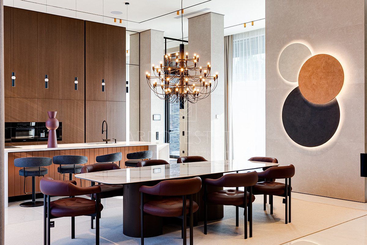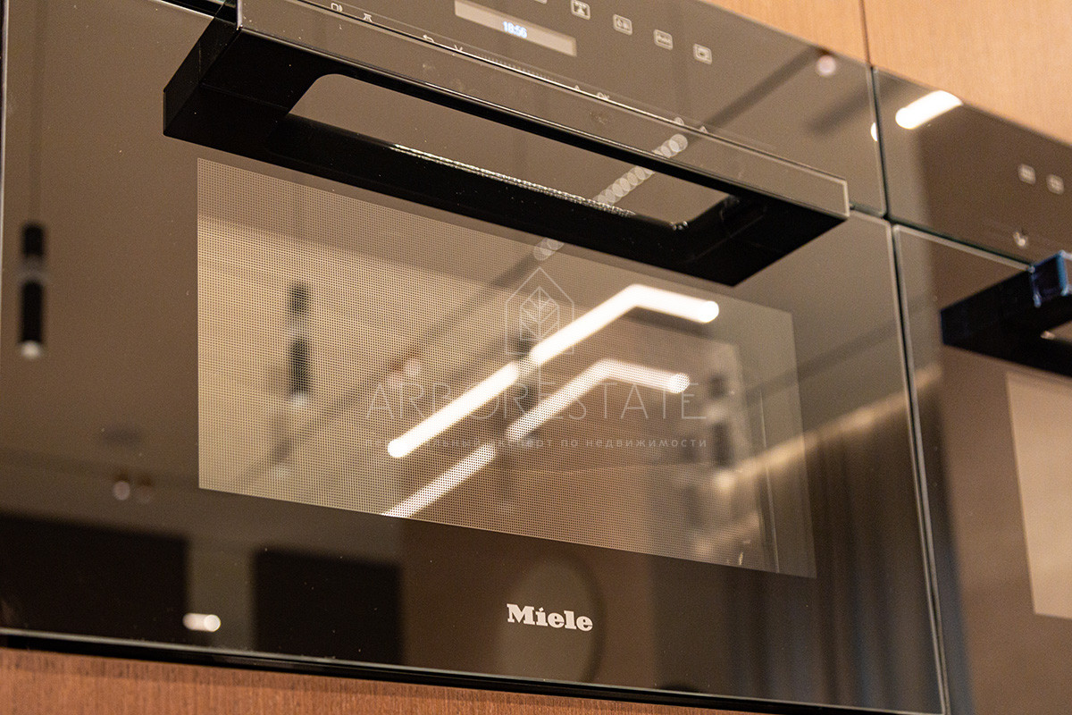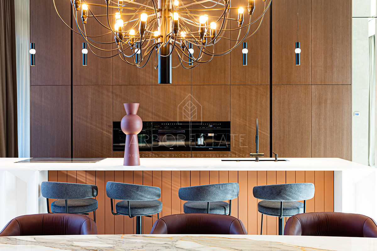 разделено на приватную, общественную, СПА зону и блок для персонала. В отделке фасадов применена крупноформатная керамика контрастных цветов и разноширокий термированный планкен. Большие площади остекления визуально связывают внутреннее пространство дома с улицей. Во внутренней отделке дома применены качественные отделочные материалы - инженерная доска FINEX, керамика LAMINAM, натуральный камень, столярные изделия и панели, двери UNION. Дом оборудован приточно-вытяжной системой с канальным кондиционированием воздуха. В котельной установлены котлы Viessman. Мебель - MINOTTI, POLIFORM, MERIDIANI, Cattelan Italia. Освещение - CENTRSVET, Flos, Vibia. Сантехника - HANSGROHE, Villeroy&Boch, Salini. Бытовая техника - Miele, ASKO.